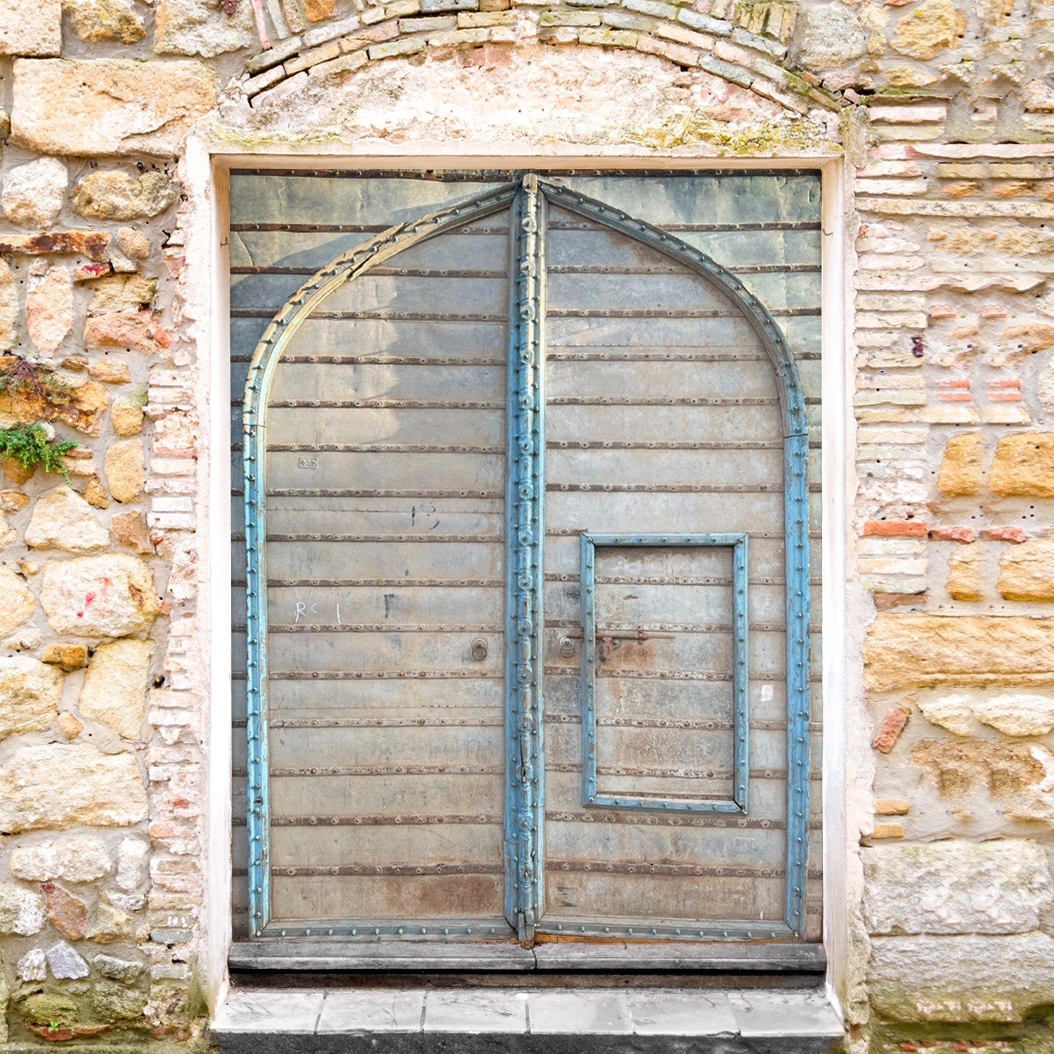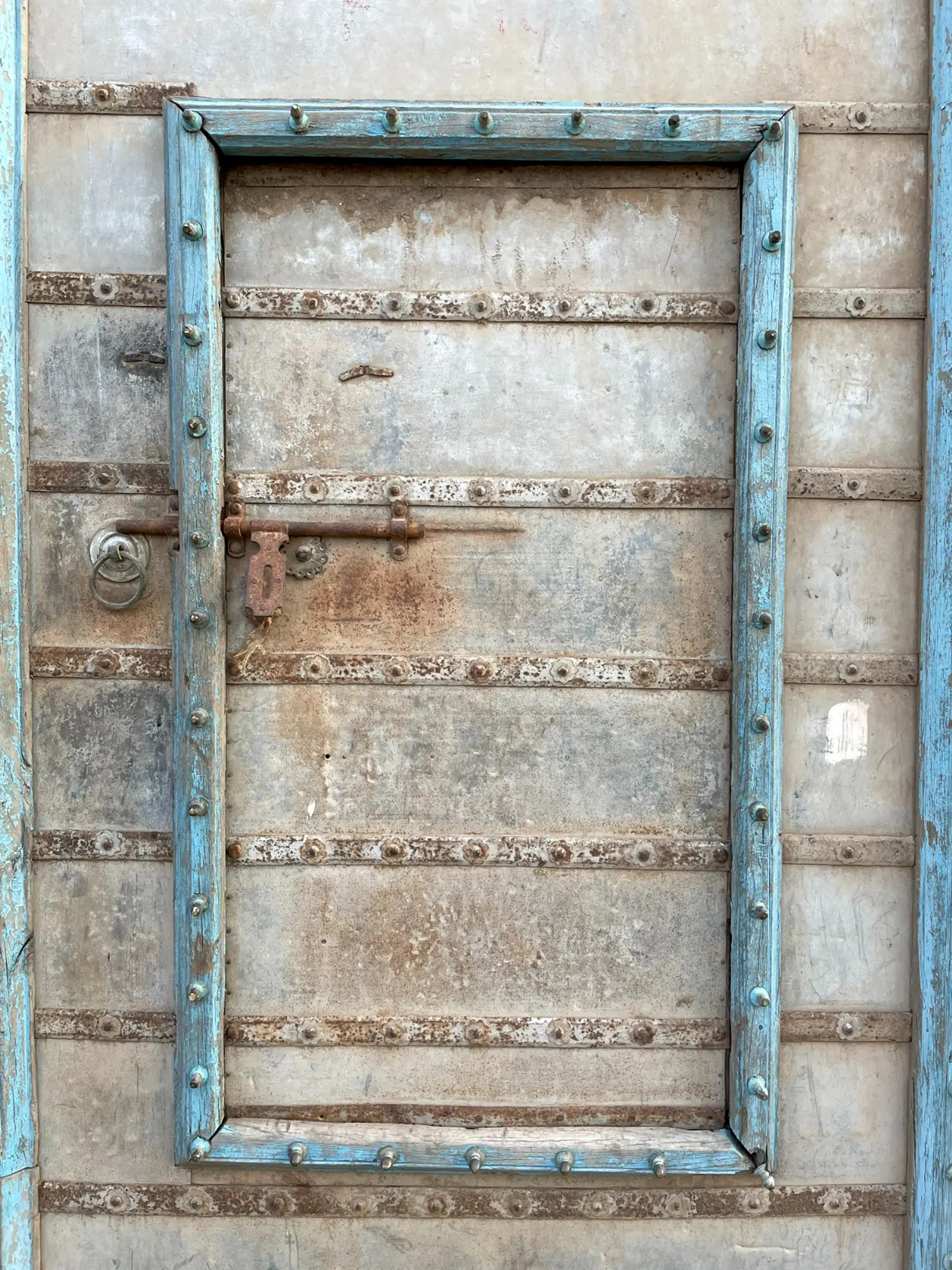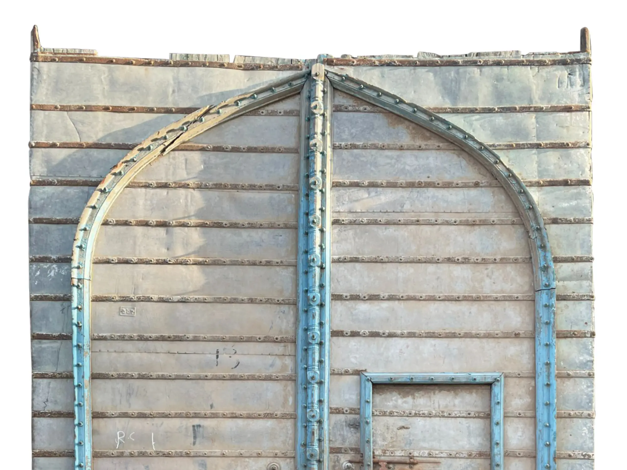 The majesty of this grand size of old wooden and metal sheet door is unimaginable. It captures the mind with the beautiful blend of wood and the soothing patina look of the metal sheet. The Moroccan blue tint relies upon the door's antique status. The panels of the door whisper an ancient mystery. Prominent lines with brass dots are made to save the door from external collision. There is a great arch containing two paneled doors and there is a small door on one side. The whole design of the door is a testament to the old Indian mansion heritage or Haveli architecture. When you enter through this live heritage door, you will be transported to another period.