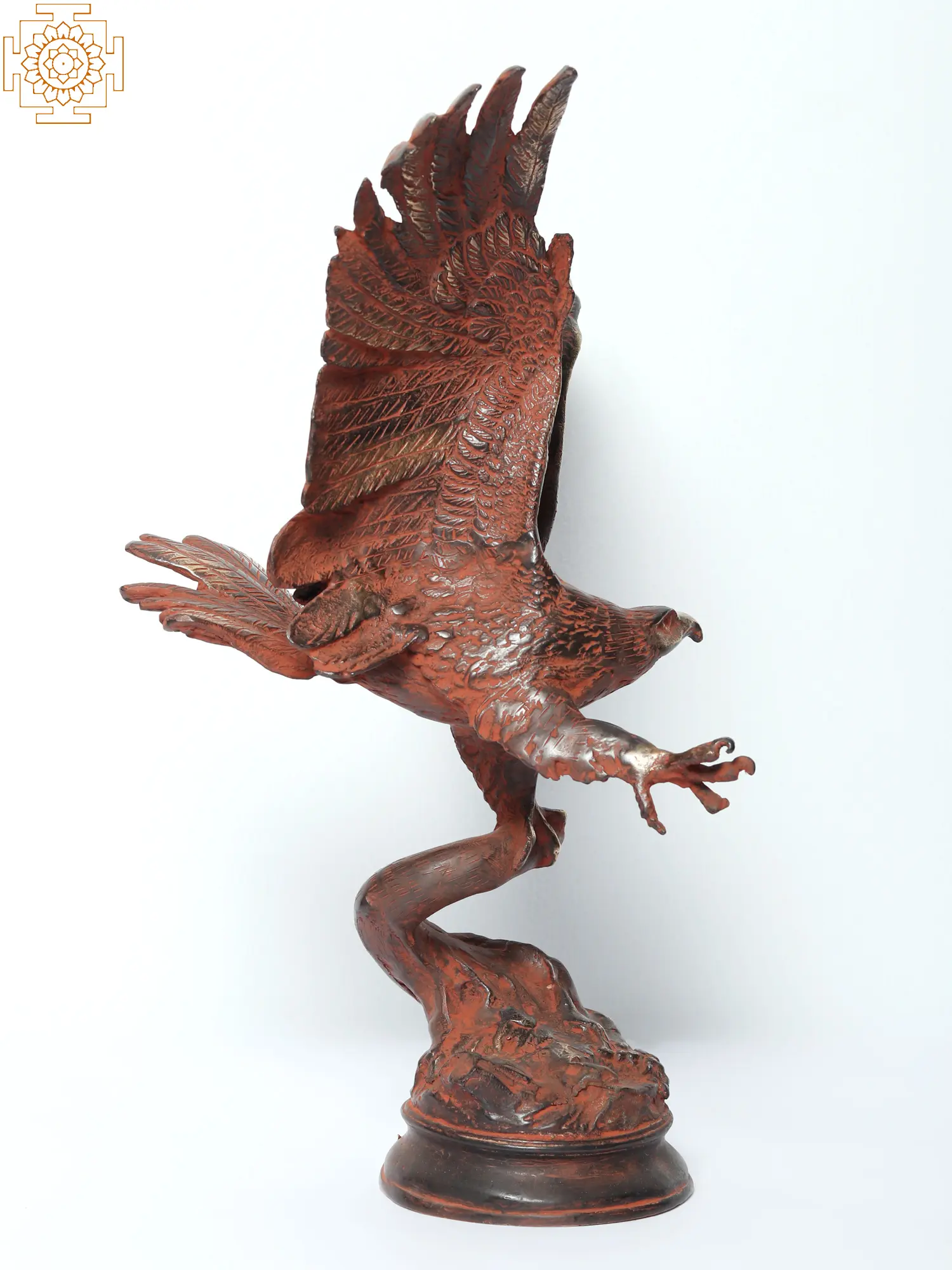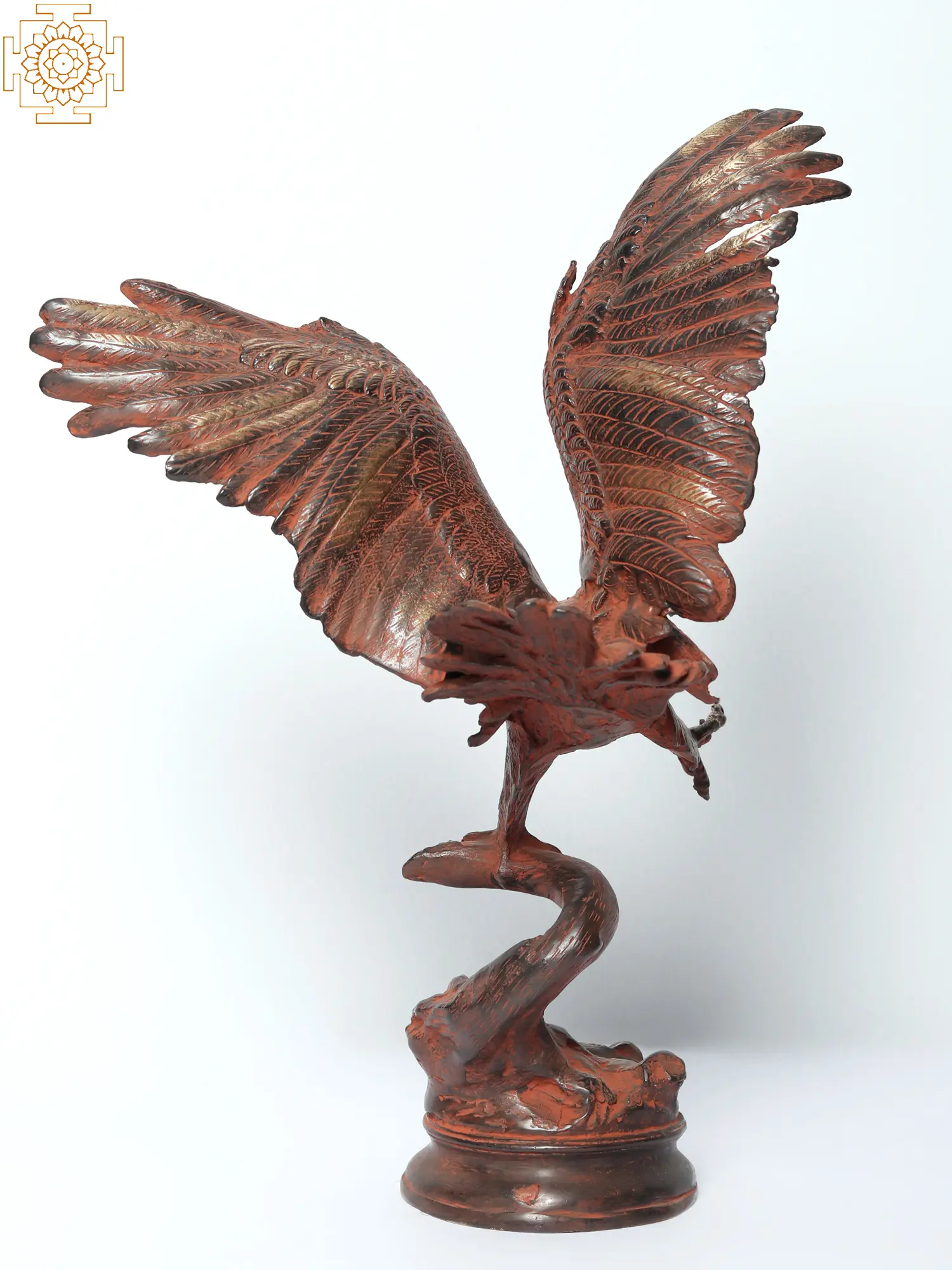 This brass Eagle statue with elaborately carved wings represents symbolises victory and the inherent power within. The eagle, poised to take flight, embodies the spirit of triumph and conquest. With one foot firmly planted on the branch of a tree and the other foot extended, the eagle symbolizes balance and adaptability in the face of challenges. The wings, spread wide open, depict the immense strength and determination with which the flight will be undertaken. This statue serves as a powerful reminder of the innate potential within individuals to soar above obstacles, embracing resilience, and harnessing personal power to achieve success and overcome adversity.
