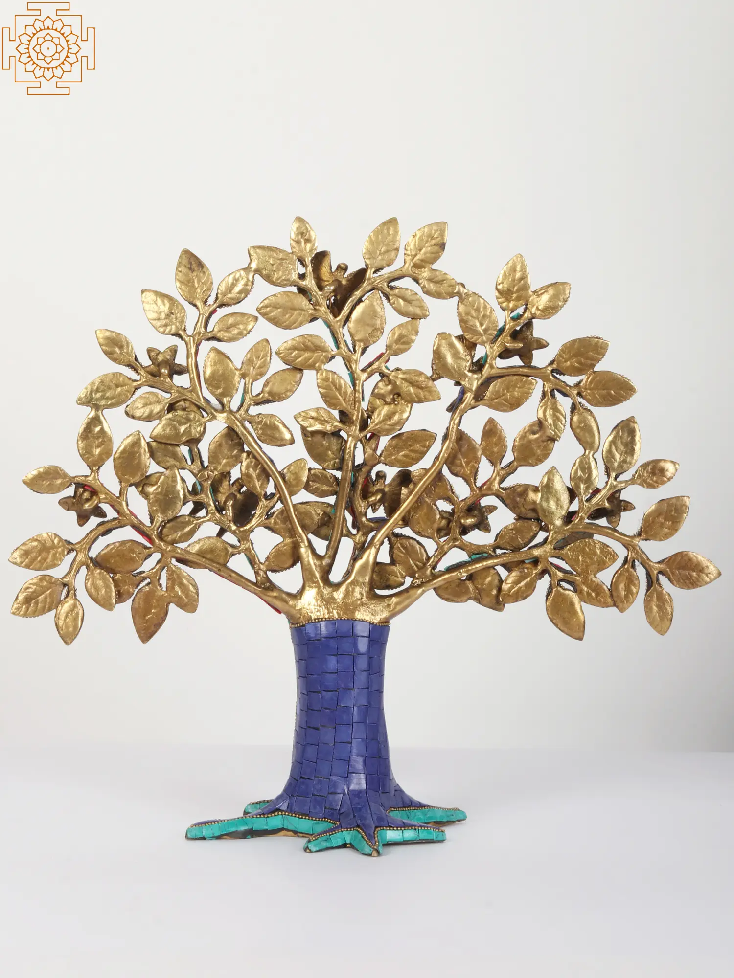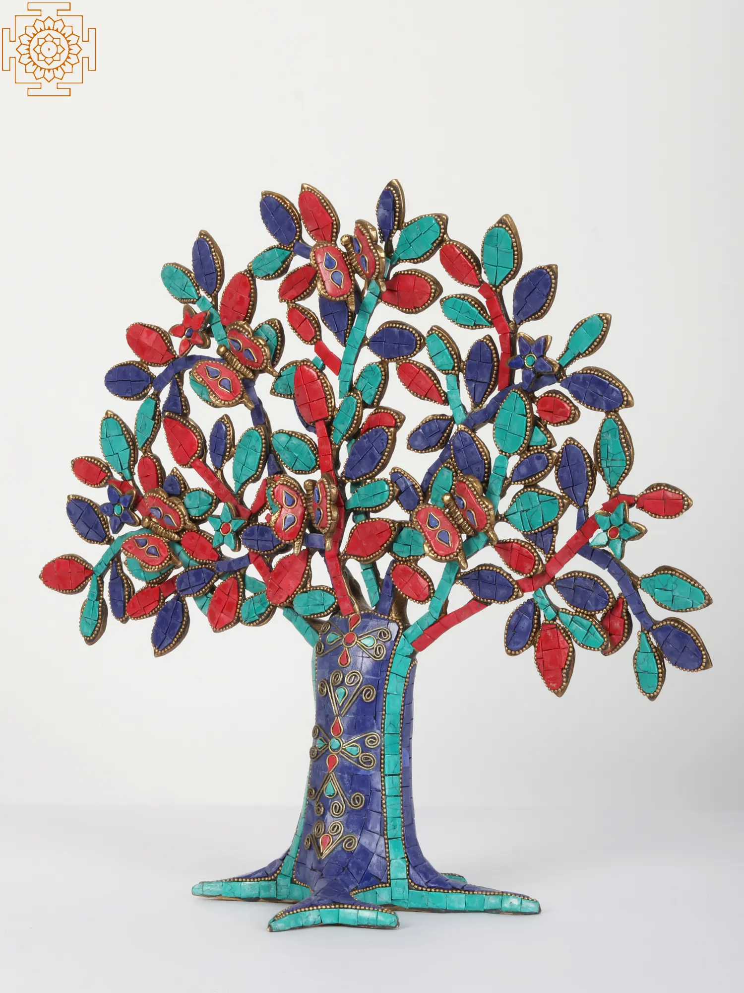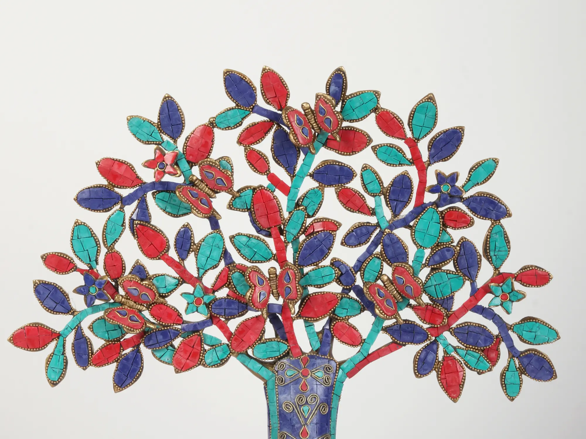 Bring a touch of exquisite artistry and symbolic meaning to your home with this stunning 15" Brass Tree of Life. Handcrafted with meticulous detail, this decorative piece is a captivating blend of traditional craftsmanship and modern aesthetics. The vibrant inlay work, featuring a rich palette of blues, reds, and greens, creates a mesmerizing visual effect. This is more than just décor; it’s a statement piece that will spark conversations and elevate the ambiance of any room. Each leaf, meticulously inlaid with semi-precious stones, shimmers with an enchanting glow, while the delicate butterflies add a touch of whimsical charm.