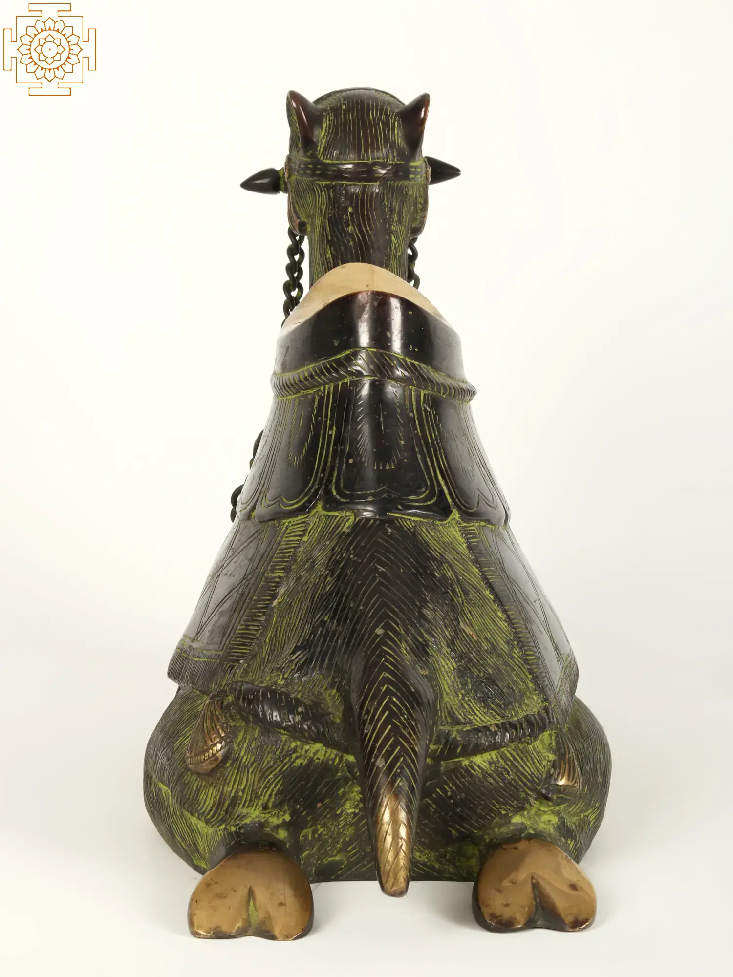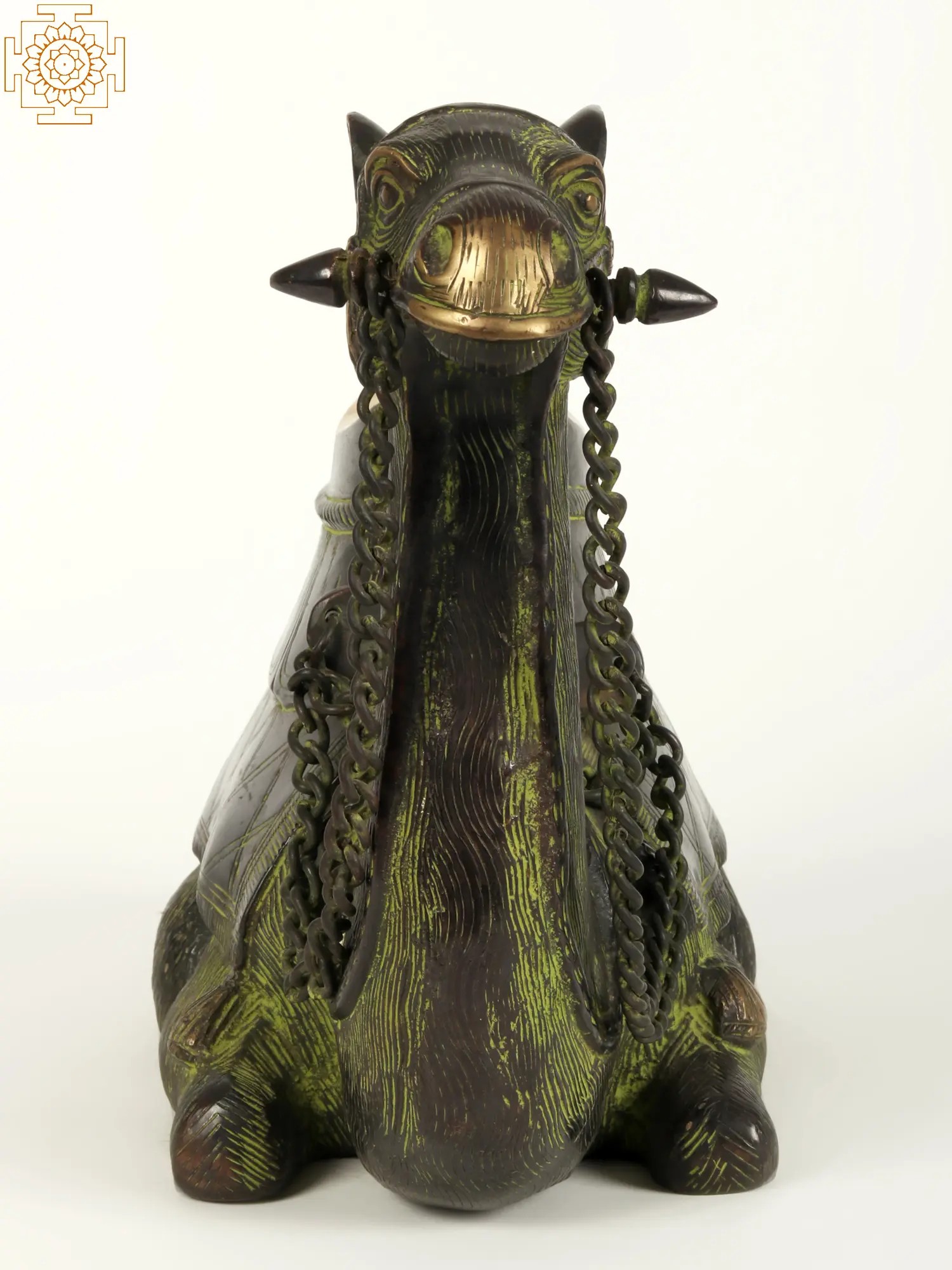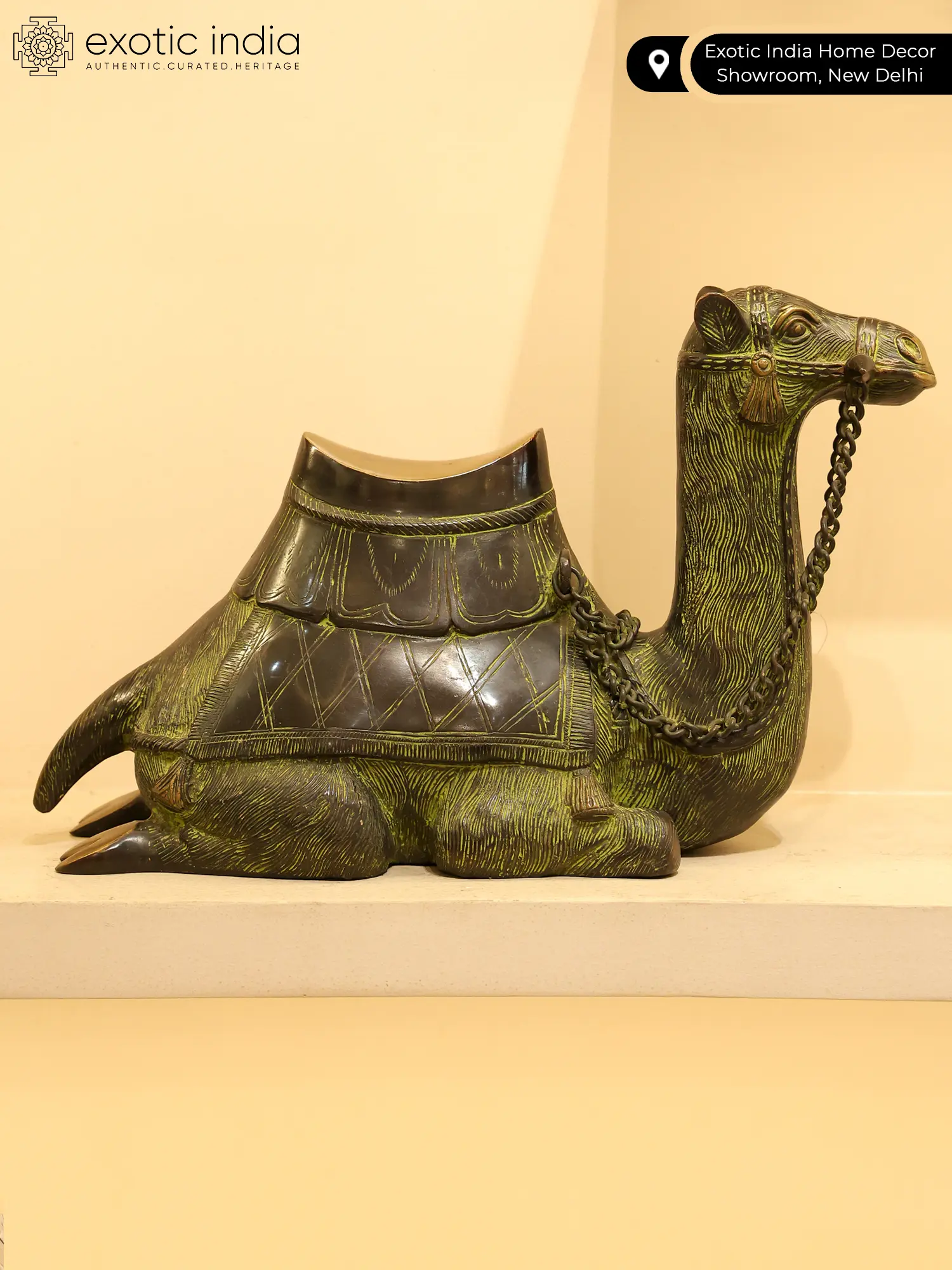 Camels have been long associated with adventure due to their role as vehicles for wanderers. Stories of treasure hunts often involve the protagonist riding a camel. This Brass Statue is a tribute to that image of a camel. In this statue, elegance meets tradition, presenting a captivating embodiment of cultural richness. The camel, adorned in a lustrous green patina, emanates an antique allure, echoing tales of desert journeys.