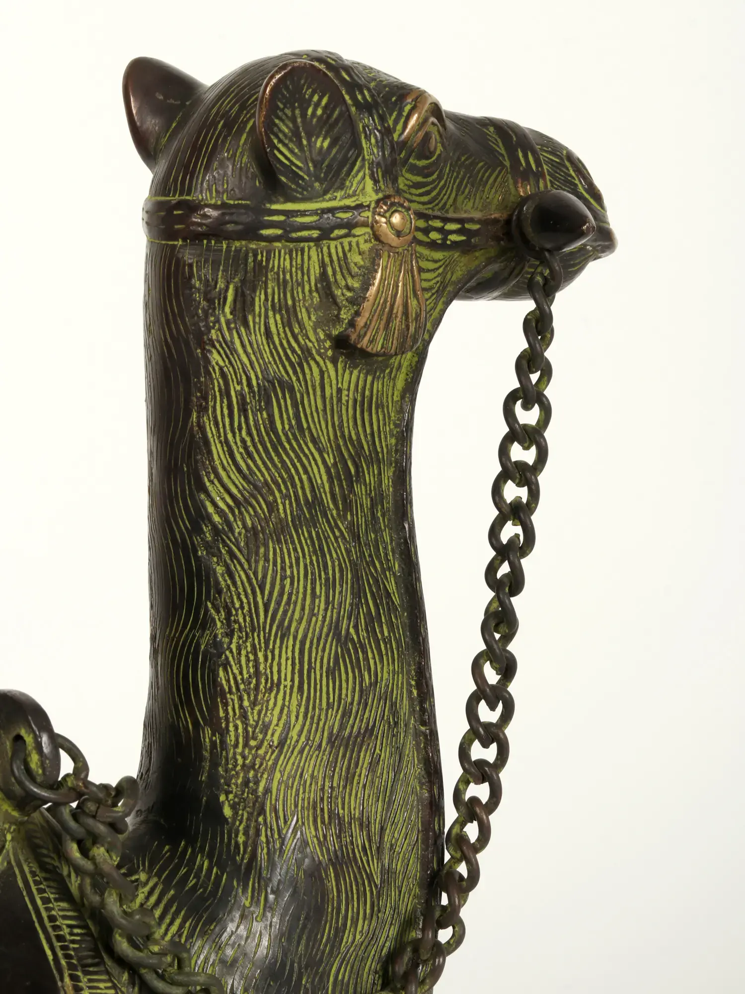 Notably, chains drape gracefully from the camel's mouth to the saddle, enhancing its mystique. This detail not only adds an ornamental touch but also evokes the spirit of nomadic heritage. The statue, a harmonious marriage of artistry and symbolism, invites contemplation on the camel's role as a steadfast companion in arid landscapes, making it a timeless and culturally resonant piece for any decor.