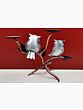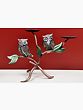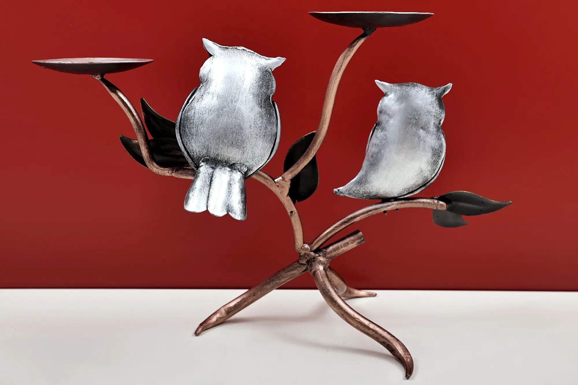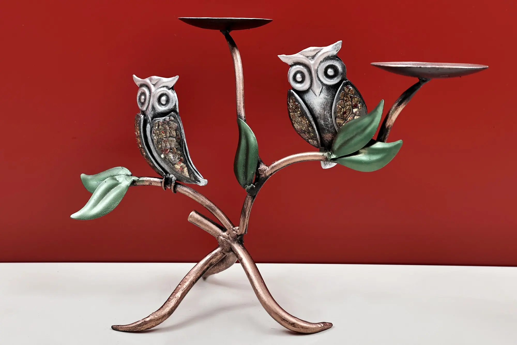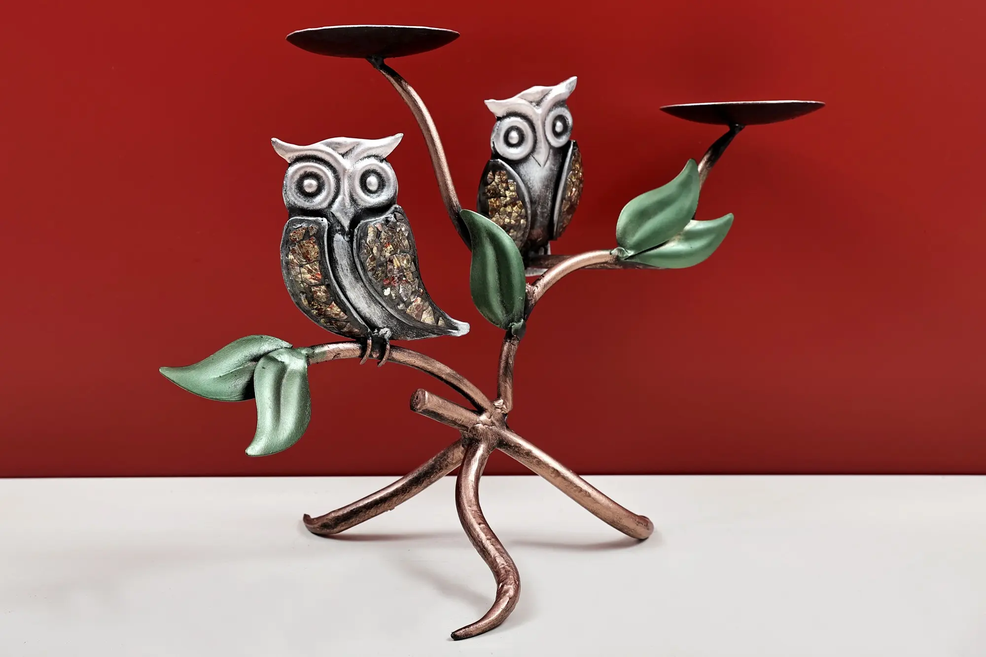 The design features two delightful owls perched gracefully on a branch, evoking a sense of natural wonder and serenity. The intricate detailing of the owls, from their wide, observant eyes to the textured patterns on their bodies, showcases the skill and artistry of the craftspeople who created it. The addition of delicate leaves further enhances the nature-inspired theme, creating a cohesive and visually appealing aesthetic. Place your favorite candles in the provided holders and watch as the soft glow dances through the intricate design, casting mesmerizing shadows and creating a cozy ambiance.