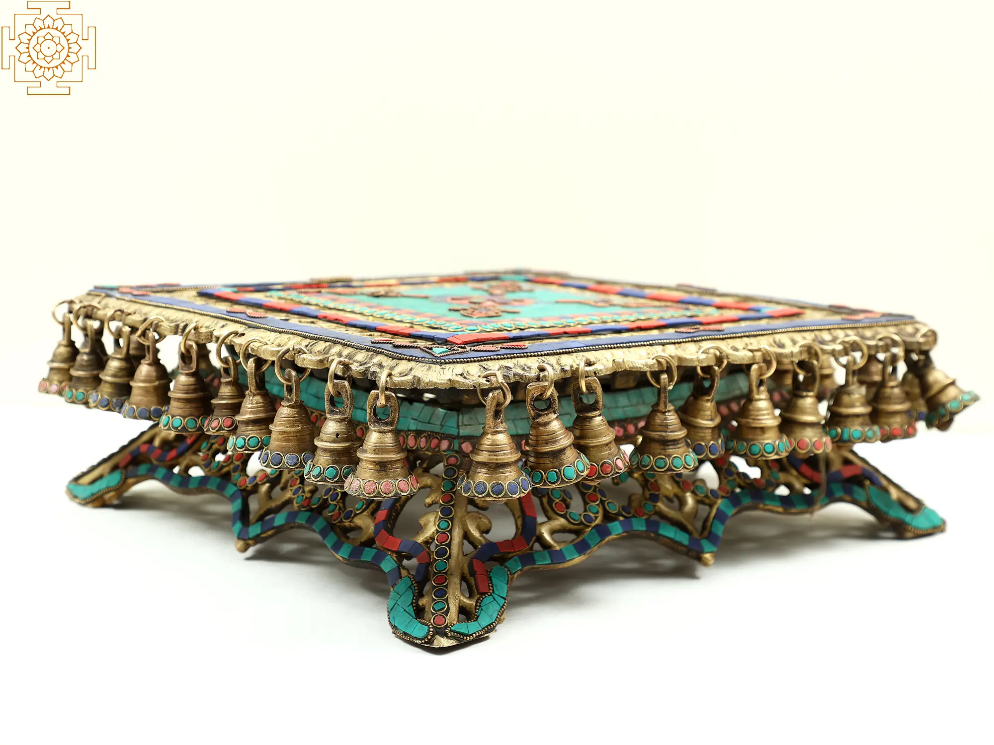 The stunning chowki standing on designer short, sturdy legs. Attractive, medium-sized ghungroos hanging on all sides must be creating a melodious musical sound on movement. A wonderful fascination for your home.