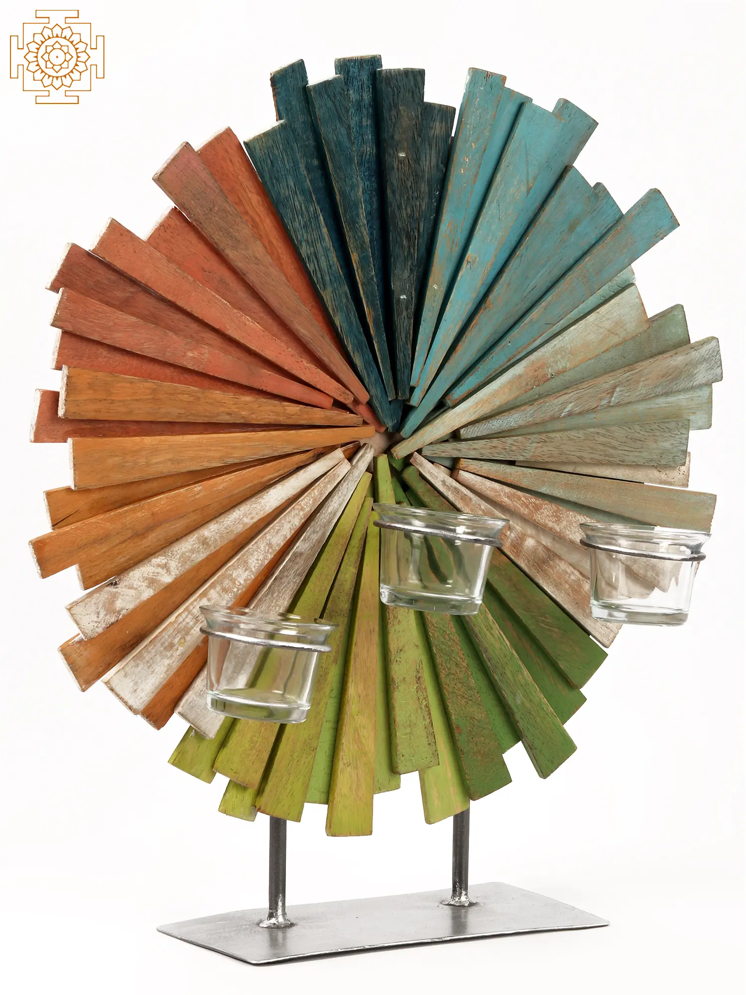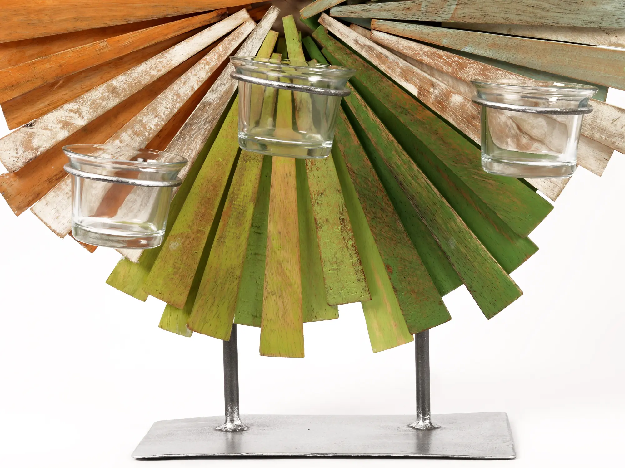 Versatile and functional, this artwork adds a touch of allure to any room, be it a cosy corner or a lavish dining setting. This gorgeous creation, which is made from a harmonic combination of iron and wood, has three candle glasses that have been gently attached and are all radiating charm and warmth. Beyond only being aesthetically beautiful, this home decor represents peace and welcomes relaxation into your living area. Give your nights an opulent glow with the flickering flames dancing elegantly against the vibrant background.