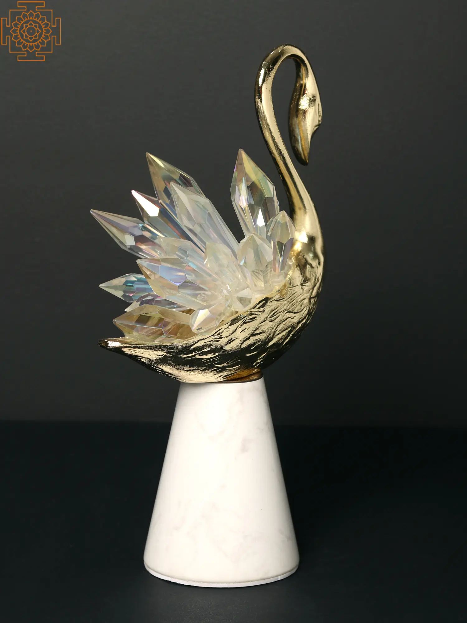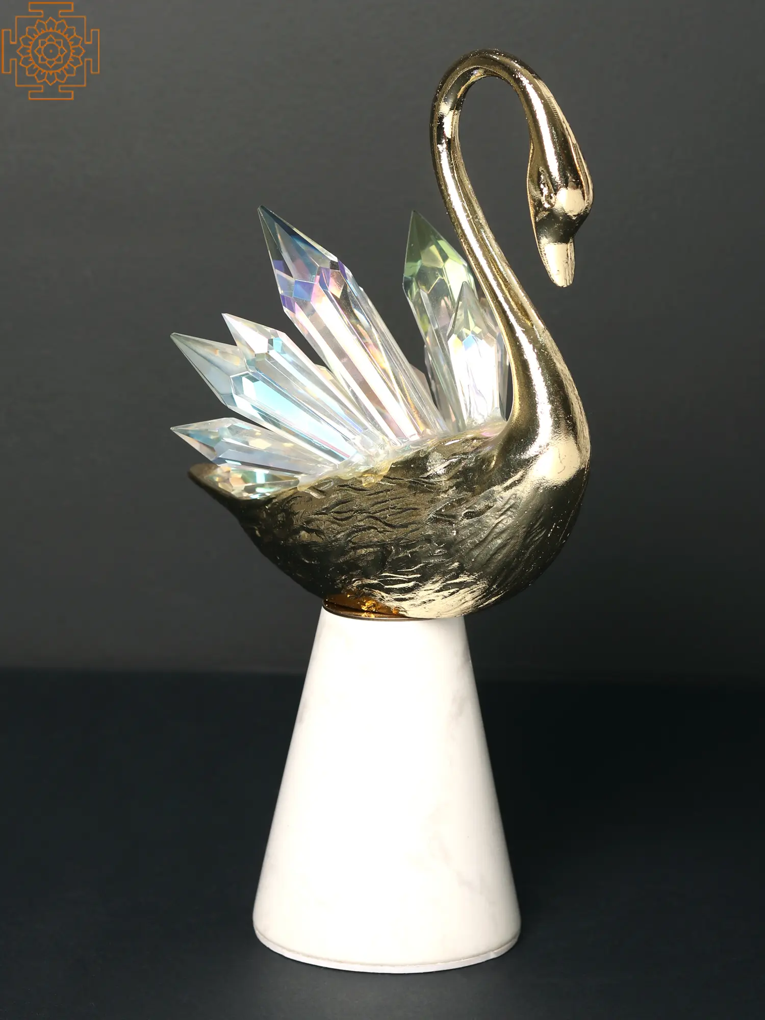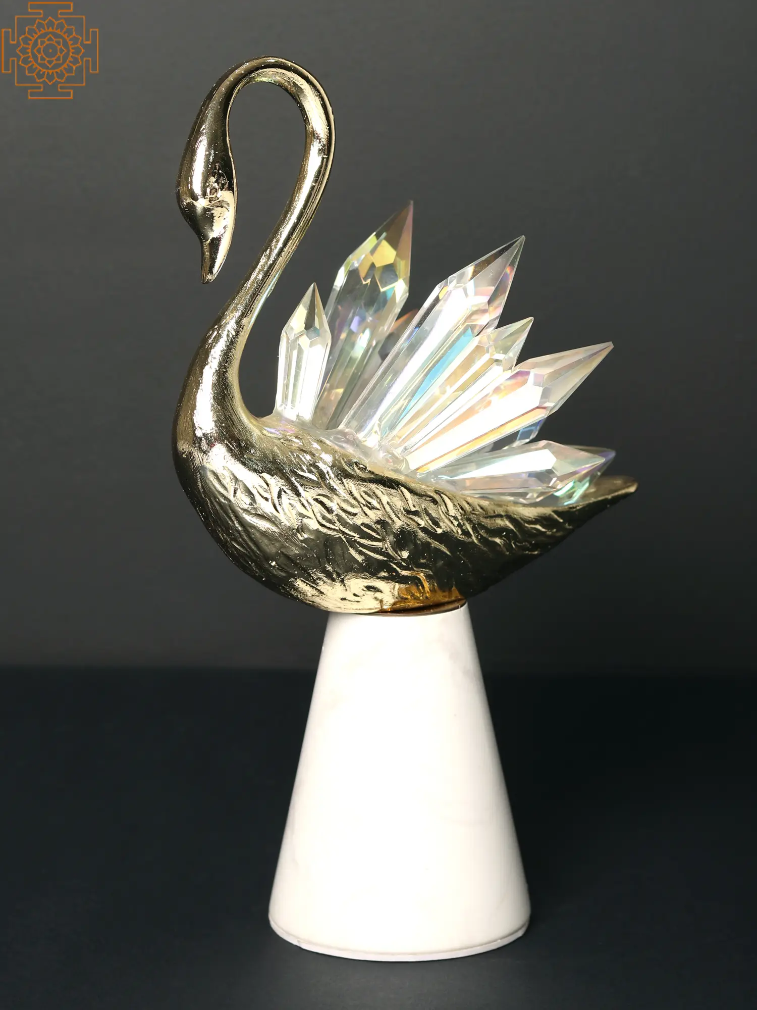 This charming table setting features a pair of swans, the messenger in the eternal love story between King Nala and the lovely Princess Damayanti. The swans are created using a stunning blend of brass and glass crystals. The sculpture is then made even more appealing by having the individual swans stand on gorgeous platforms of white marble. The pair of swans, which serve as a sign of purity in life, are created with such skill and creativity that their necks resemble a stream of pouring molten gold. When exposed to light, the crystal wings sparkle and provide a kaleidoscope of color.