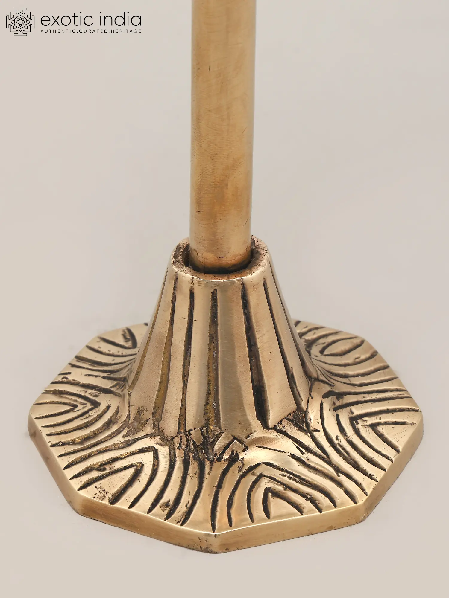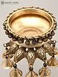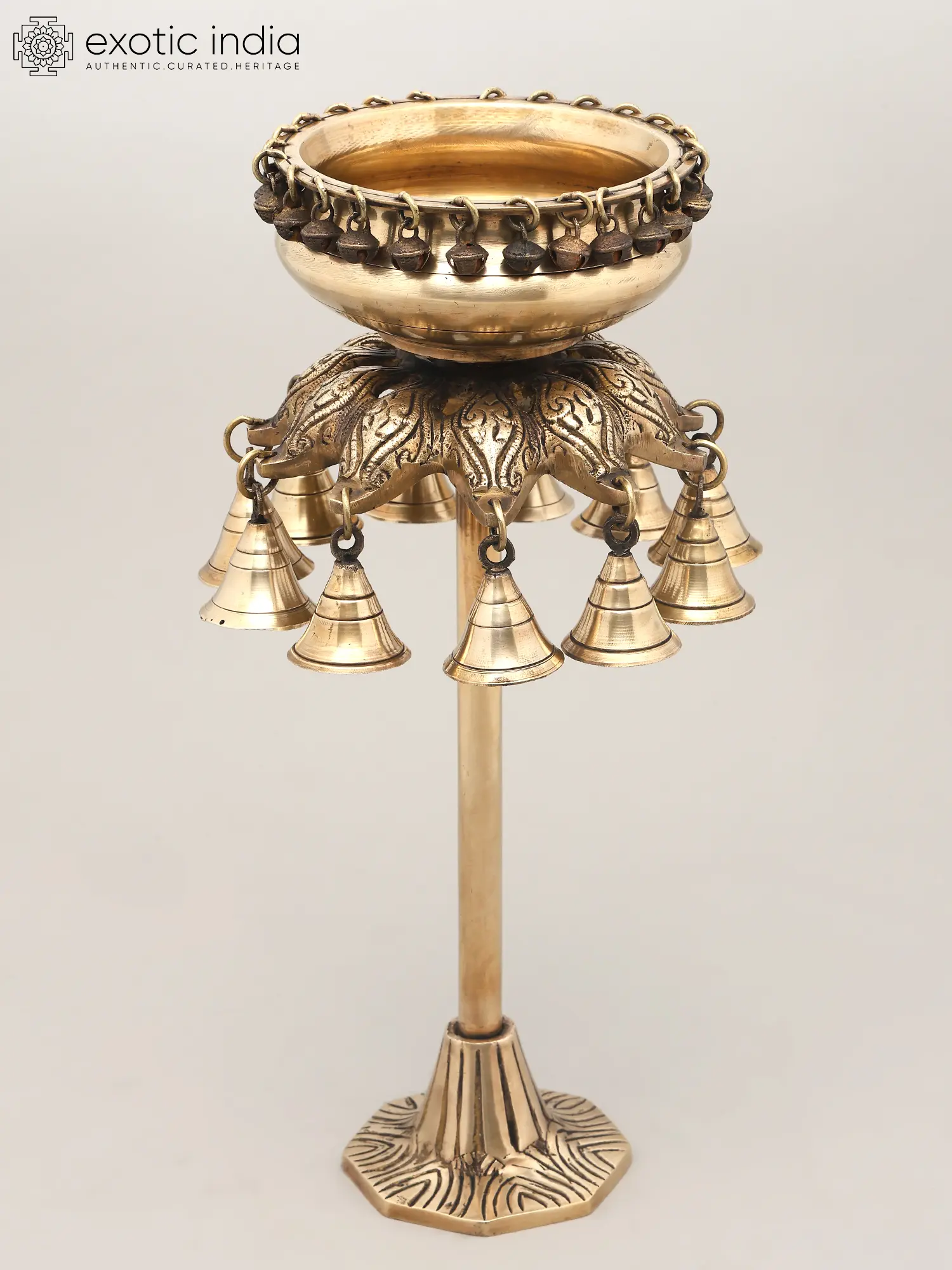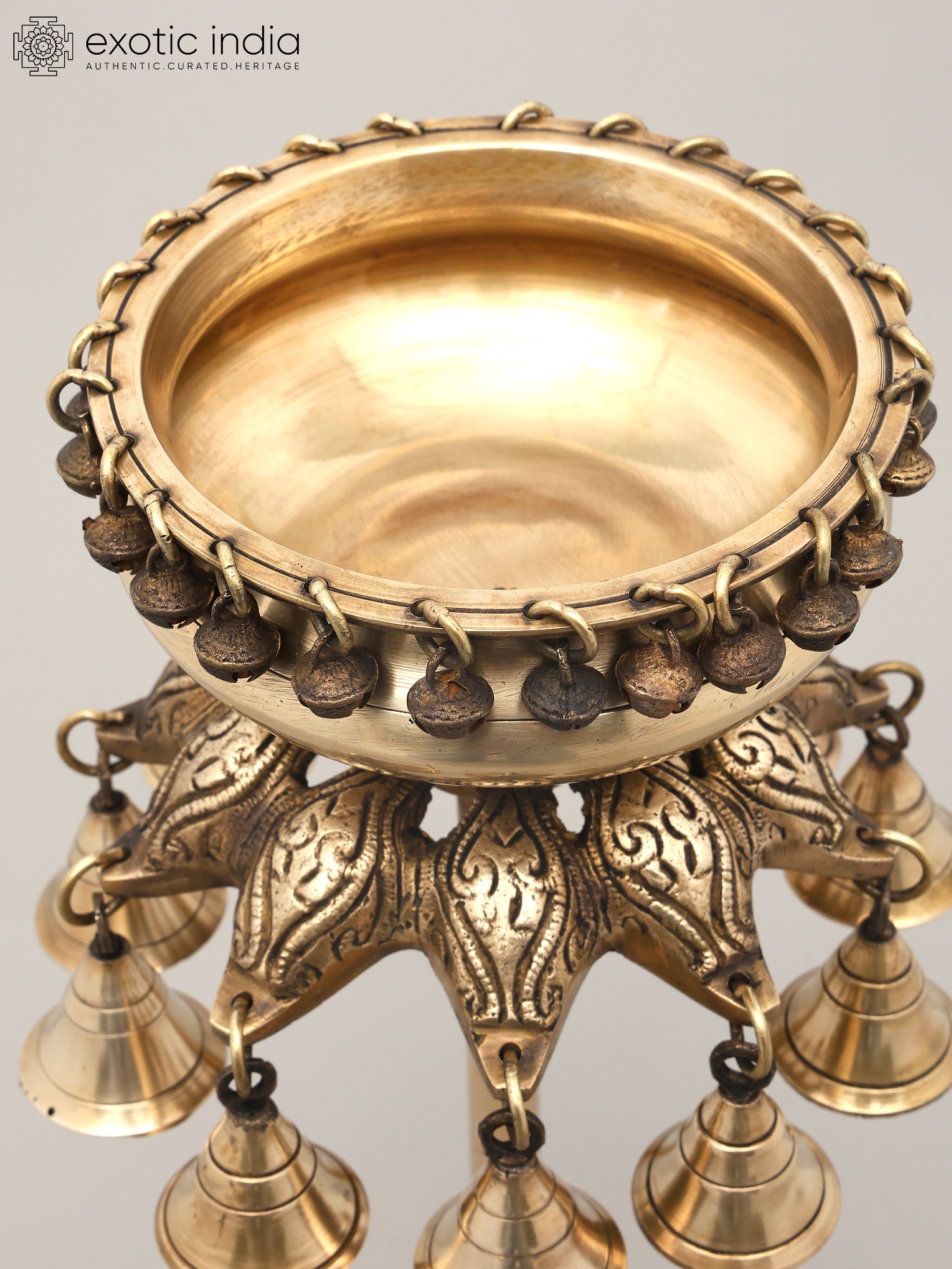 What truly sets this piece apart is the exquisite ornamentation. The bowl is embellished with tiny bells that dangle delicately. Below the bowl, the stand features a meticulously crafted design, shaped like stylized lotus petals, each adorned with fine carvings. Additional hanging bells are suspended from this section, creating a gentle and melodious chime with the slightest movement. The base of the stand echoes the attention to detail, with a textured surface that not only provides stability but also enhances the overall visual appeal. The brass construction ensures durability and longevity, allowing you to enjoy this piece for years to come. The golden hue of the brass lends itself well to both traditional and contemporary decor styles, making it a versatile addition to any home.