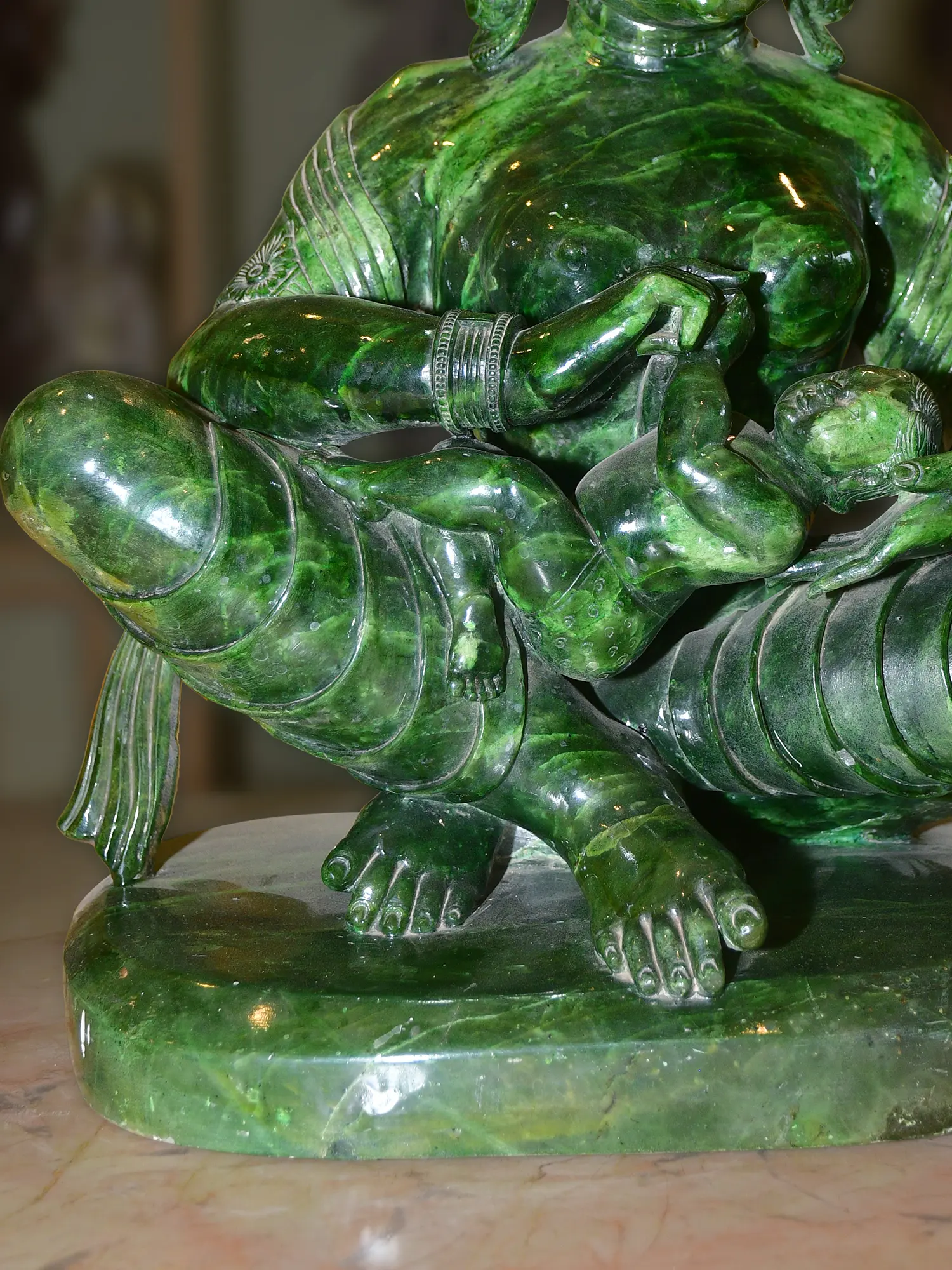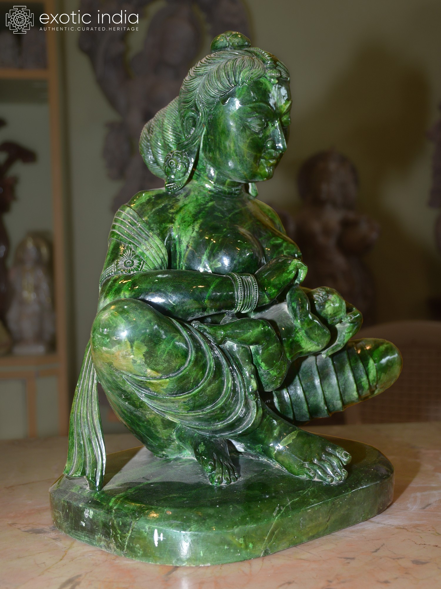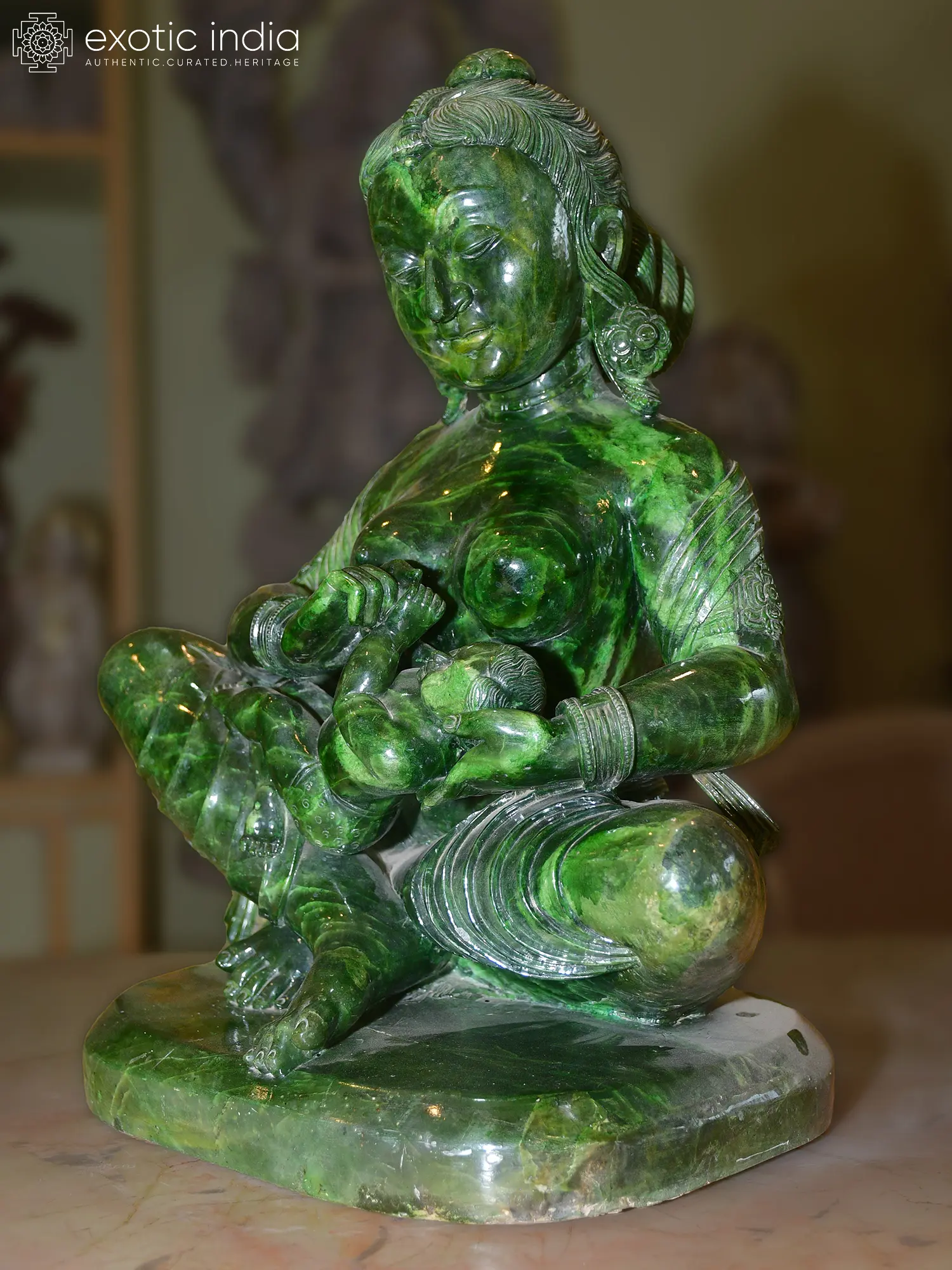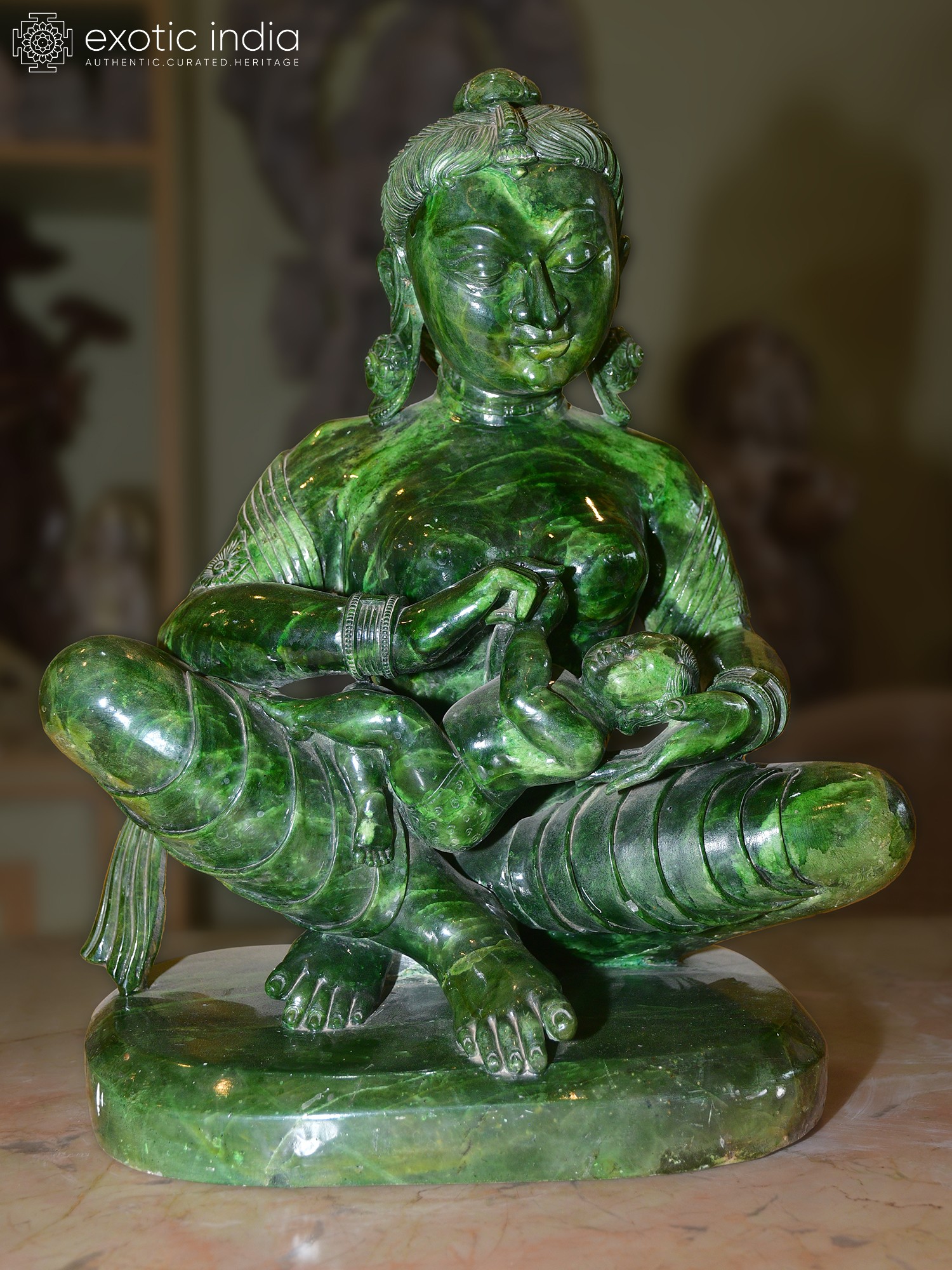 This exquisite sculpture captures the purest essence of maternal love, a tender moment immortalized in verdant stone. Crafted with exceptional skill from Orissa stone, this piece showcases an Indian artisan's mastery in bringing life and emotion to solid form. The intricate details, from the gentle curve of the mother's arm cradling her child to the delicate features of both figures, speak of a deep understanding of human connection and artistic tradition. The smooth, polished surface of the stone highlights the natural beauty of its rich green hues, creating a mesmerizing interplay of light and shadow that adds depth and character to the artwork.