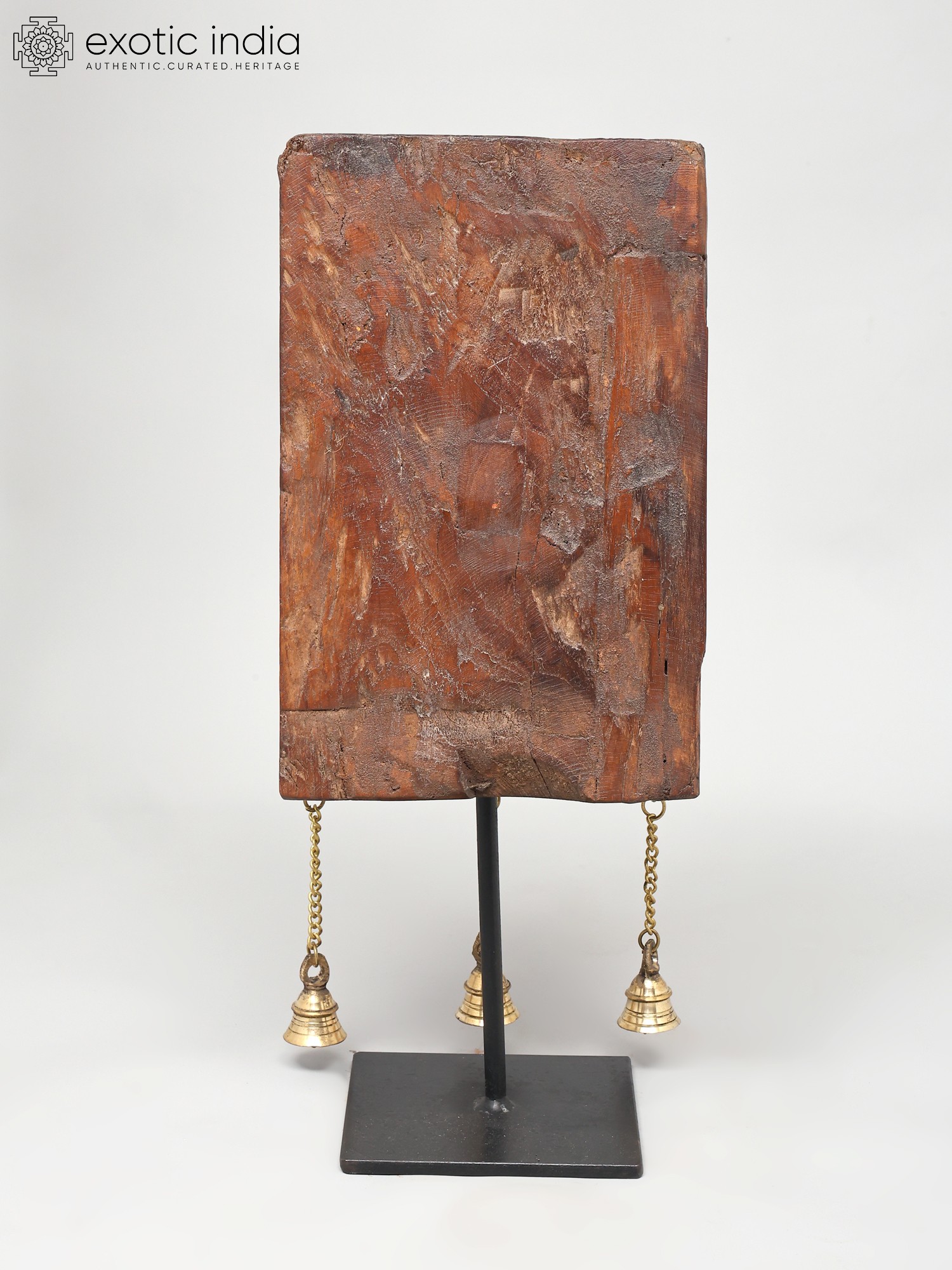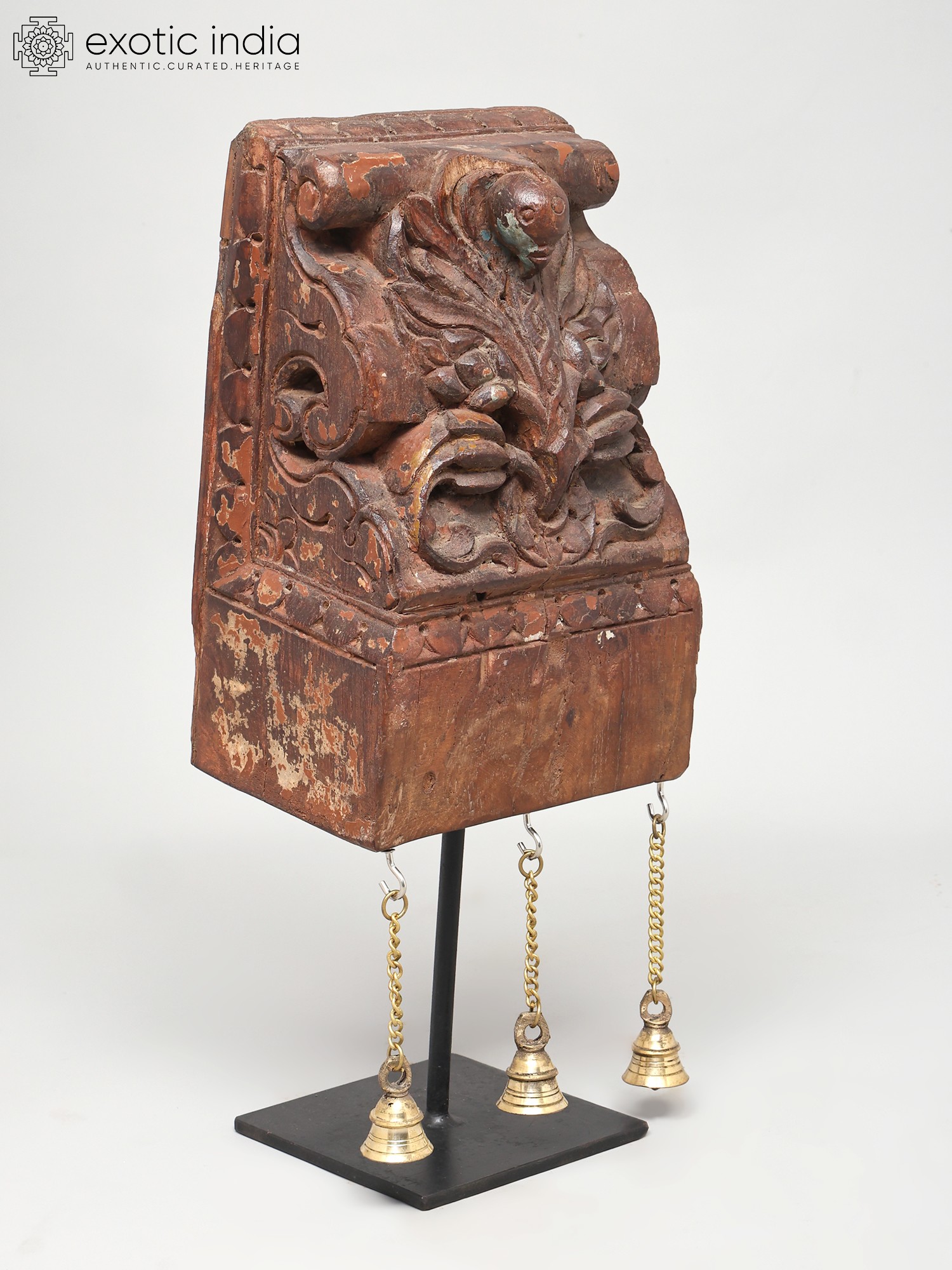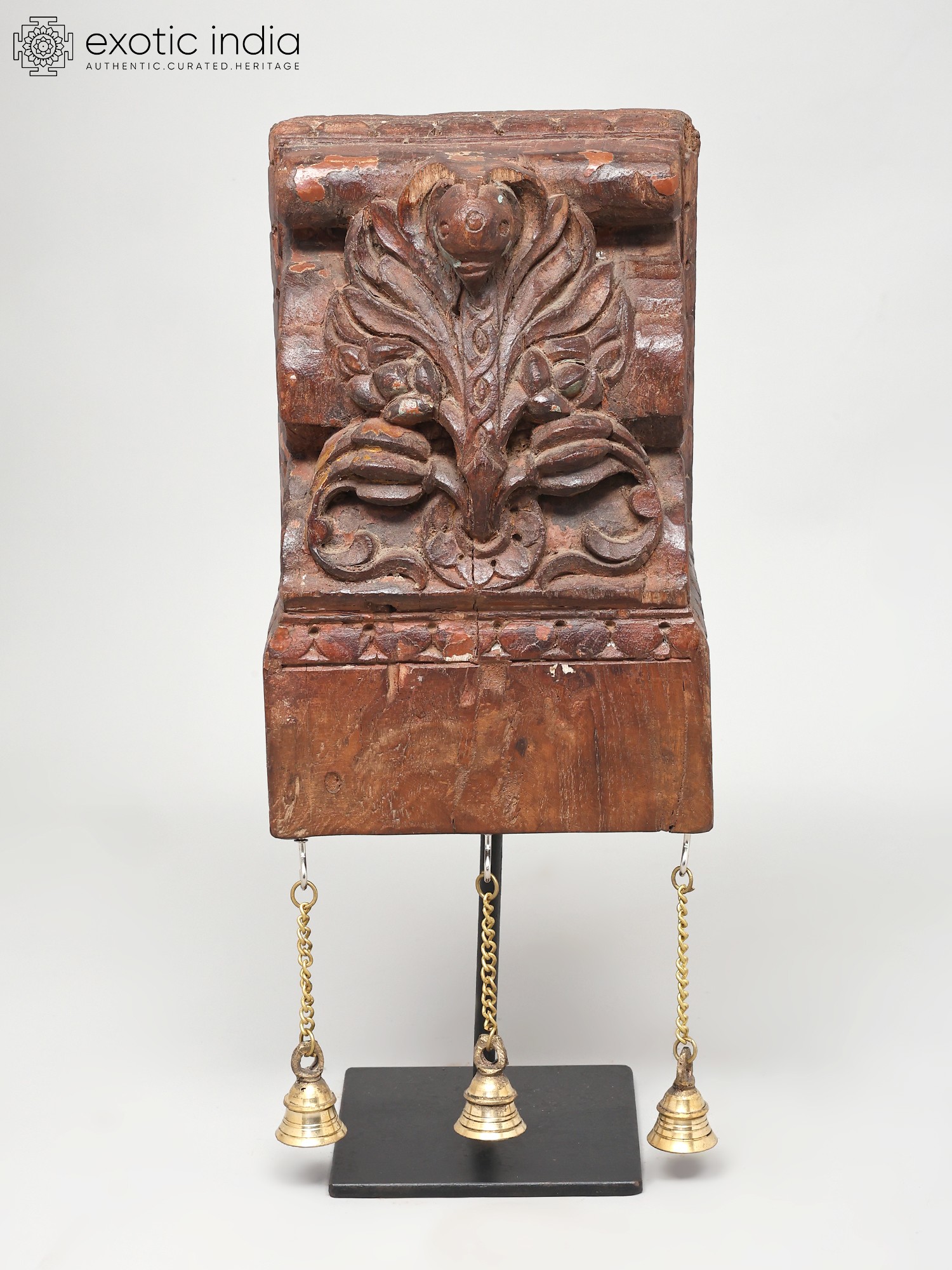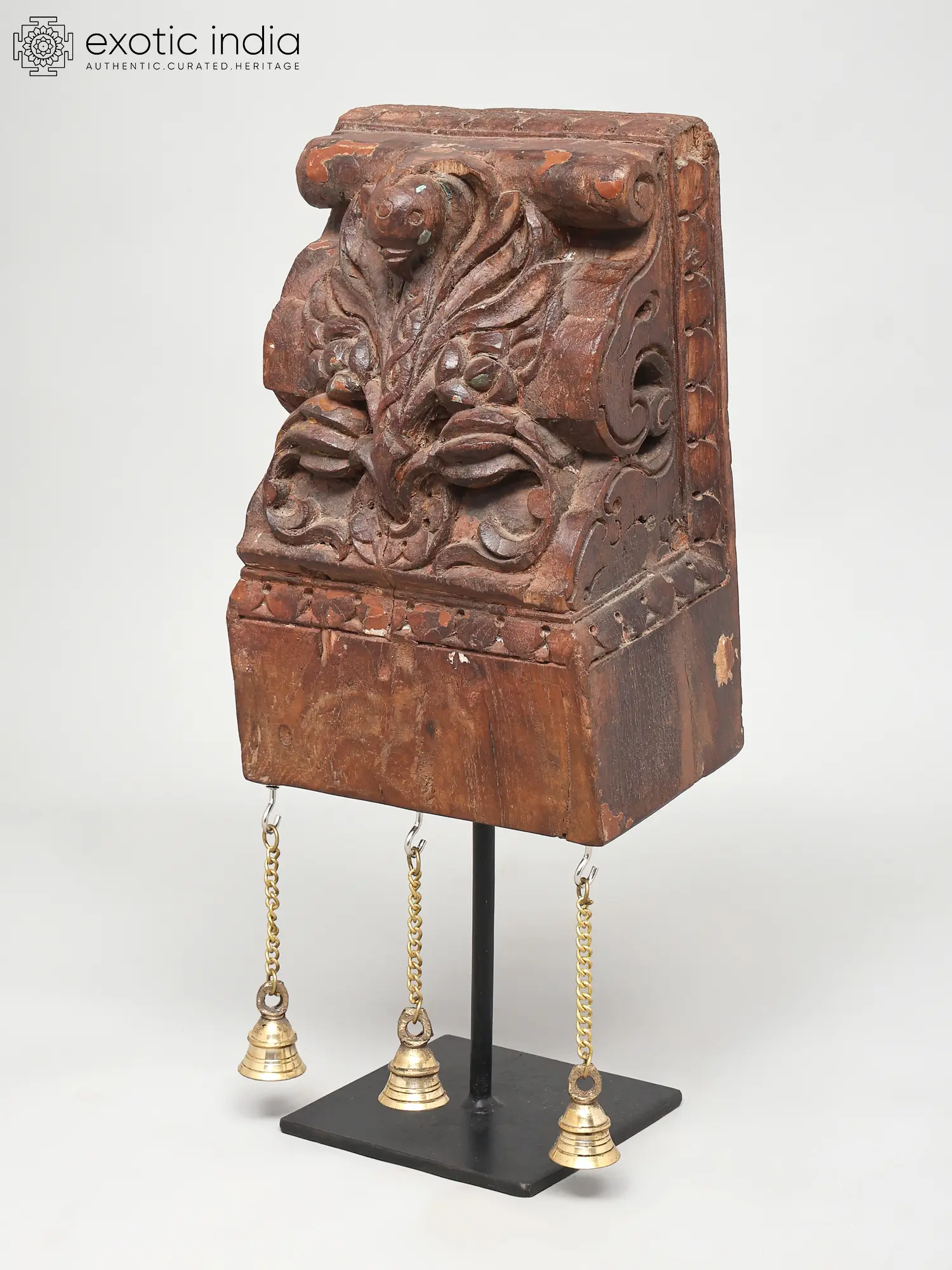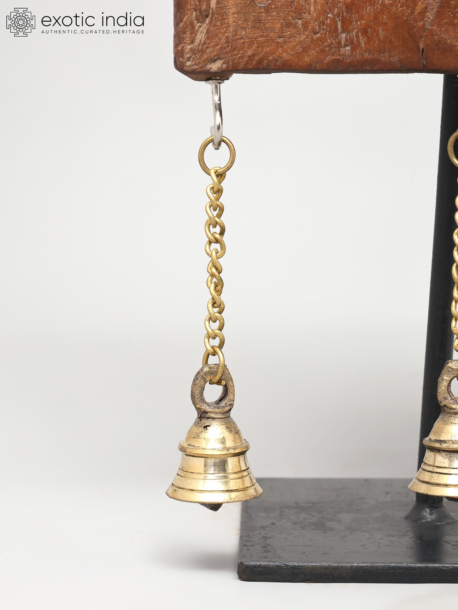 16" Wood Carved Designer Showpiece on Iron Stand with Brass Bells | Table Decor