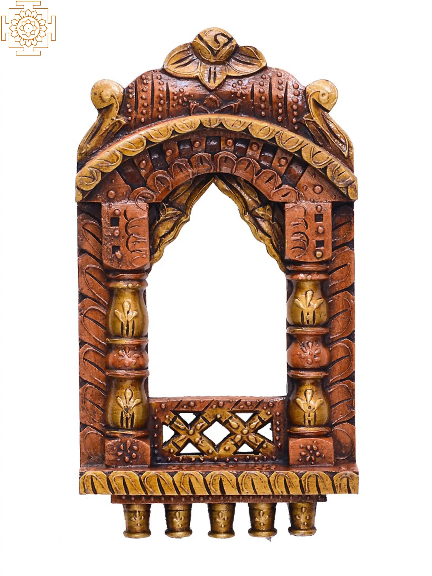 This Jharokha is incredibly versatile, capable of transforming any corner of your home into a statement of style. Whether placed in your living room to add a touch of ethnic flair, in your entryway to welcome guests with a sense of grandeur, or even in a bedroom to create a serene and artistic atmosphere, it promises to elevate your interior design. Its unique form also lends itself to creative display. Imagine it adorned with trailing ivy, a small mirror, or even as a stand for cherished mementos, allowing you to personalize its charm. The presence of decorative pegs below the window suggests a functional aspect, hinting at its potential to hold keys or small decorative items, further blending beauty with practicality. –––––––––––––––––––