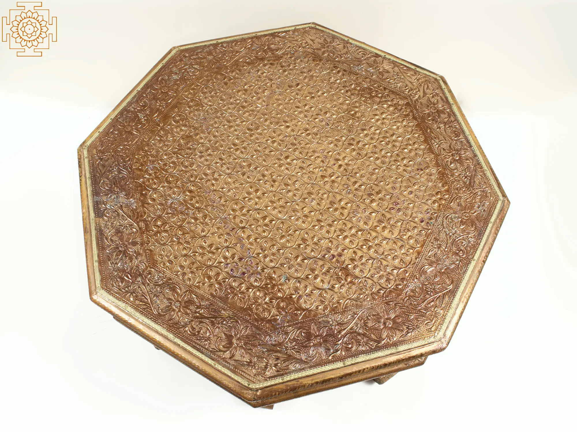 This Wooden Pedestal with Copper-carved sheetwork exudes timeless allure, invoking the charm of a bygone era. Its Octagonal shape, adorned with the intricate bael buta design along the edges and a floral jaal pattern inside, reflects meticulous craftsmanship. The elegantly curved legs add a unique touch, elevating its aesthetic appeal.