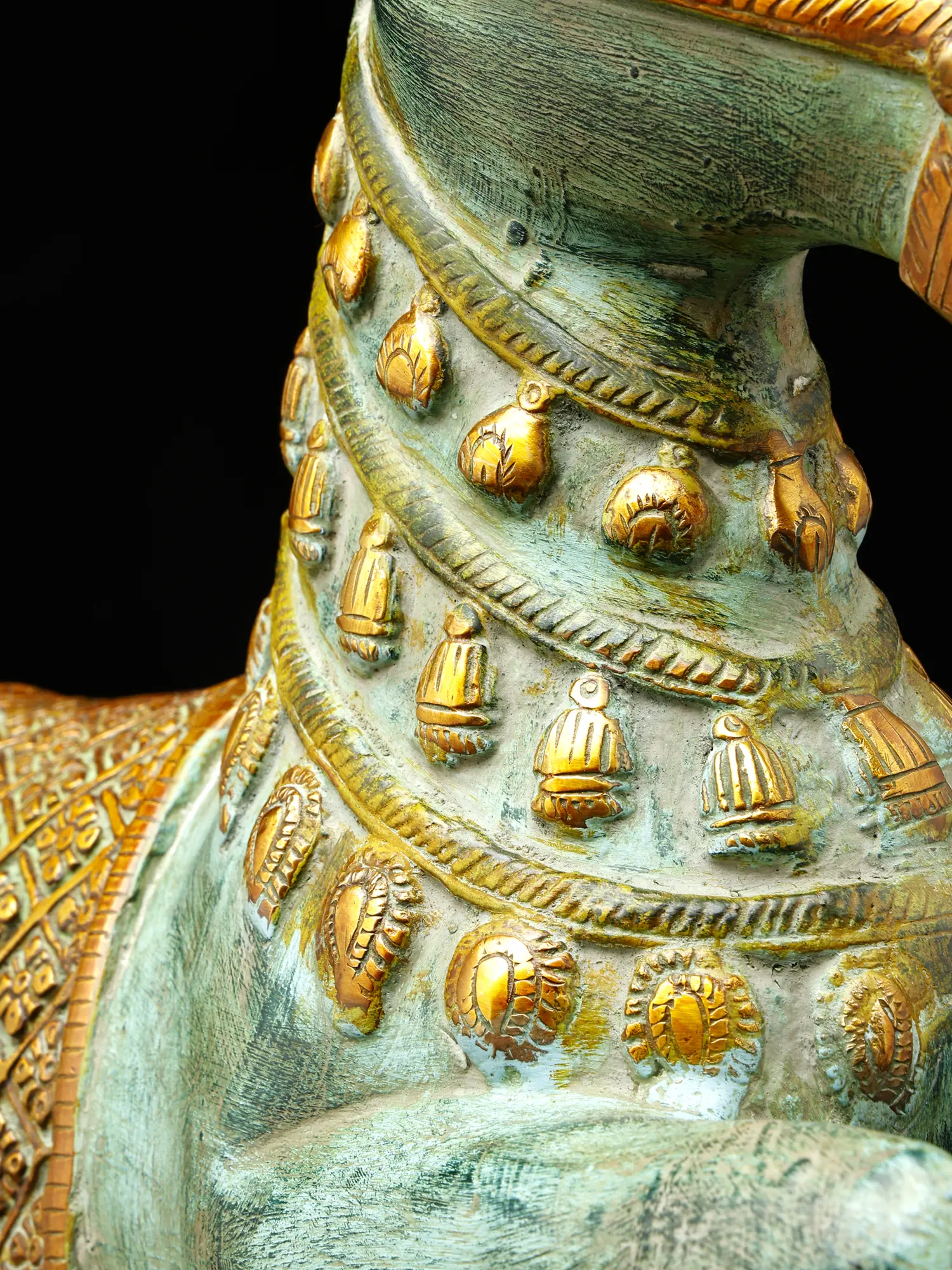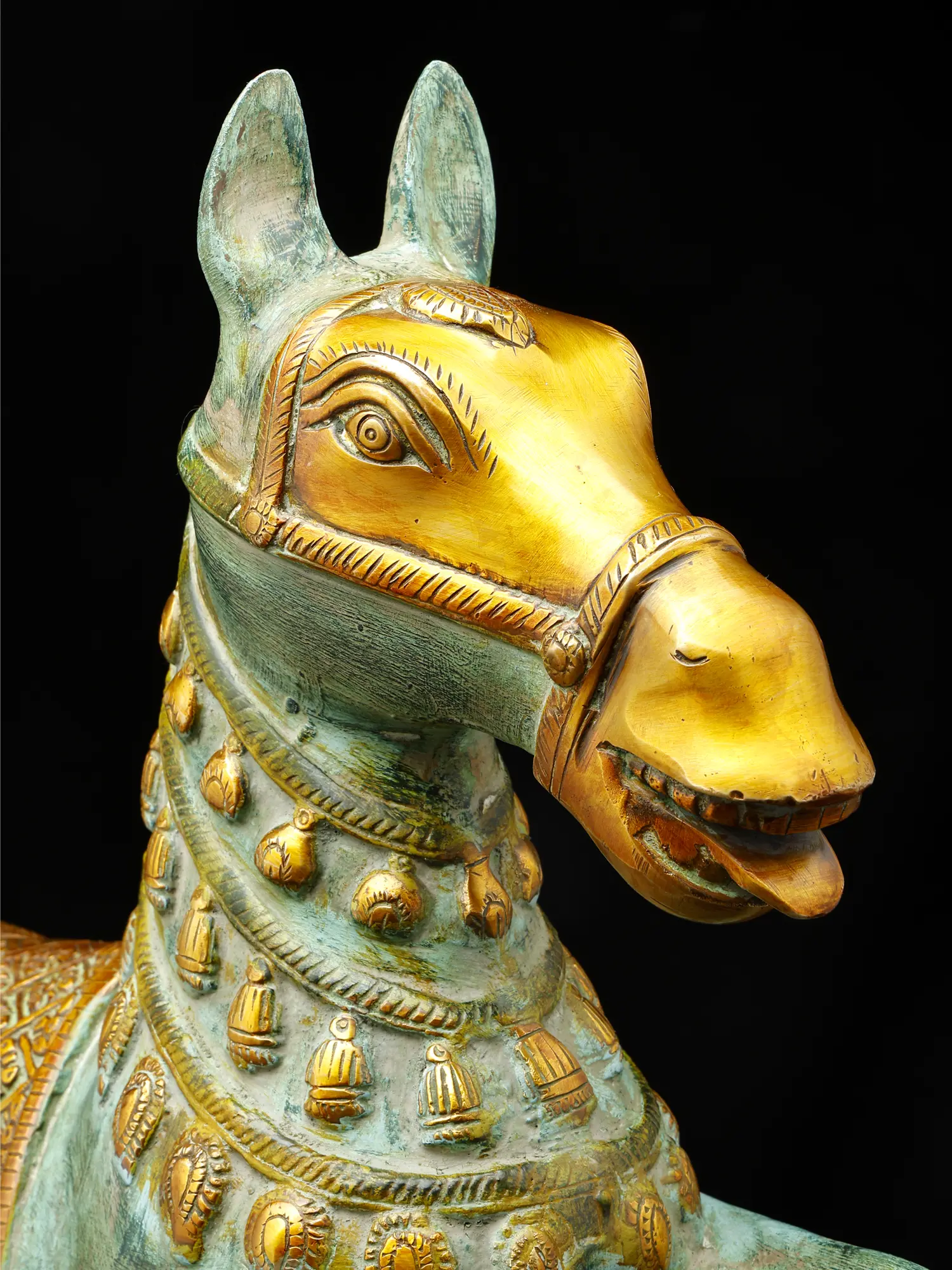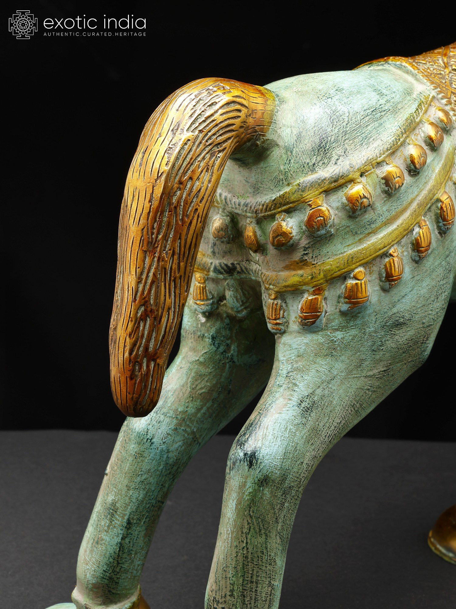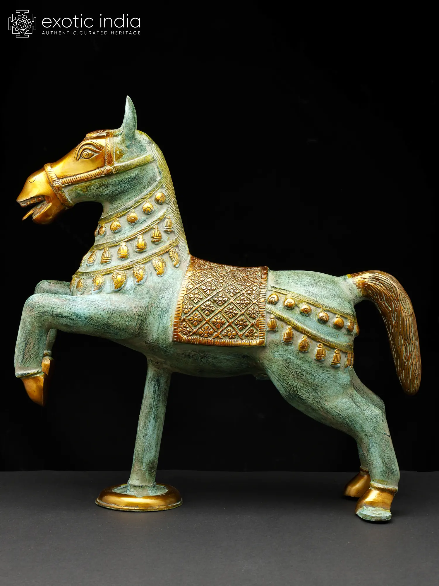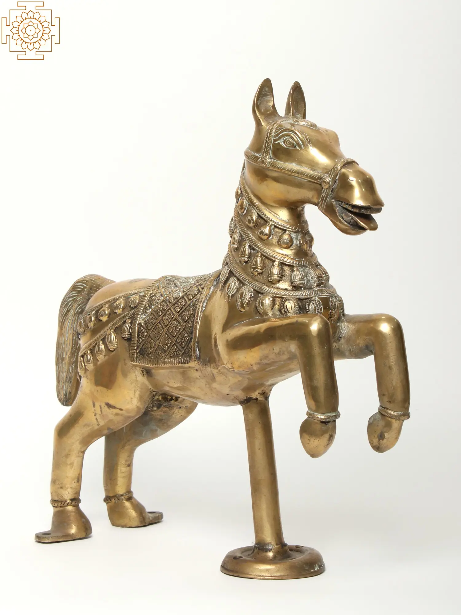 An Ashwa, or horse, appears in numerous Vedic and folk tales. This brass Decorative Horse statue adds to the millions of portrayals of the animal. The statue, which resembles a rocking horse, is a beautiful addition to any home's decor. It is embellished with exquisite ornamentation and depicted as a charging horse. The chain with bells around its neck is a beautiful piece of craftsmanship. Its tongue is protruding as though screaming with rage. This painting is an excellent illustration of a horse's major characteristics, speed and attention.