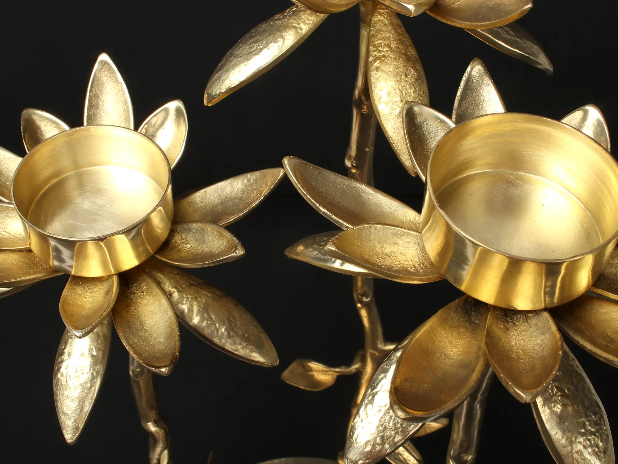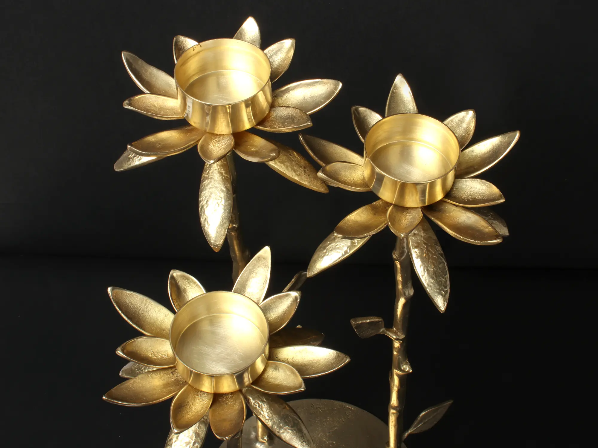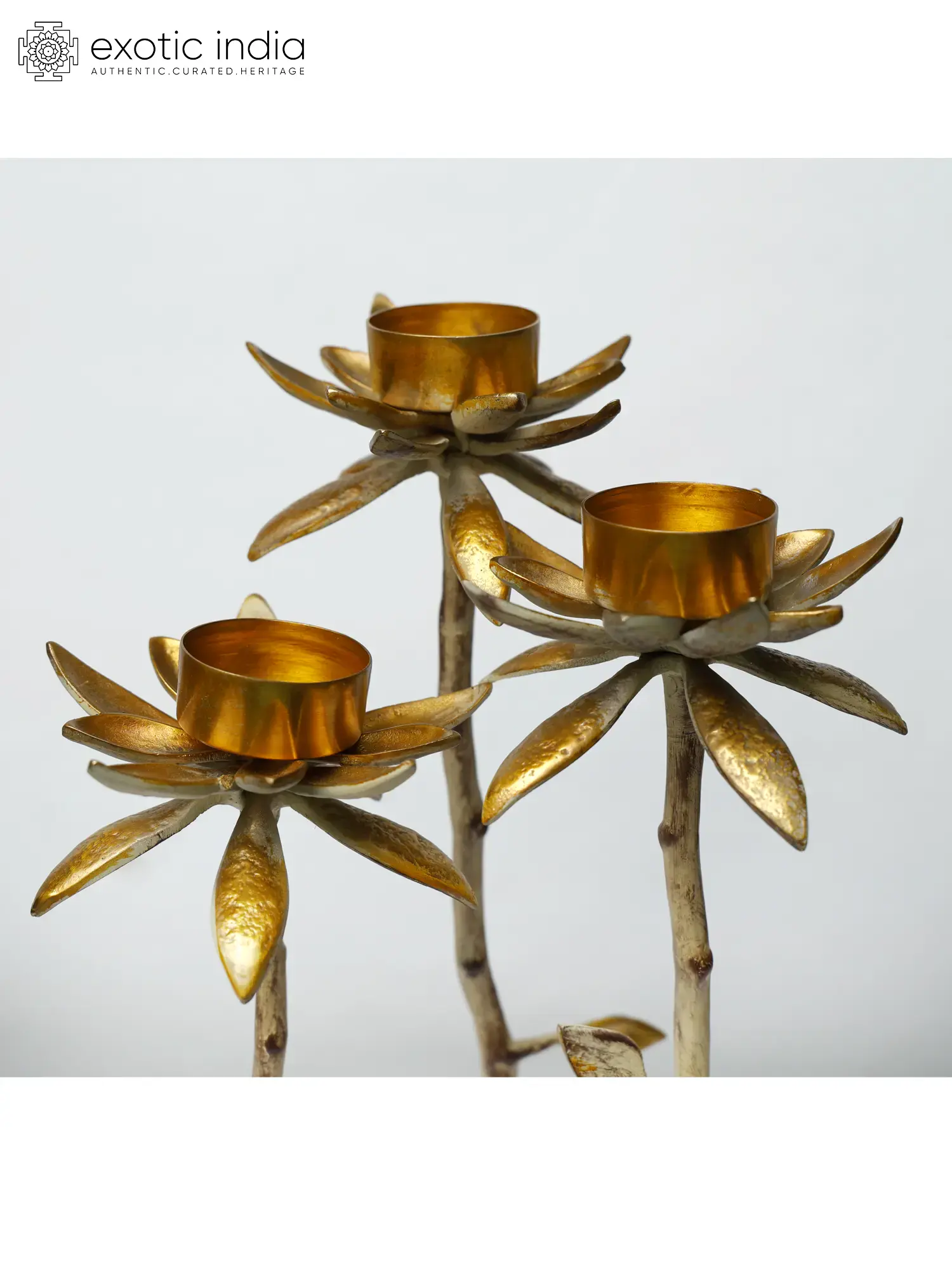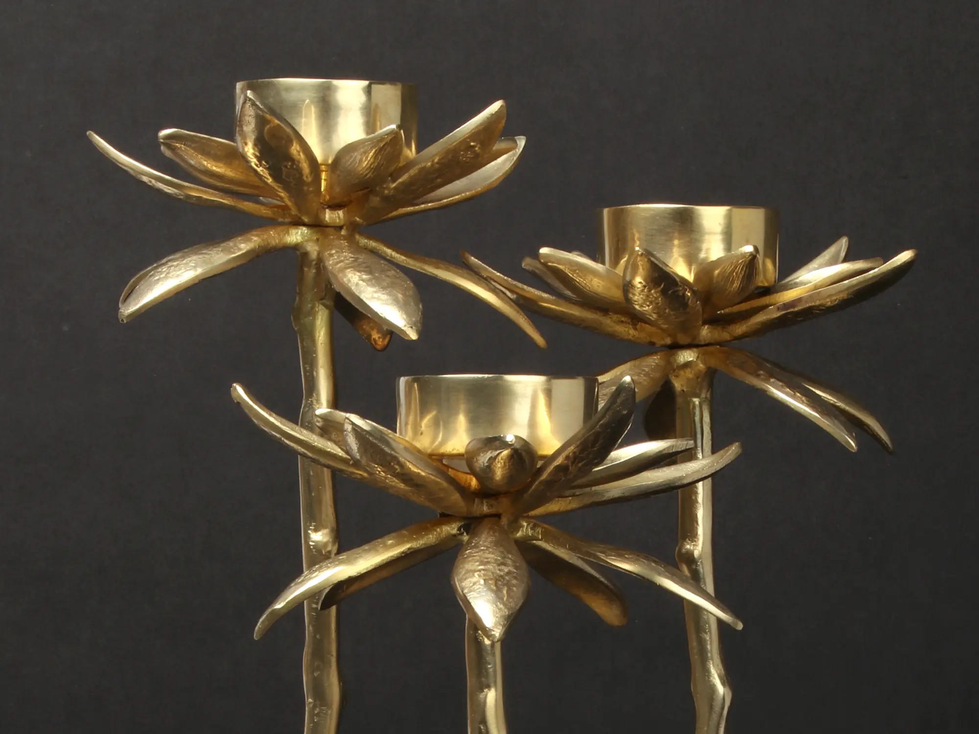 This Brass Lotus Design Three Cups Candle Holder with Stand combines elegance and spirituality in a captivating way. Long lotus stems adorn the stand, representing purity and enlightenment. Each stem gracefully supports a cup-shaped candle holder in the style of a lotus flower. Many civilizations venerate the lotus as a symbol of beauty, spiritual growth, and divine consciousness. The candle holder cups cast a warm and inviting glow, highlighting the lotus design's exquisite features. With its lotus-inspired pieces and luminous illumination, this stunning ensemble becomes a treasured centerpiece, filling any area with a tranquil mood and a subtle reminder of nature's unparalleled beauty.