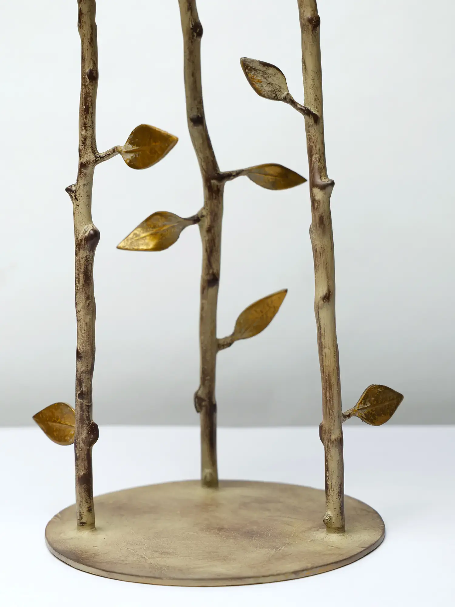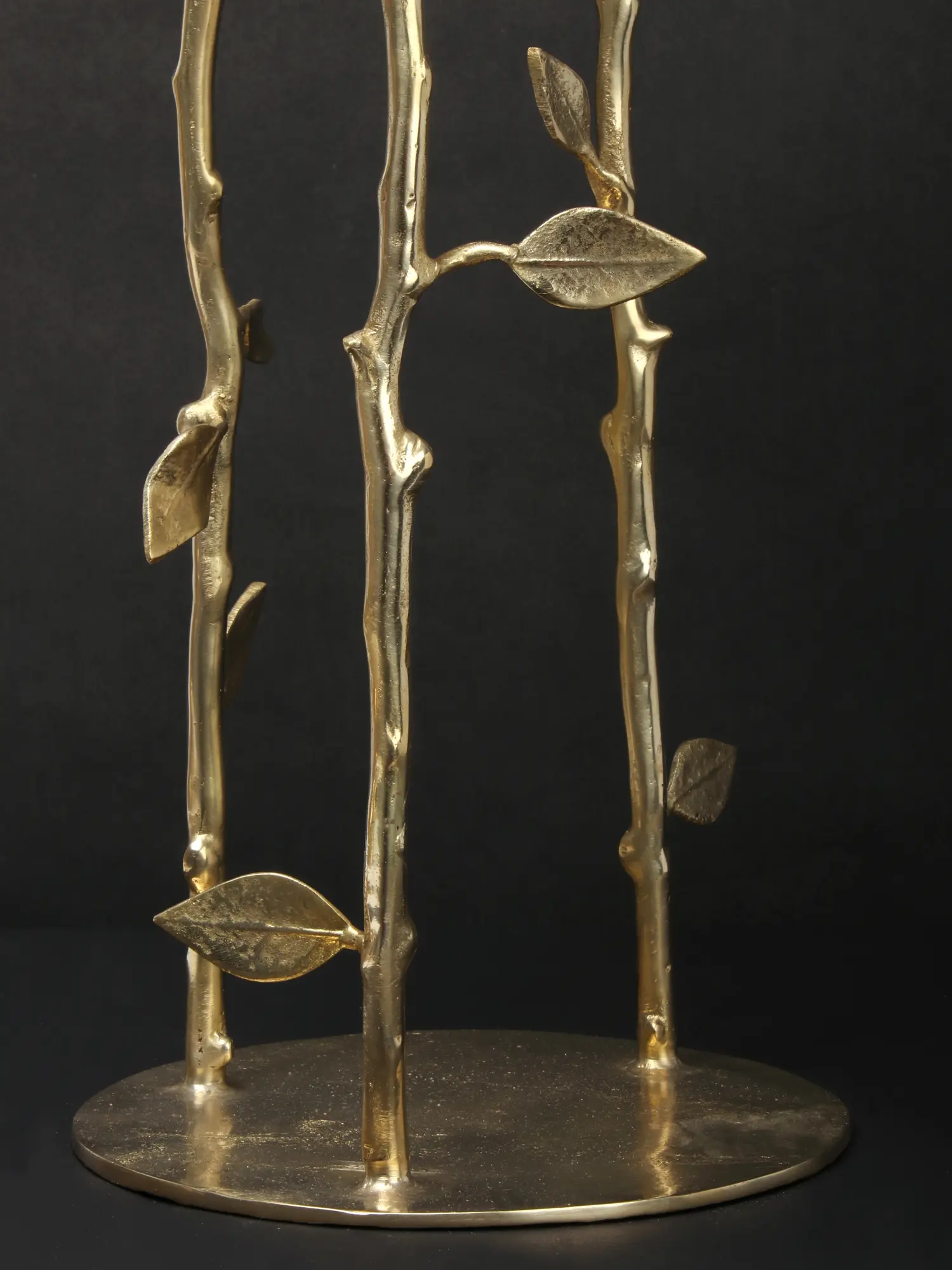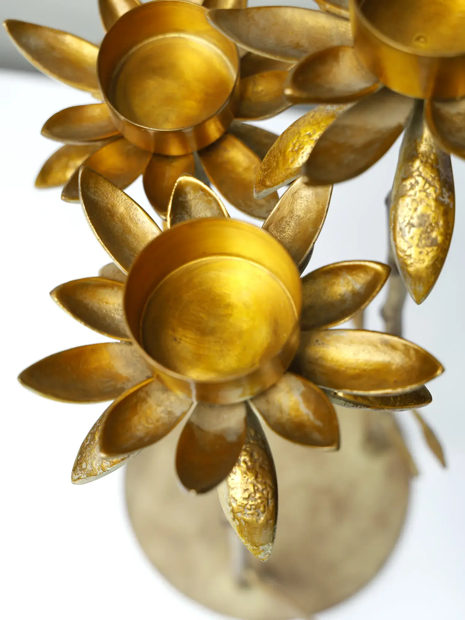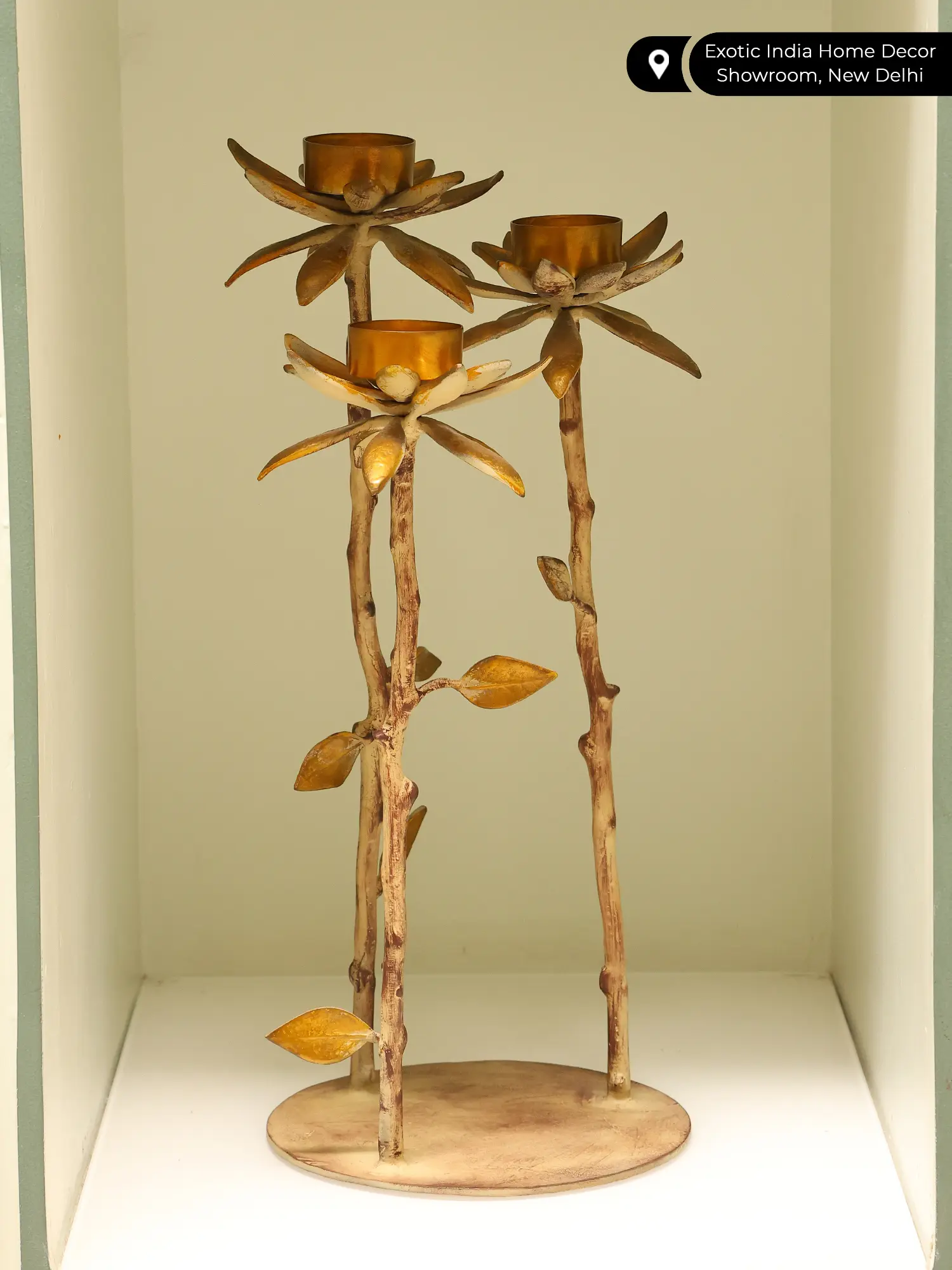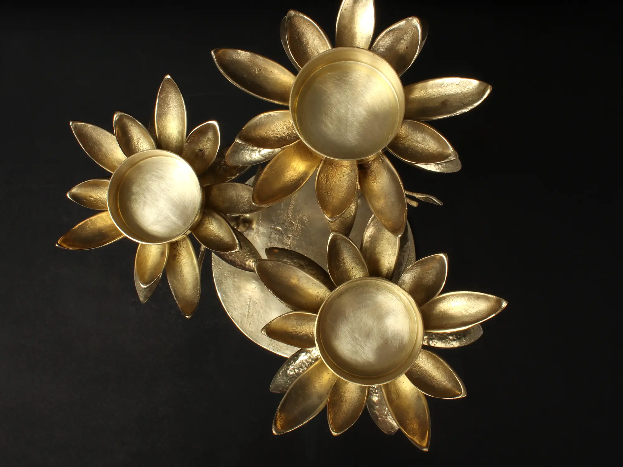 This Brass Lotus Design Three Cups Candle Holder with Stand combines elegance and spirituality in a captivating way. Long lotus stems adorn the stand, representing purity and enlightenment. Each stem gracefully supports a cup-shaped candle holder in the style of a lotus flower. Many civilizations venerate the lotus as a symbol of beauty, spiritual growth, and divine consciousness. The candle holder cups cast a warm and inviting glow, highlighting the lotus design's exquisite features. With its lotus-inspired pieces and luminous illumination, this stunning ensemble becomes a treasured centerpiece, filling any area with a tranquil mood and a subtle reminder of nature's unparalleled beauty.