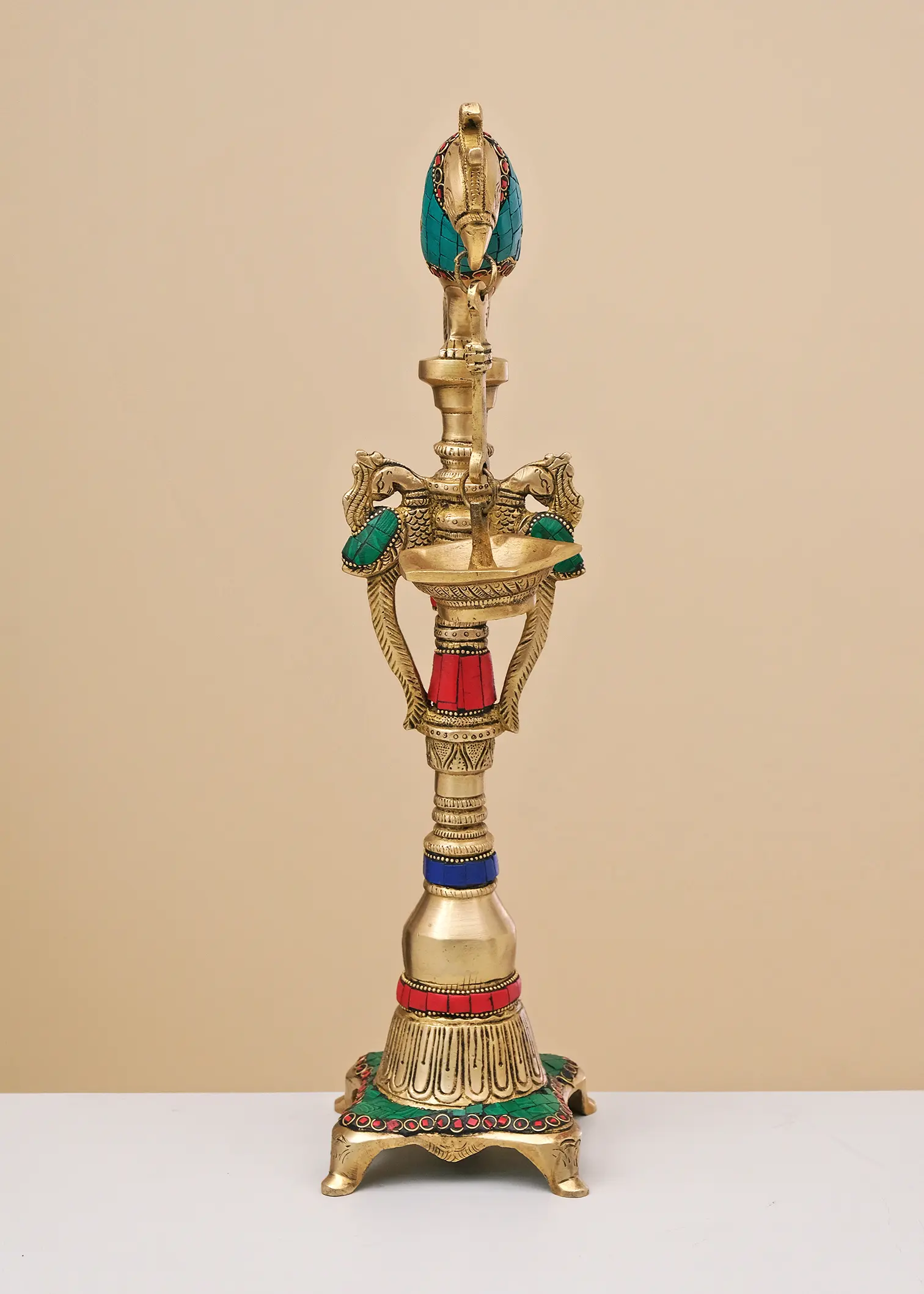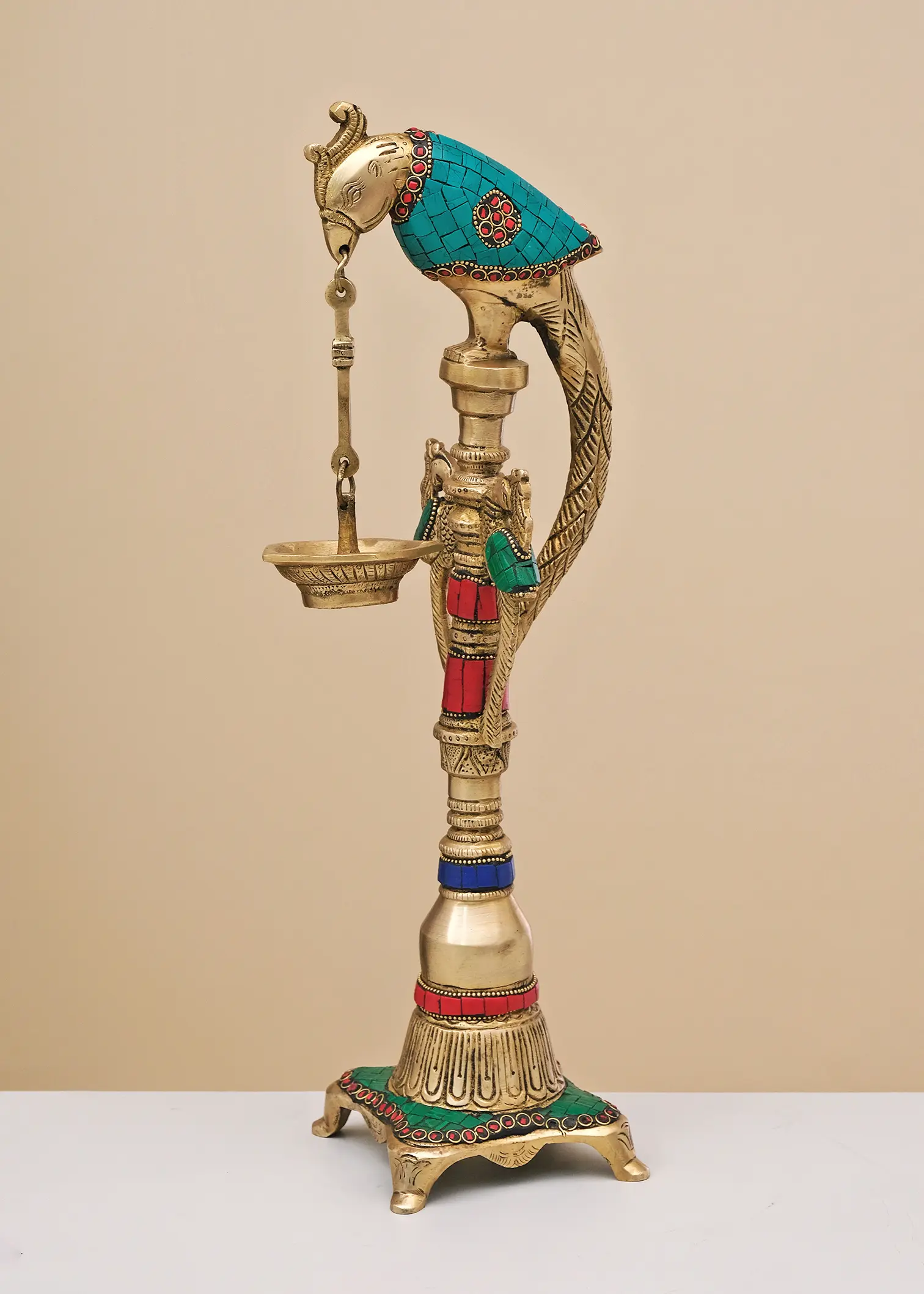 There are ample descriptions of parrots in Indian art. The sculpture of a maiden from the Hoysala temples of Belur, shown holding a parrot and probably speaking to it pays tribute to the stories of parrots being the best confidants to a woman. They are always given a special place in art and are depicted most creatively. This Brass Parrot Lamp is a masterpiece of craftsmanship, entirely handmade, and a tribute to the bird and its virtues. This striking lamp features exquisite inlay work in vibrant turquoise, red, green, and blue hues, creating a mesmerizing mosaic-like pattern. The lamp's focal point is a brass parrot, elegantly holding the lamp by its beak and having its wings decorated in fine inlay work. Two more parrots are sitting at the junction of the main figure and the lower stem of the lamp. The stem and stand of the lamp exude timeless elegance, making it a captivating blend of artistry and functionality, sure to illuminate both spaces and hearts with its radiant charm.