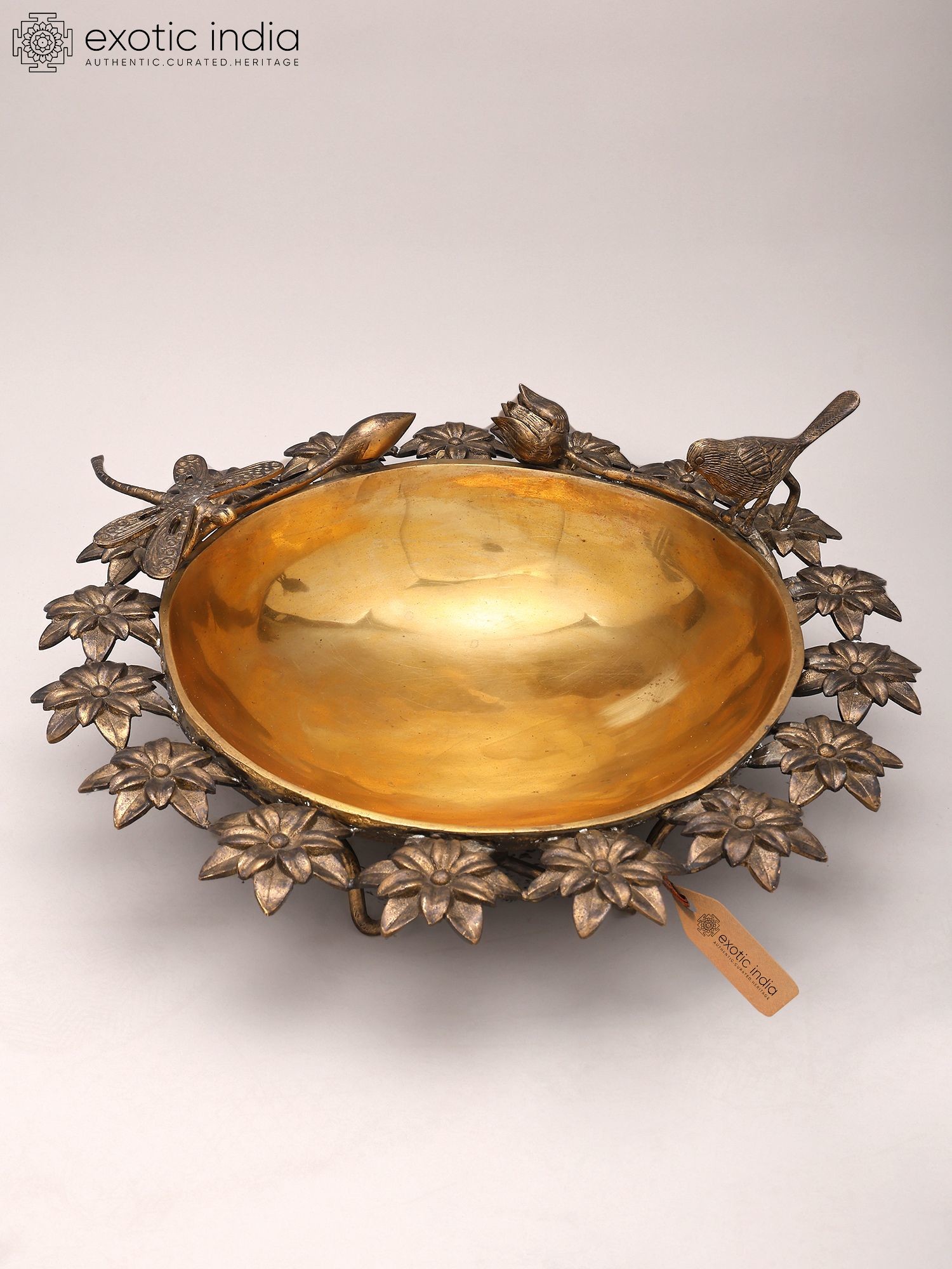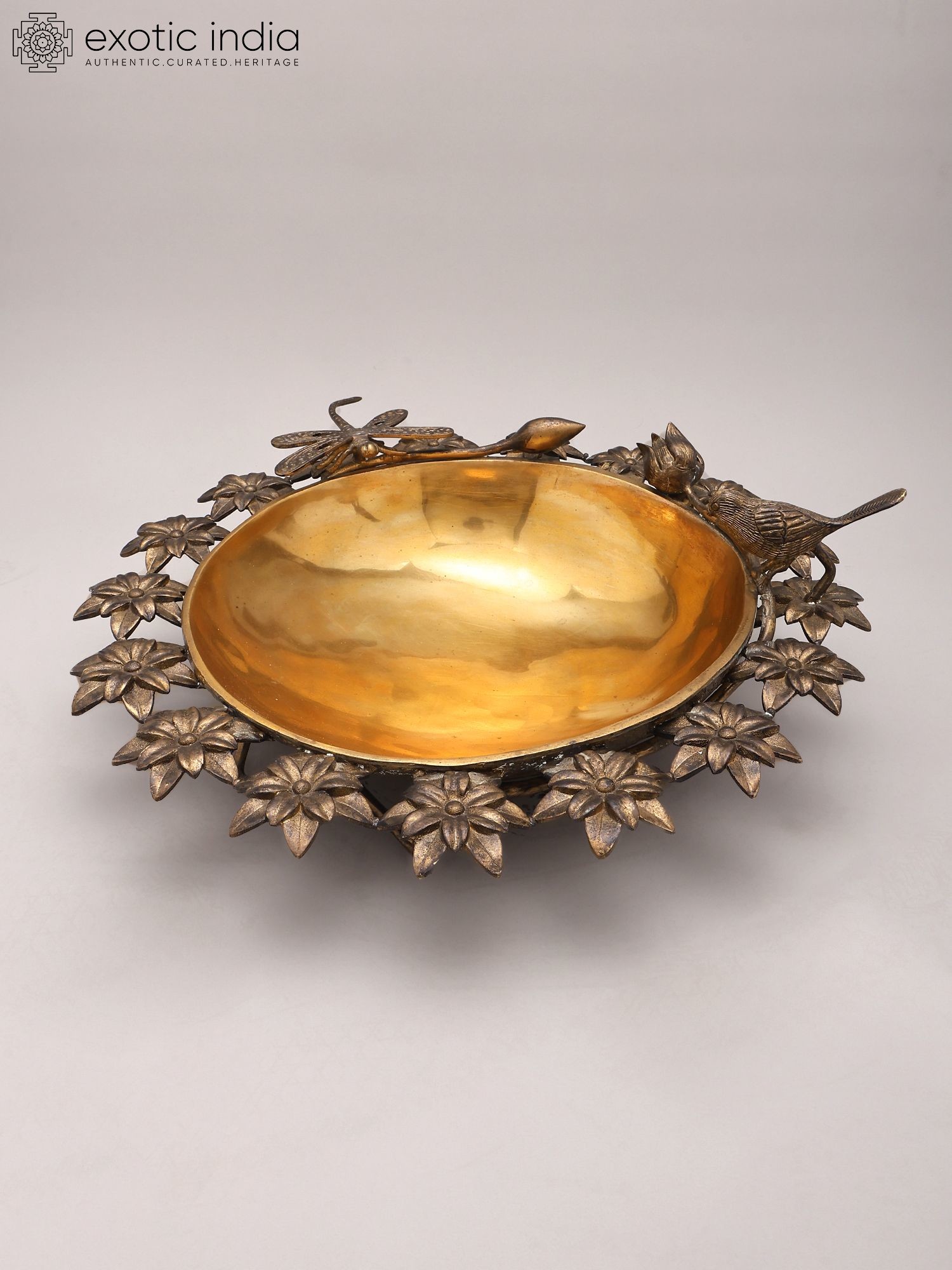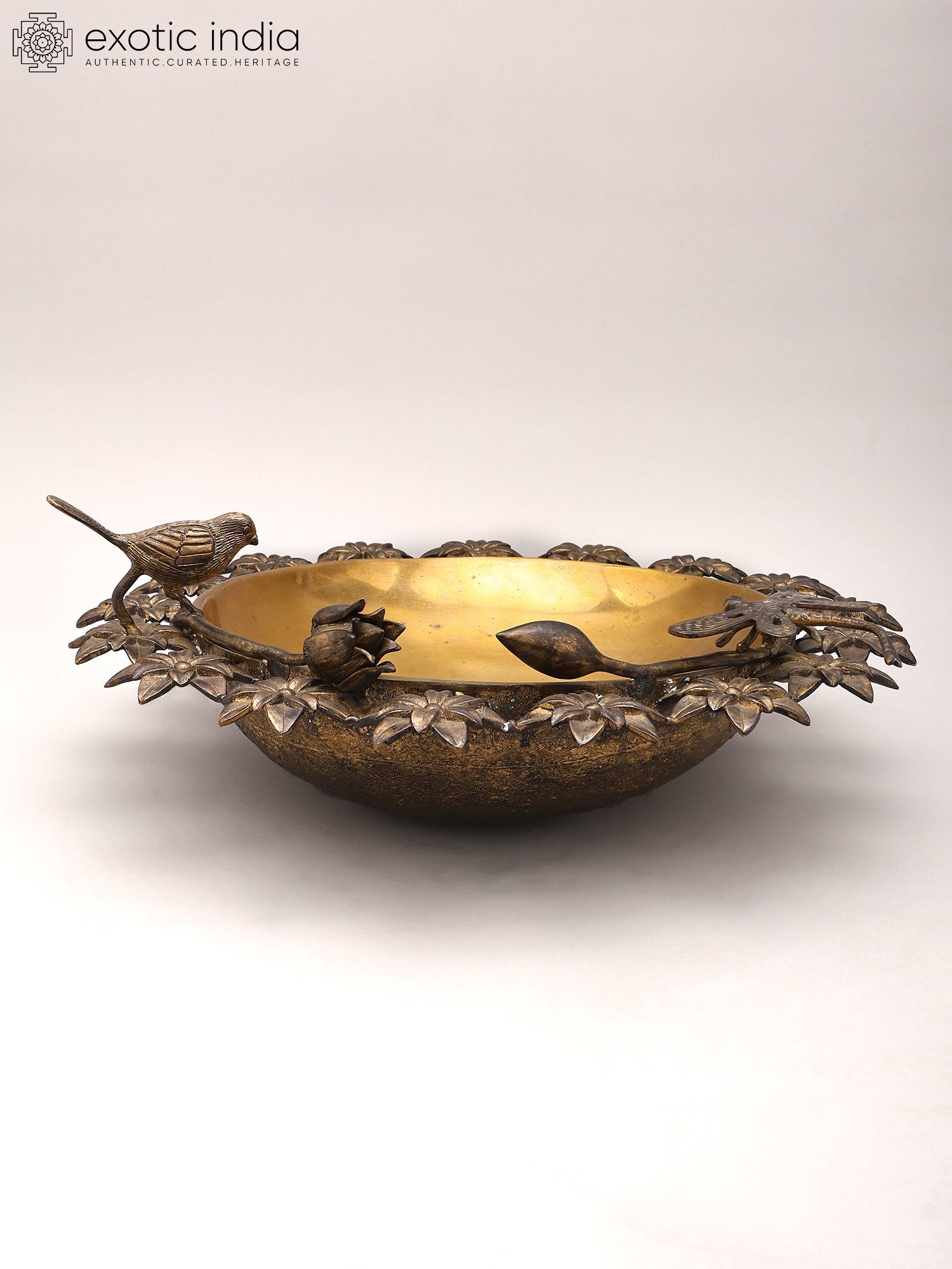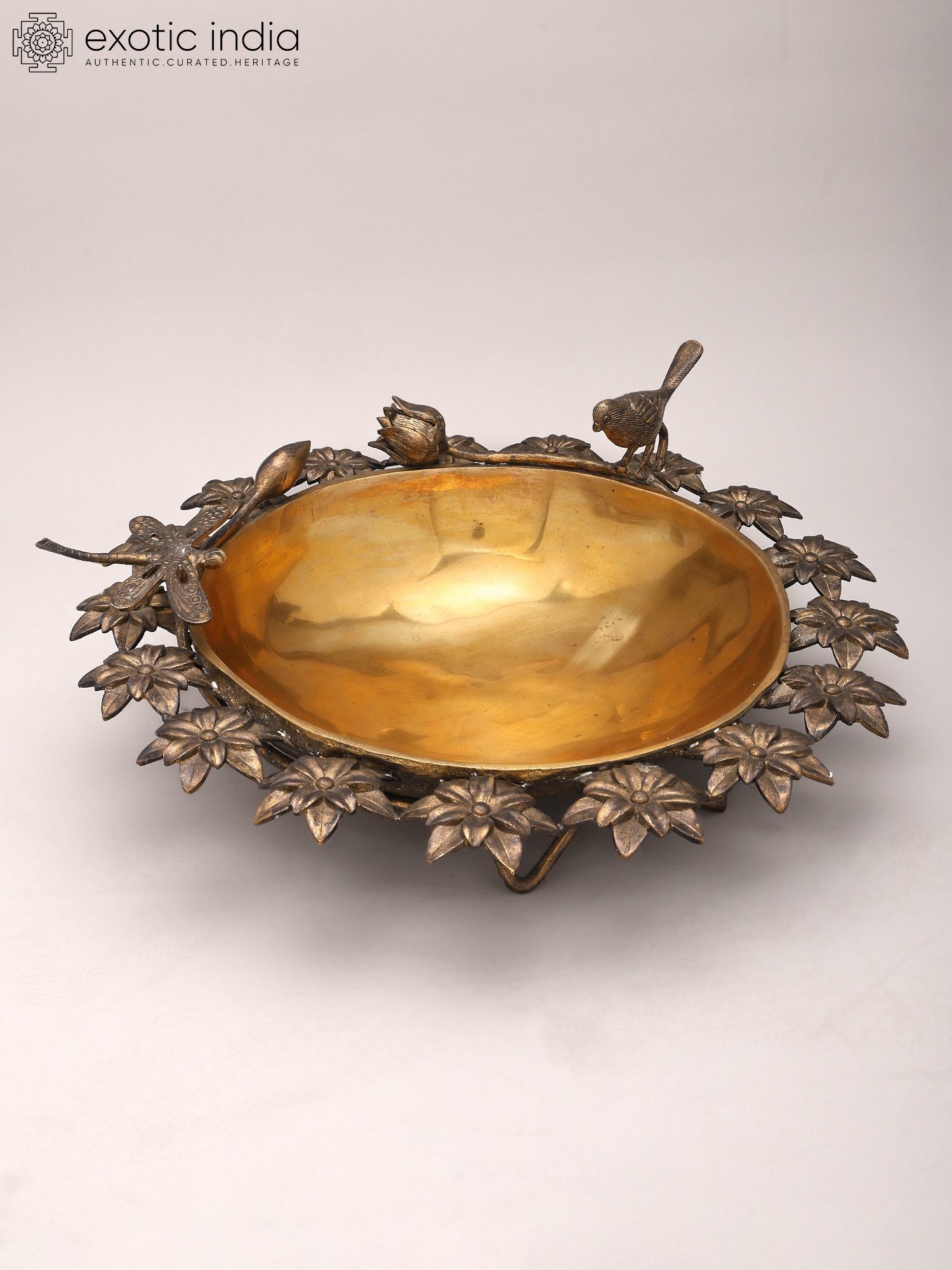 Designer Brass Urli Surrounded with Flowers and Perched Butterfly and Bird