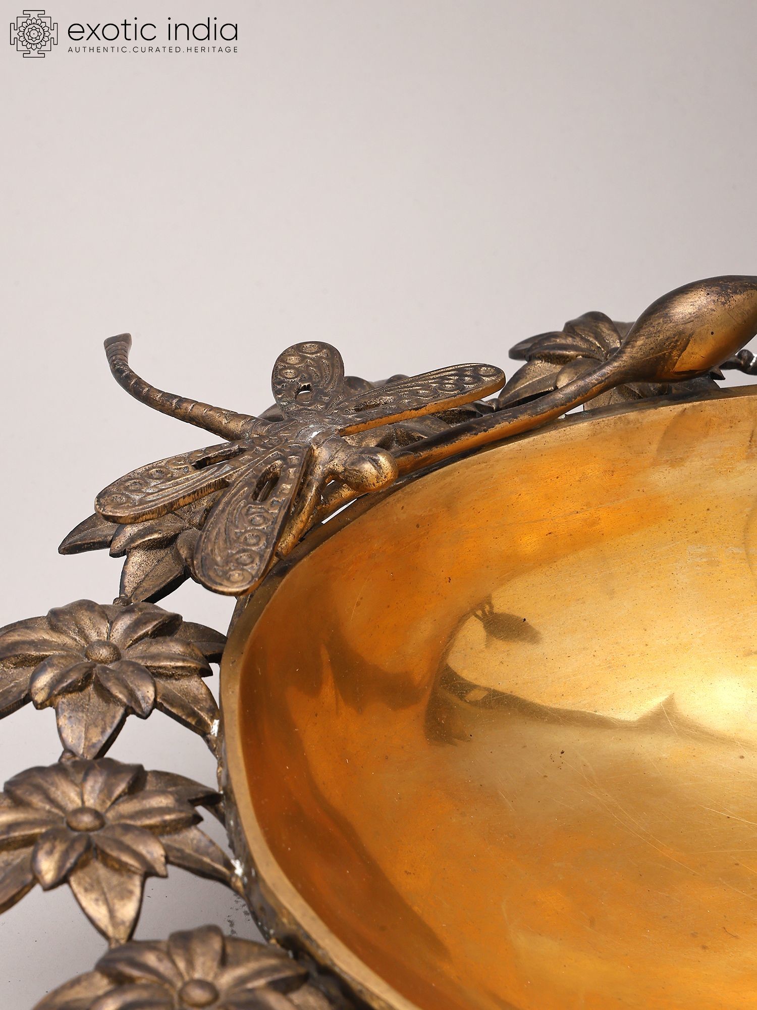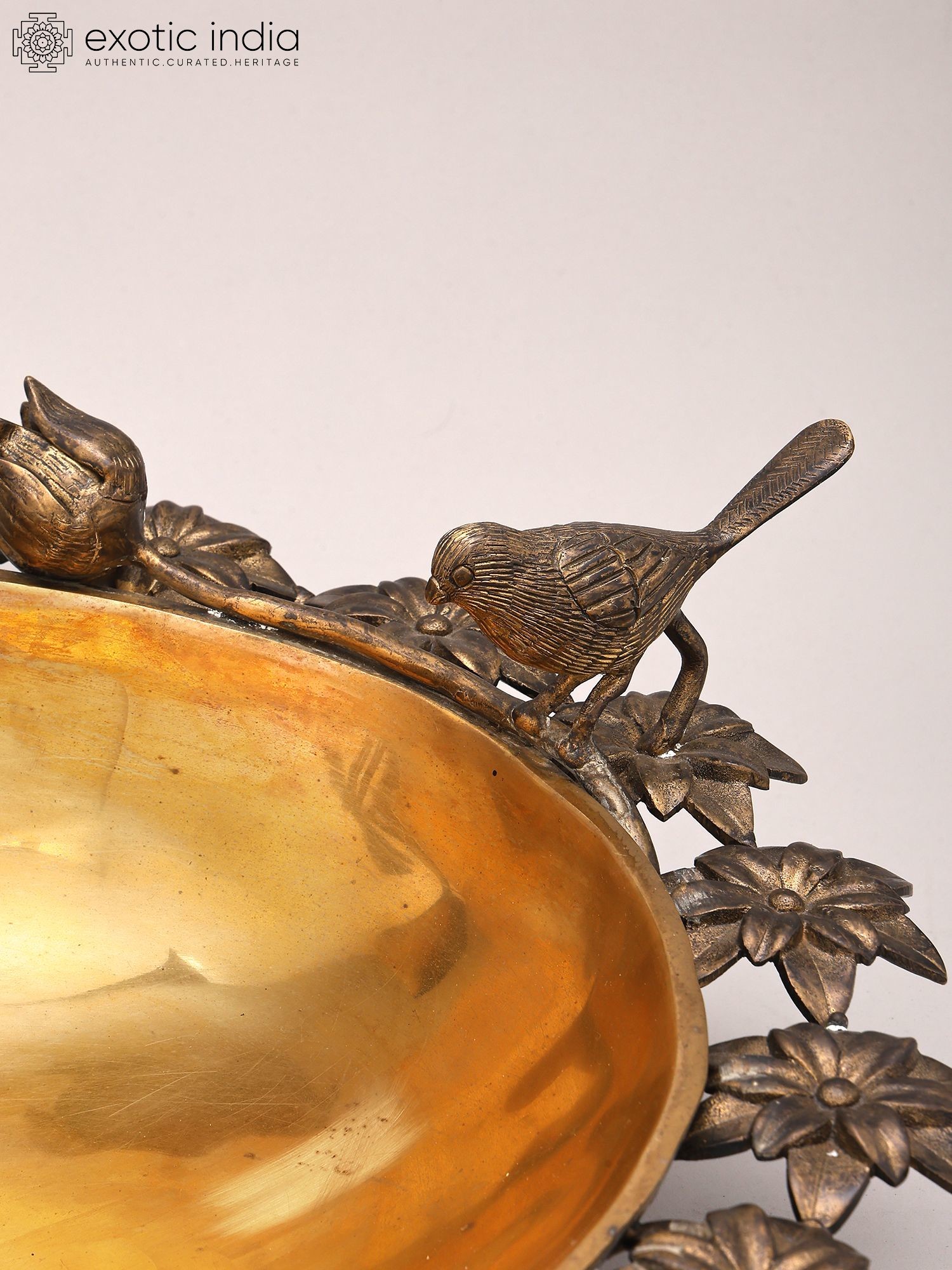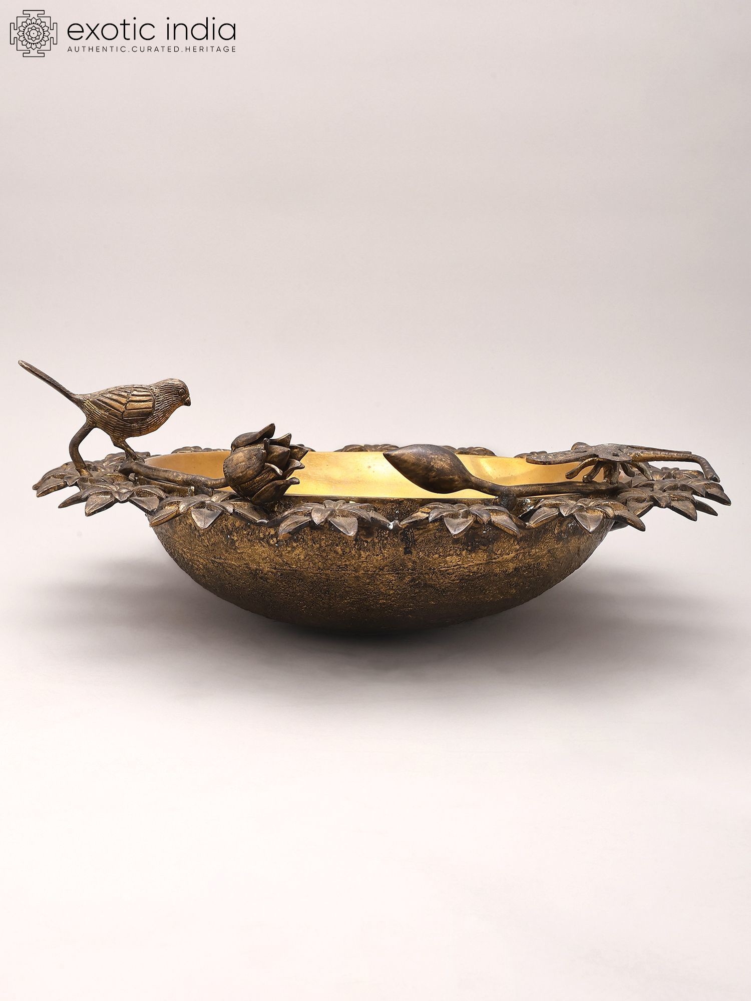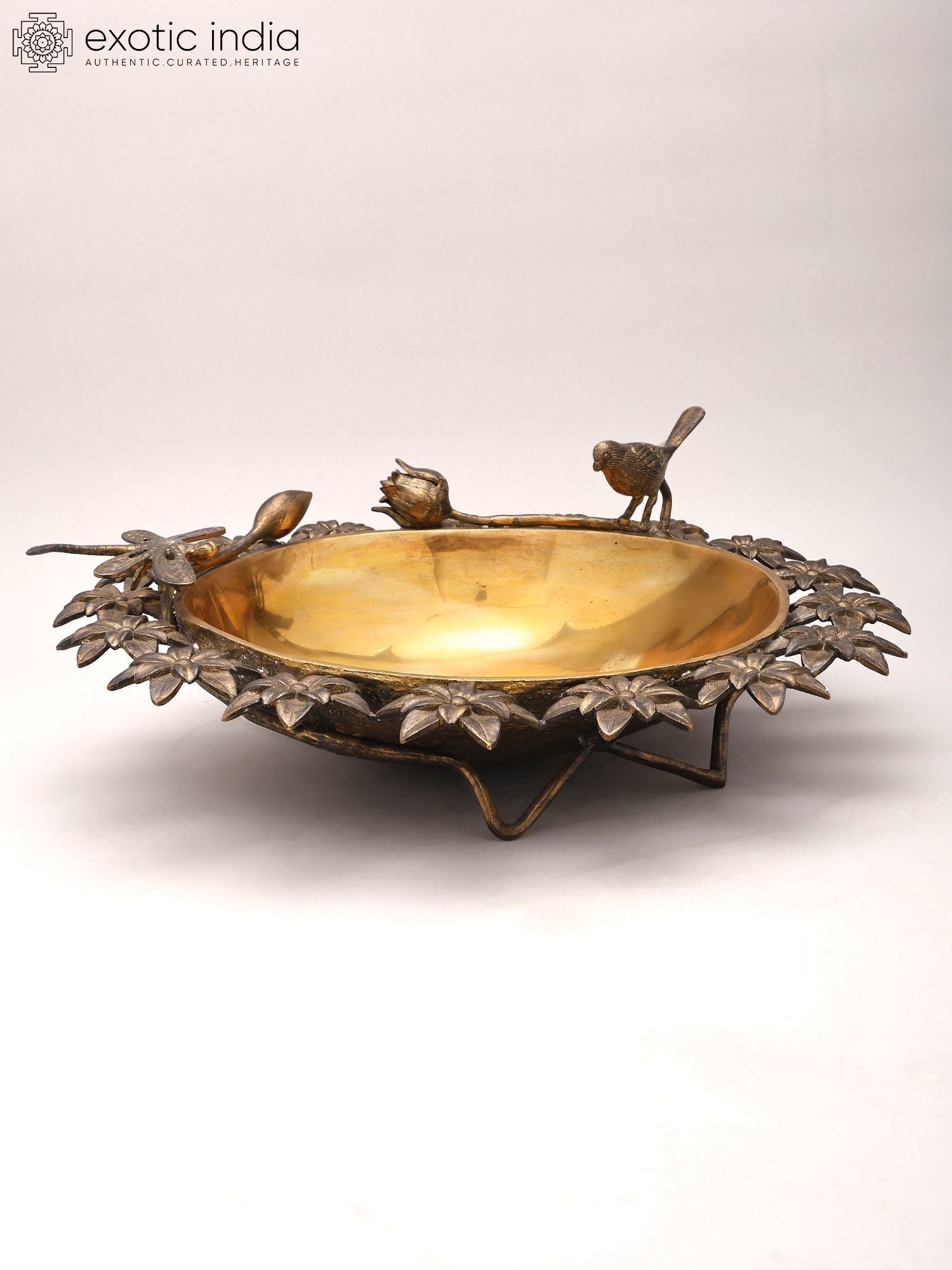 Designer Brass Urli Surrounded with Flowers and Perched Butterfly and Bird