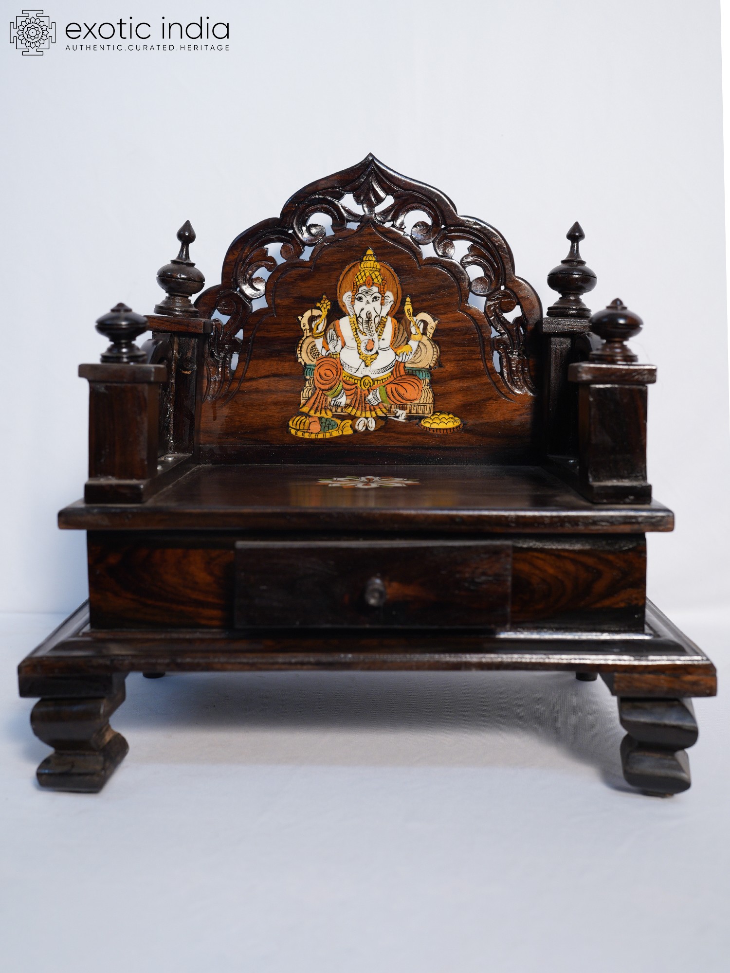 Beyond its aesthetic appeal, this throne is designed with practicality in mind. The sturdy construction provides a stable and secure base for your deity. The integrated drawer offers a discreet storage solution for small puja essentials, such as incense, beads, or sacred texts, keeping your space organized and clutter-free. The raised platform design not only enhances the visual prominence of the deity but also facilitates easier access for rituals and offerings. This harmonious blend of beauty and functionality makes it a perfect addition to any devotional setting.