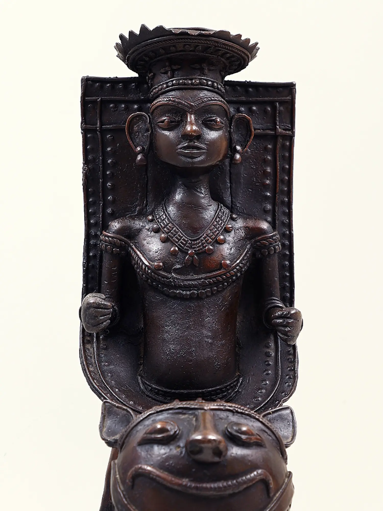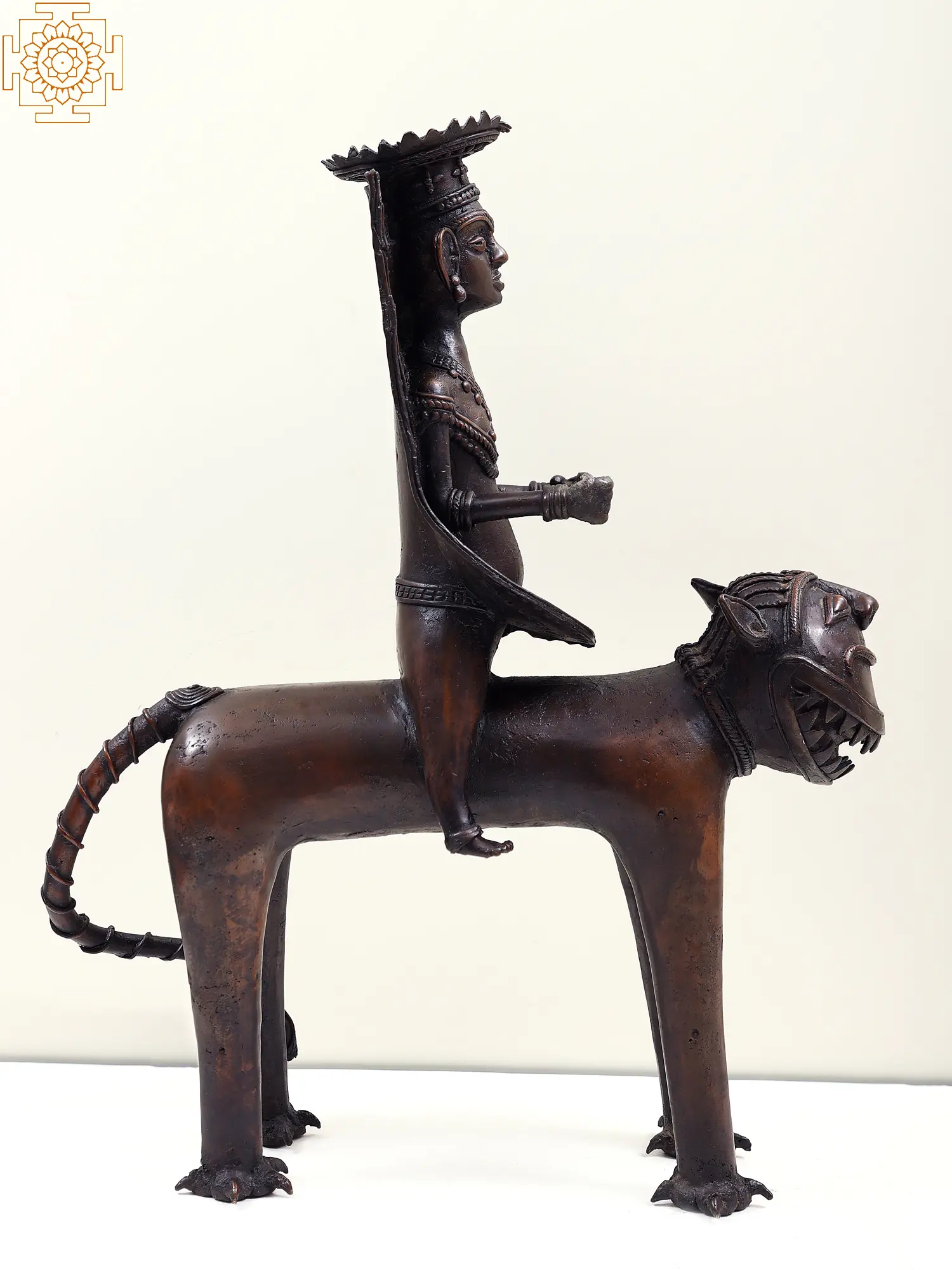 Dhokra art is a testament to the artistic skills and cultural heritage of India's tribal communities. The intricate designs, traditional techniques, and eco-friendly nature make it a valued and distinctive form of metal craft with both cultural and artistic significance. Think of this Dhokra art piece becoming a focal point in your decor, each intricately crafted detail capturing the essence of tribal life. The tribal man sitting on a lion becomes a visual narrative of human-animal exchange, where each nuance speaks to the artisan's skill and the rich cultural history embedded in the craft.