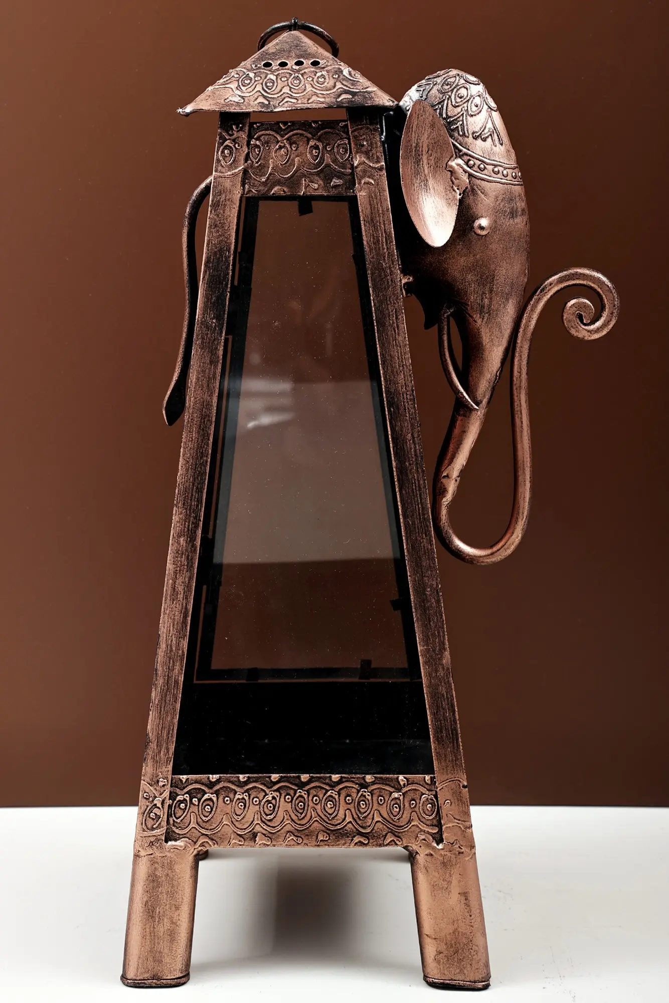 Infuse your space with a unique blend of rustic charm and exotic allure with this captivating decorative lantern. More than just a source of light, it's a conversation starter, a statement piece that reflects your appreciation for artistry and global design. Imagine the warm glow flickering within, casting intricate shadows and creating an ambiance of cozy sophistication in any room. This lantern is a testament to handcrafted beauty. Its design features an elephant motif, meticulously crafted from iron, adding a touch of playful elegance to its overall aesthetic. The rich, textured finish lends an antique feel, suggesting a story whispered across continents and generations. Whether you're looking to create a focal point on your mantelpiece or add a touch of bohemian flair to your patio, this lantern promises to be a treasured addition to your home decor.
