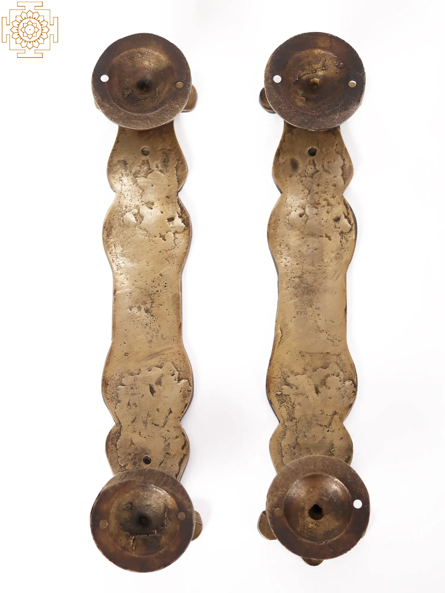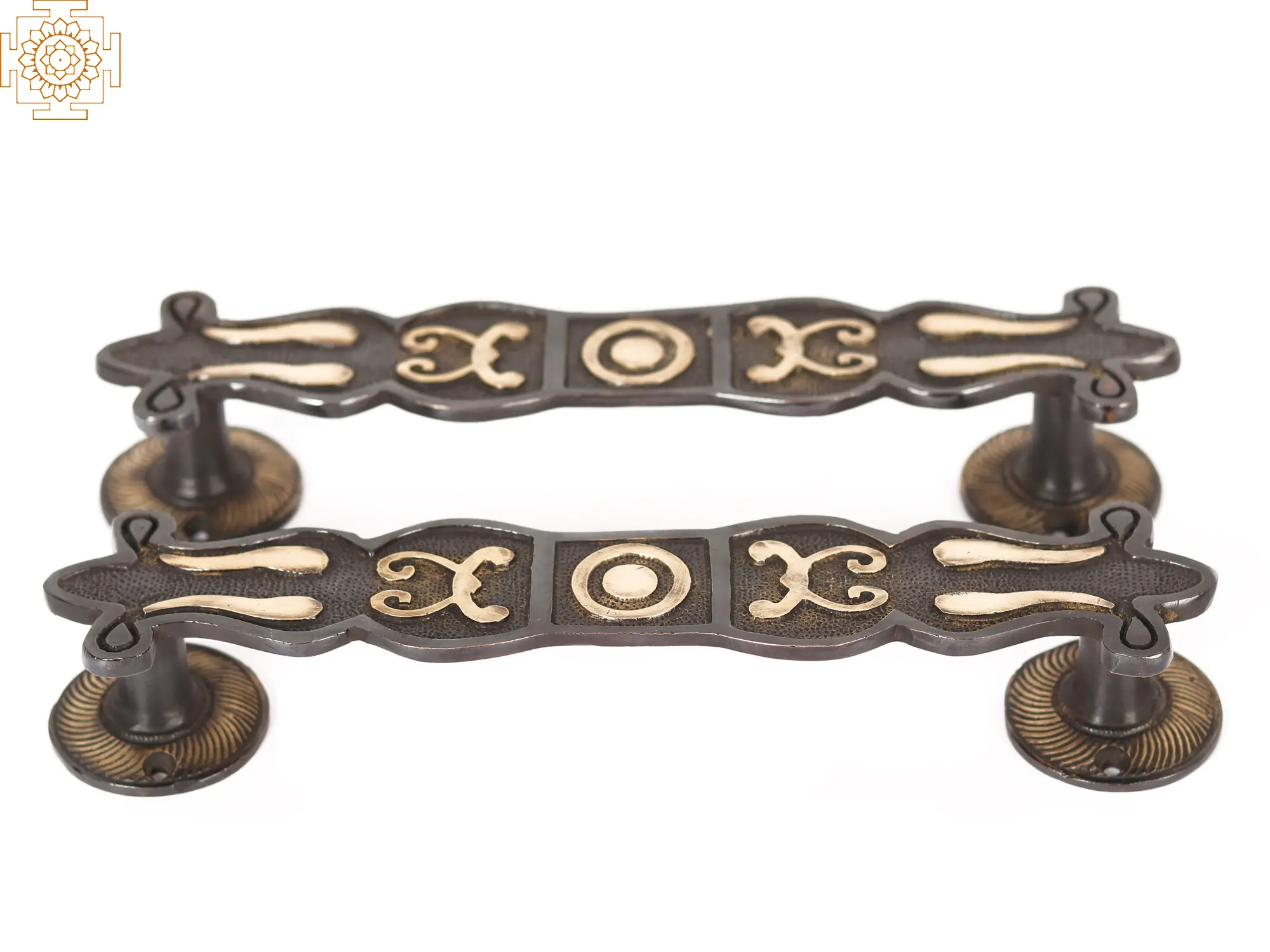 These door handles are made of high-quality brass and have a matt golden surface with a rough dark background. The combination of gold and black exudes classic beauty and durability. The sophisticated designs on the handles give this piece a modern appearance, while the brass material provides longevity, making these door handles perfect for both indoor and outdoor use.