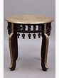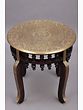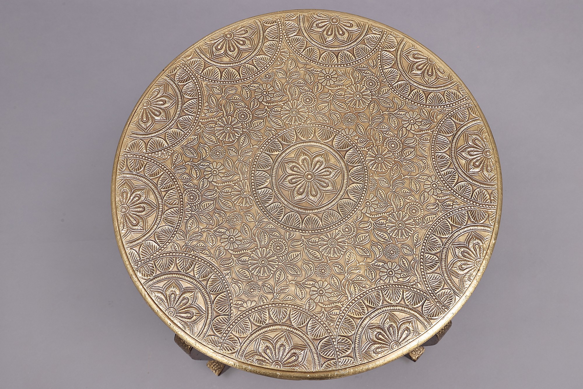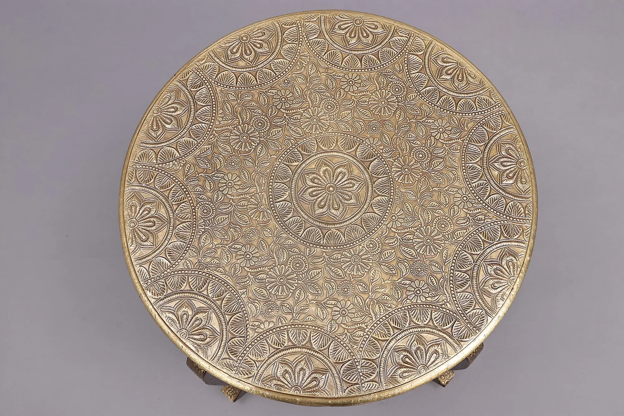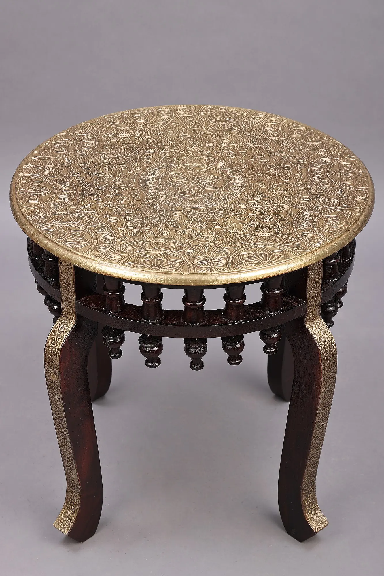 This round stool features a stunning brass-worked tabletop that adds a touch of opulence to any space. The intricate patterns etched into the brass create a visually captivating surface. The dark, rich tones of the mango wood provide a beautiful contrast, enhancing the overall aesthetic appeal. Delicate, handcrafted embellishments that hang from the undercarriage contribute to its distinctive personality. Brass accents adorning the legs enhance the piece's elegance and complement the ornate tabletop. The legs themselves have a subtle curve, giving the piece a touch of softness and grace.
