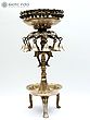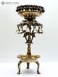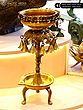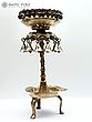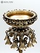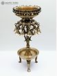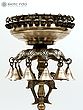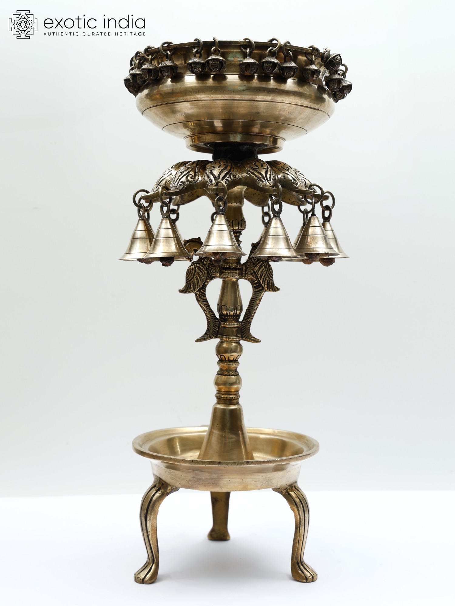 The urli boasts a stunning array of meticulously crafted details. The upper bowl is encircled by a delicate garland of tiny bells, their gentle chime adding a serene ambiance to any setting. Below, elegantly carved floral motifs and avian figures adorn the central stem, creating a visually captivating spectacle. Eight intricately detailed bells hang gracefully from the stem, further enhancing the piece's captivating allure. The sturdy three-legged base, with its ornate detailing, offers both stability and aesthetic appeal, completing the harmonious design. The smooth, polished brass finish reflects light beautifully, creating shimmering highlights that enhance its luxurious appearance.