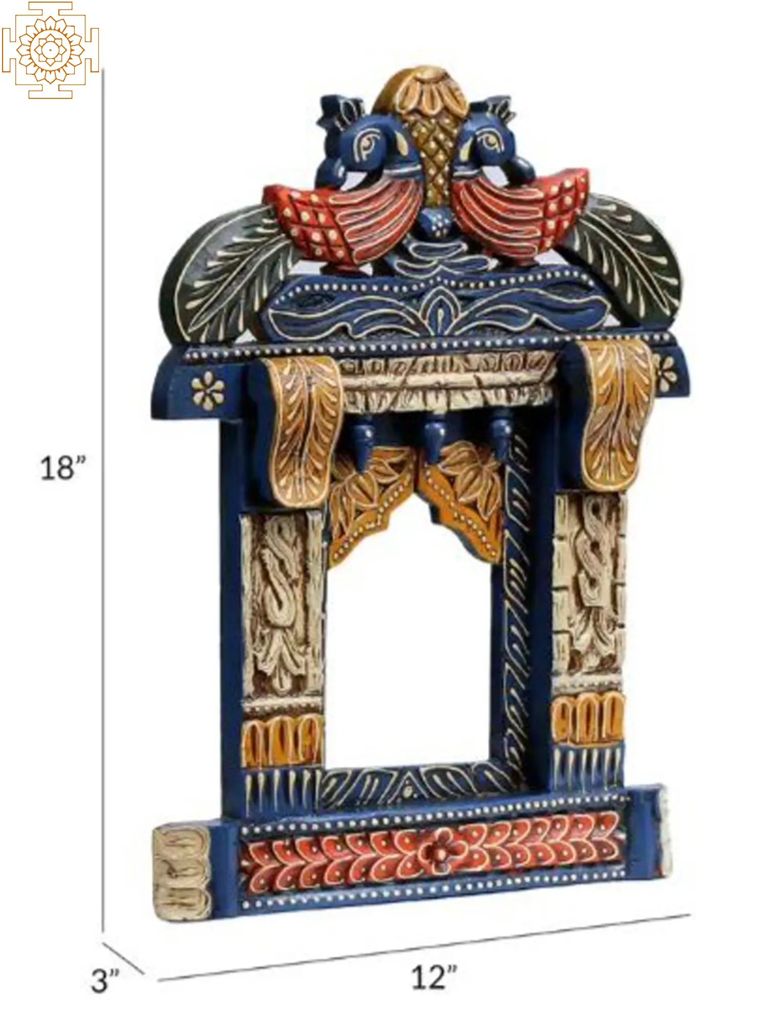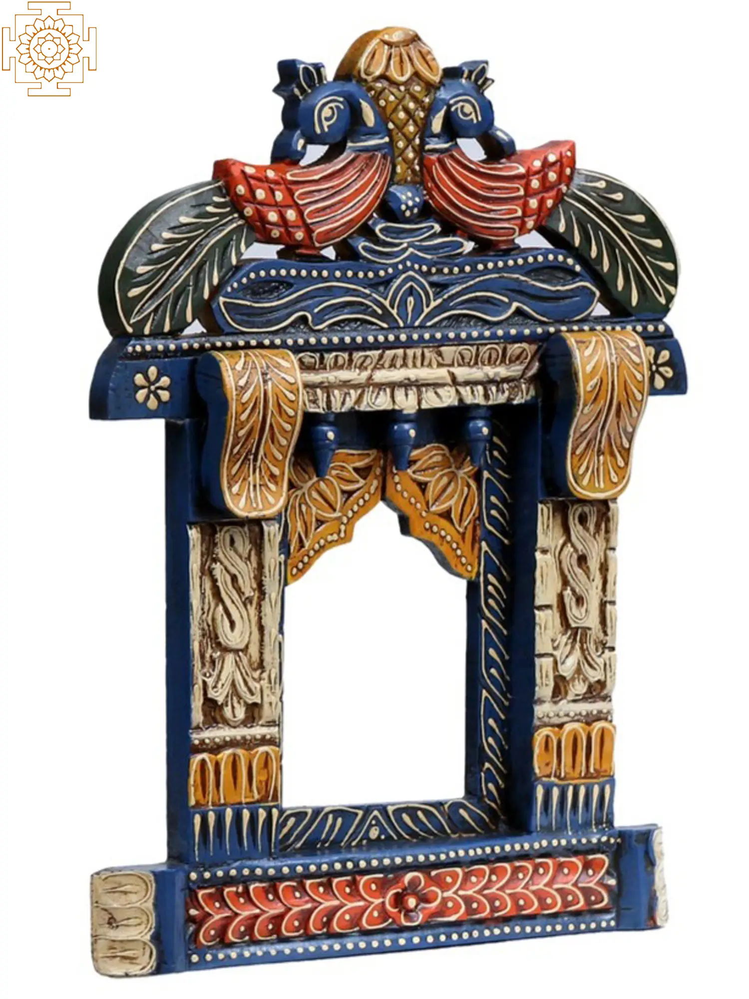 Made with sturdy wood and adorned with vivid colors, this wooden Jharokha, or traditional window wall hanging is a beautiful addition to the decor of those who adore the charm of traditional Indian art. Peacocks, symbols of royalty and divinity decorate the arch of the Jharokha, with floral and vegetation elements further beautifying the window. Infusing the small woodwork with architectural elements, the Jharokha has been crafted as a symbol of the ageless allure of Indian buildings.