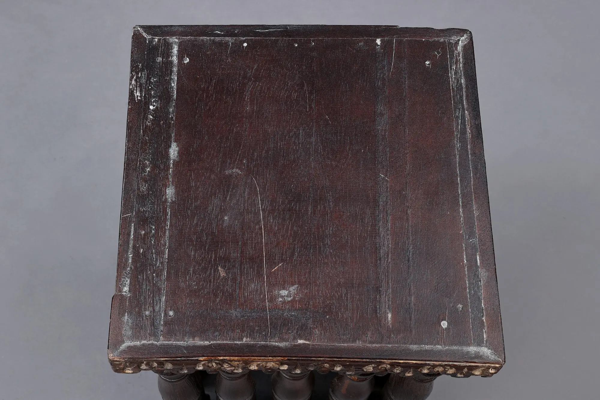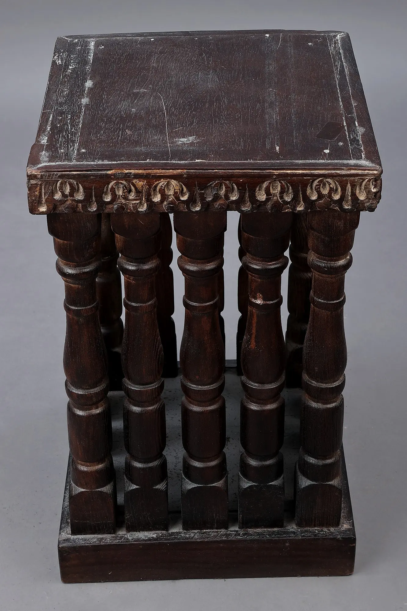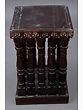 The table's distinctive silhouette features gracefully turned legs, reminiscent of classic spindle designs, lending an air of elegance and sophistication. The ornate carving that encircles the table top further enhances its visual appeal, adding a touch of intricate detail and character. Perfectly sized for a variety of uses, this table serves as a stunning accent piece in your living room, bedroom, or entryway. Use it to display cherished photographs, hold a bedside lamp, or simply provide a convenient surface for your everyday essentials. It complements a wide range of interior styles, from bohemian and eclectic to traditional and contemporary.
