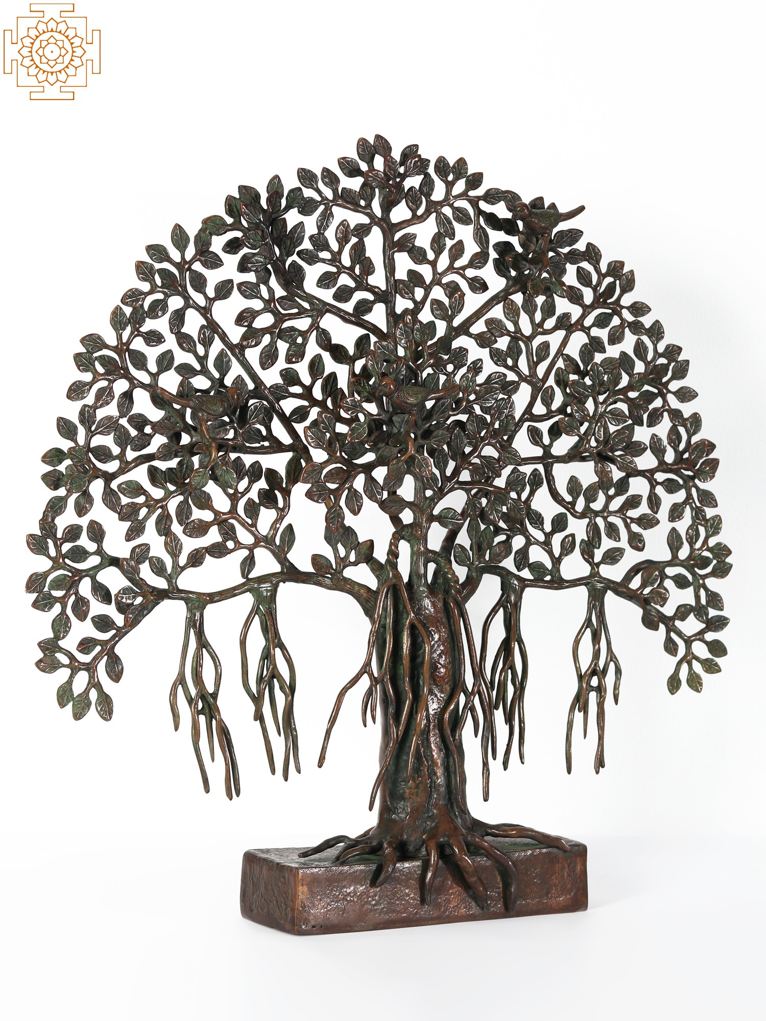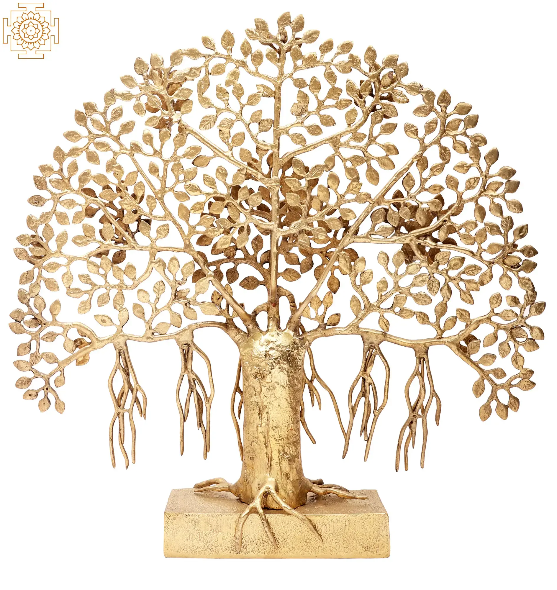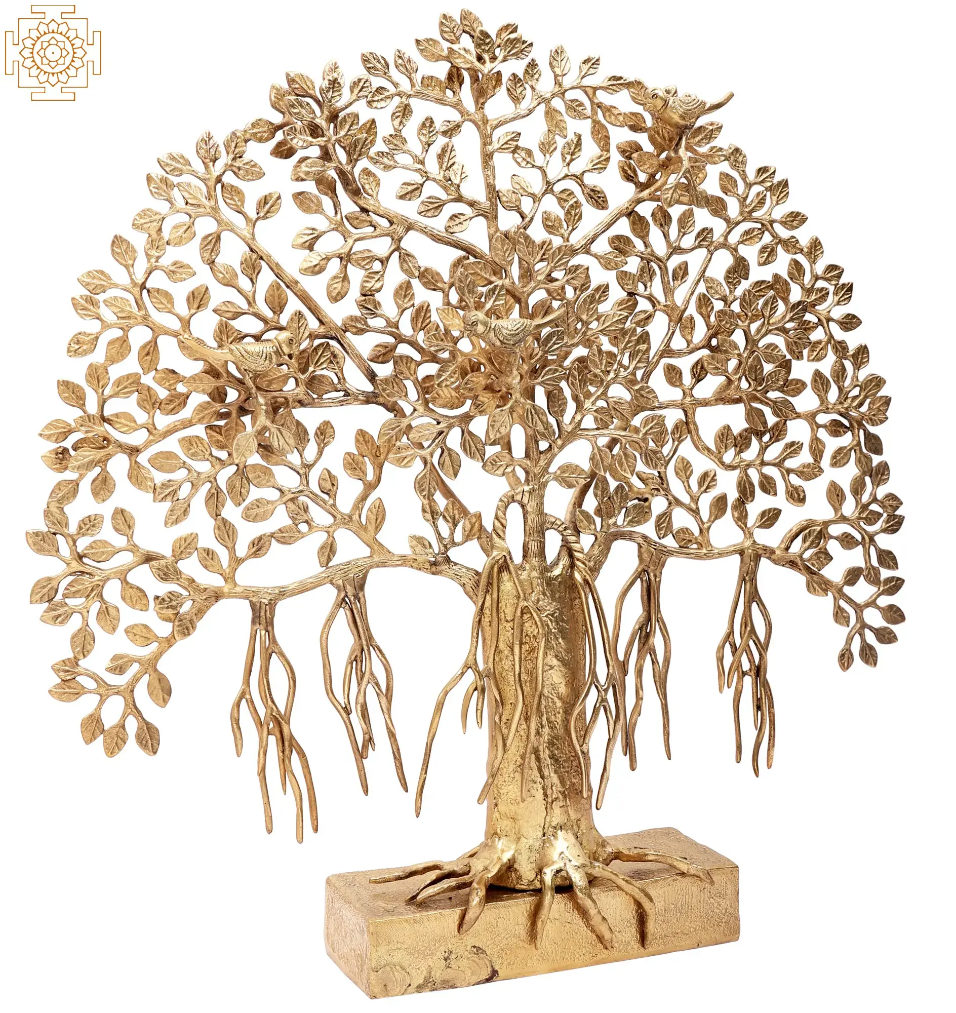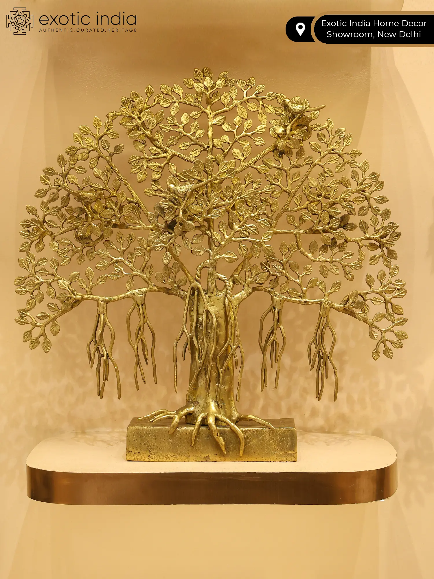 This Large Tree of Life is a magnificent oeuvre dedicated to the majesty of the Aswatha tree or the Bodhi tree, which exudes imperial magnificence. Aswatha Vruksha, or the Peepal Tree, is mentioned in many ancient texts as a holy tree and the king of trees. Its roots are said to grow vertically, while its branches grow downwards. This brass tree has been created with amazing workmanship and features a harmonic combination of brass, a long-lasting material, and natural beauty. Brass-colored birds perch gracefully on the branches, adding to the scene's magnificence. The Aswatha tree's mighty roots going downwards to connect with the sanctified soil provide witness to the fabled description of the Aswatha tree. A spectacular array of painstakingly arranged brass leaves spreads outwards, each one meticulously crafted, providing a breathtaking display of artistry. This masterwork is a must-have for everyone who enjoys infusing mythology into their home decor.