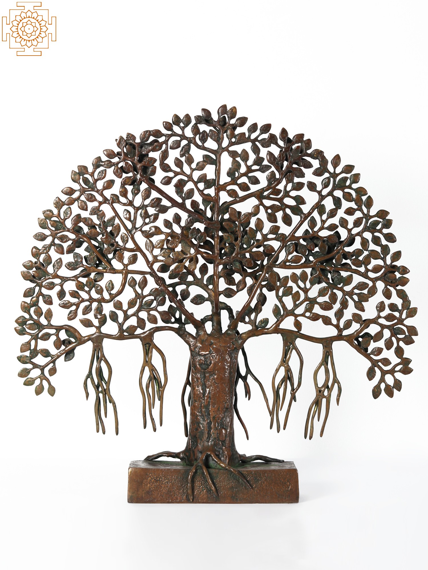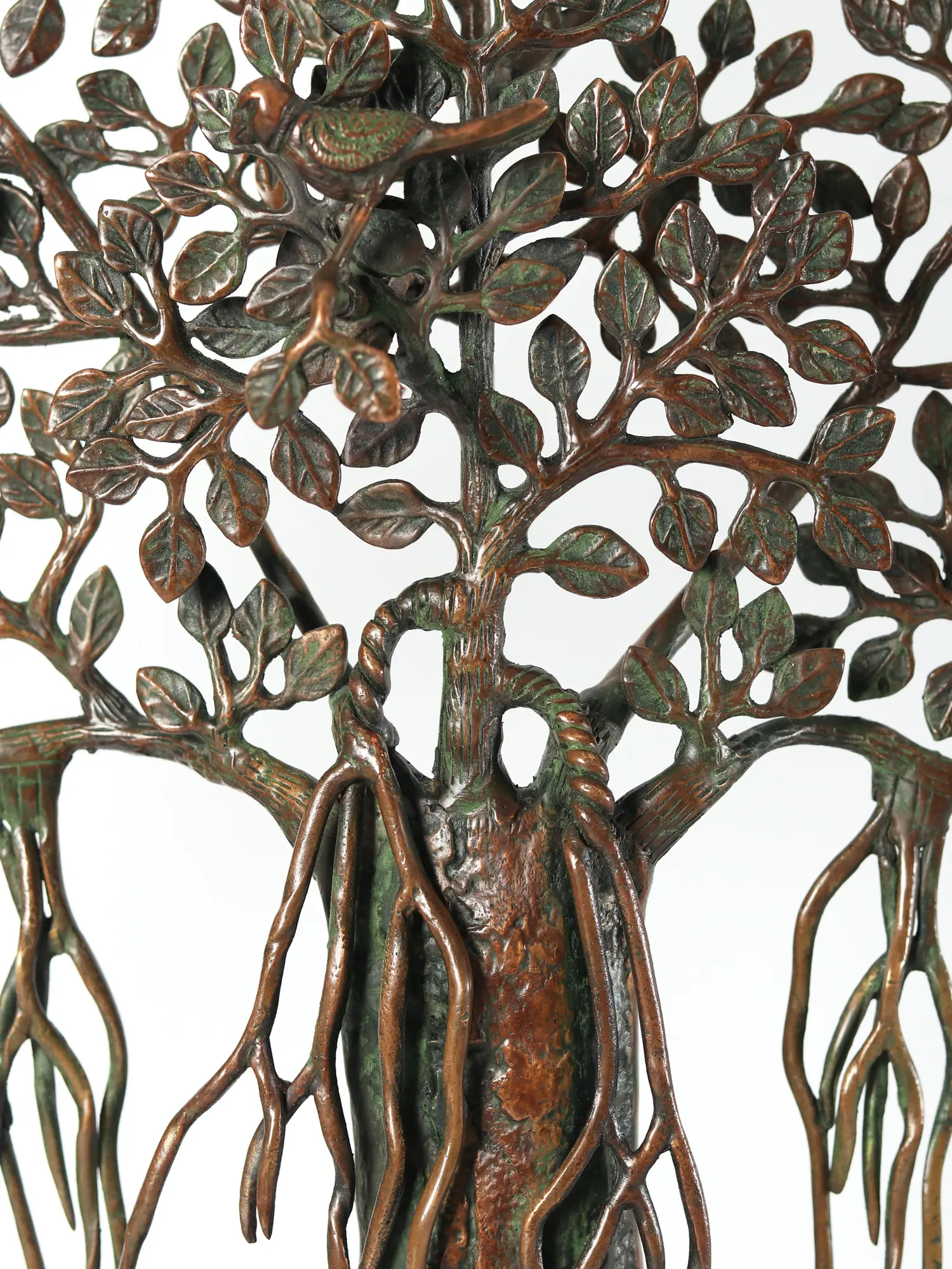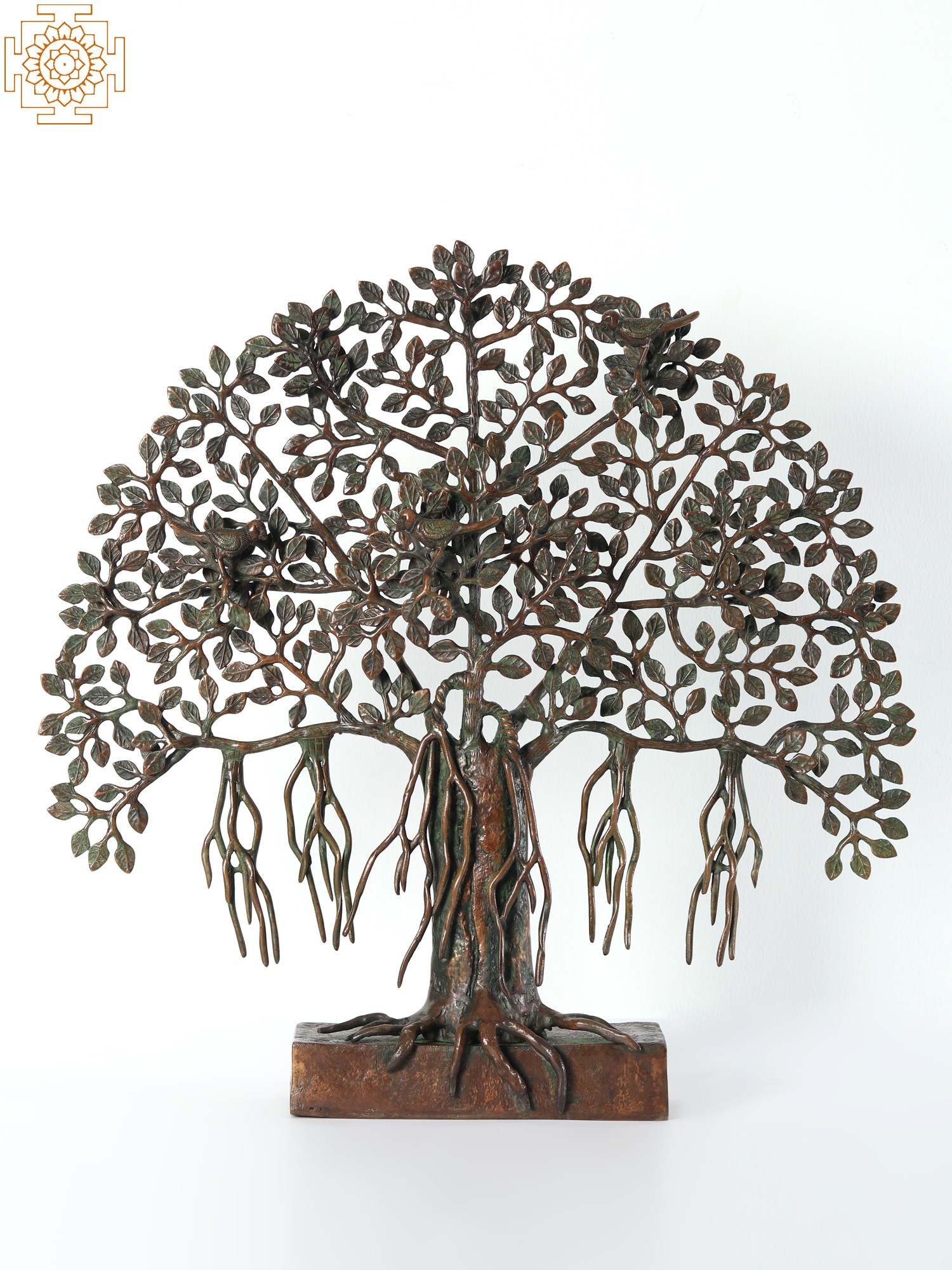 This Large Tree of Life is a magnificent oeuvre dedicated to the majesty of the Aswatha tree or the Bodhi tree, which exudes imperial magnificence. Aswatha Vruksha, or the Peepal Tree, is mentioned in many ancient texts as a holy tree and the king of trees. Its roots are said to grow vertically, while its branches grow downwards. This brass tree has been created with amazing workmanship and features a harmonic combination of brass, a long-lasting material, and natural beauty. Brass-colored birds perch gracefully on the branches, adding to the scene's magnificence. The Aswatha tree's mighty roots going downwards to connect with the sanctified soil provide witness to the fabled description of the Aswatha tree. A spectacular array of painstakingly arranged brass leaves spreads outwards, each one meticulously crafted, providing a breathtaking display of artistry. This masterwork is a must-have for everyone who enjoys infusing mythology into their home decor.