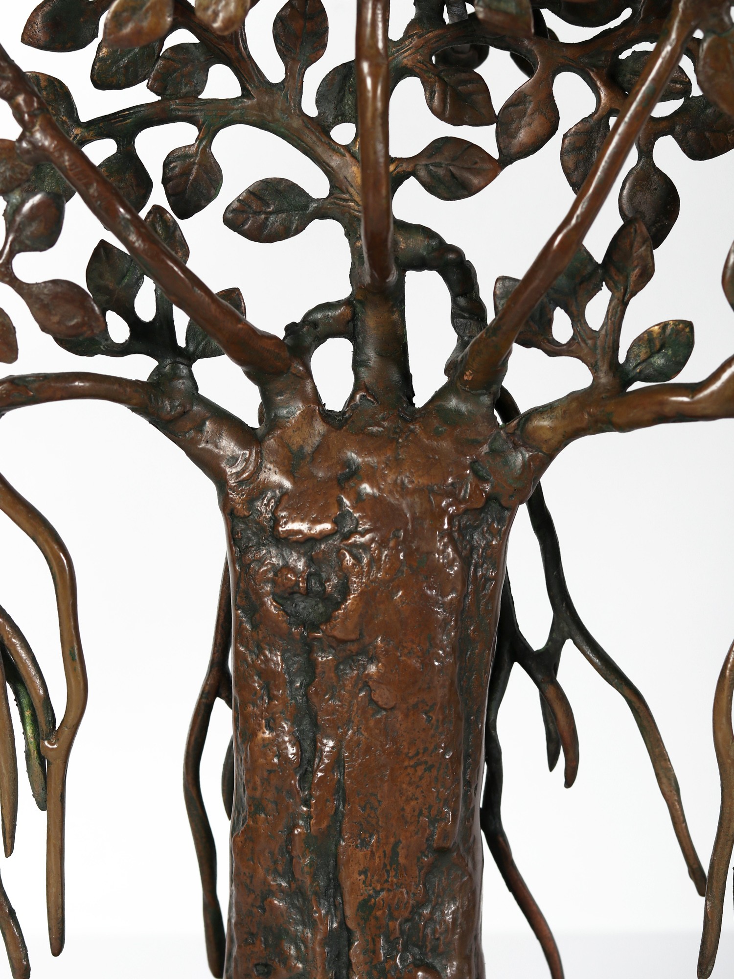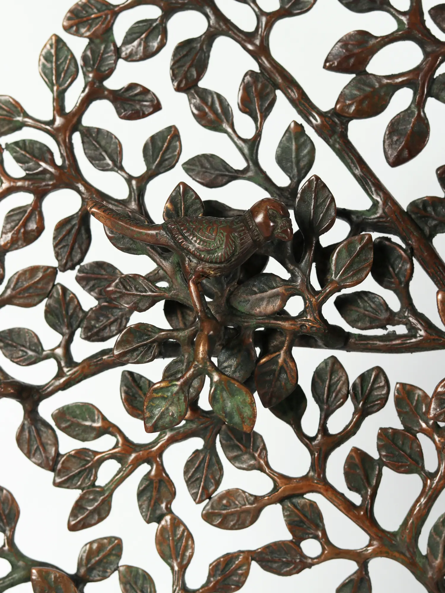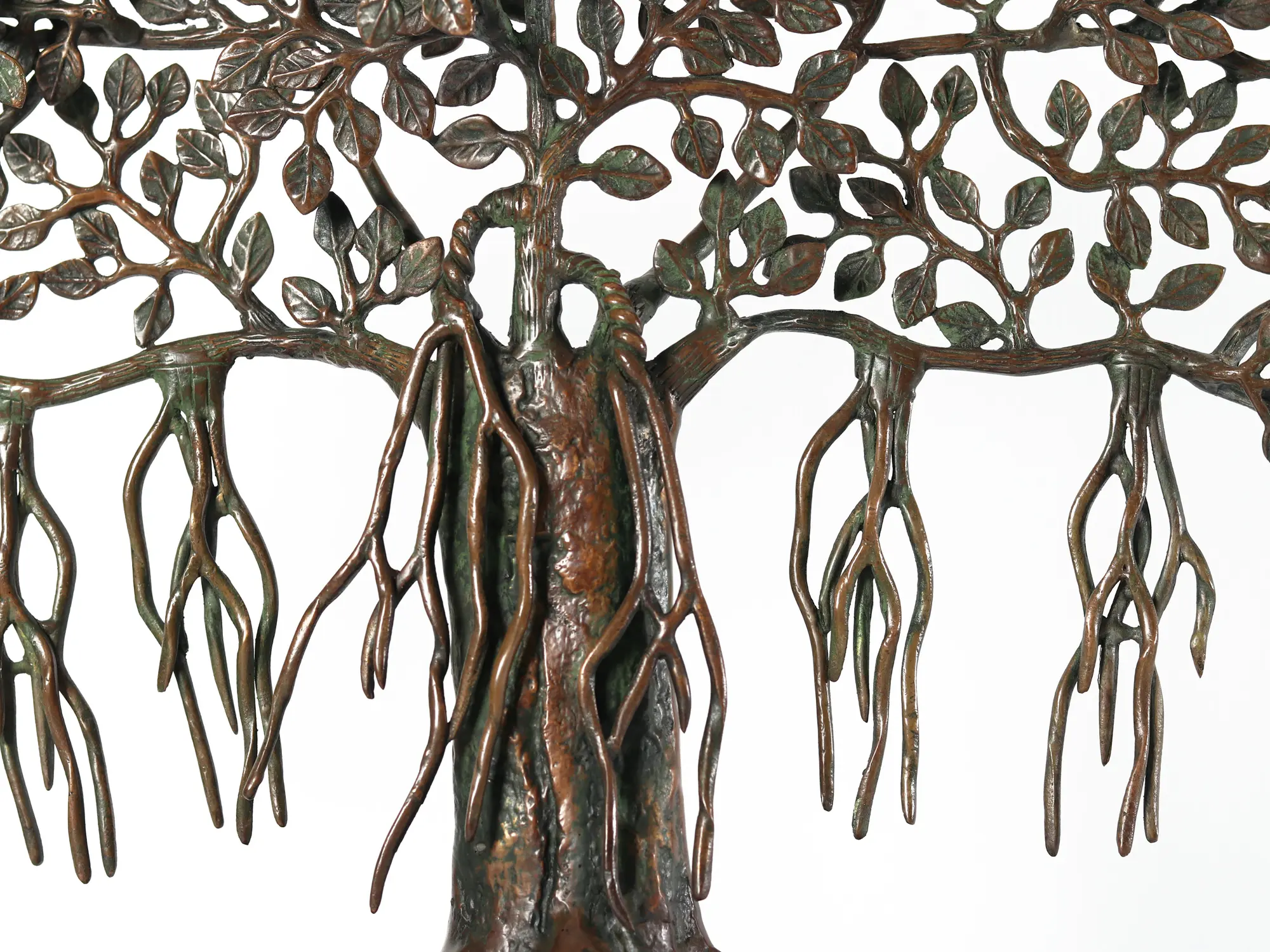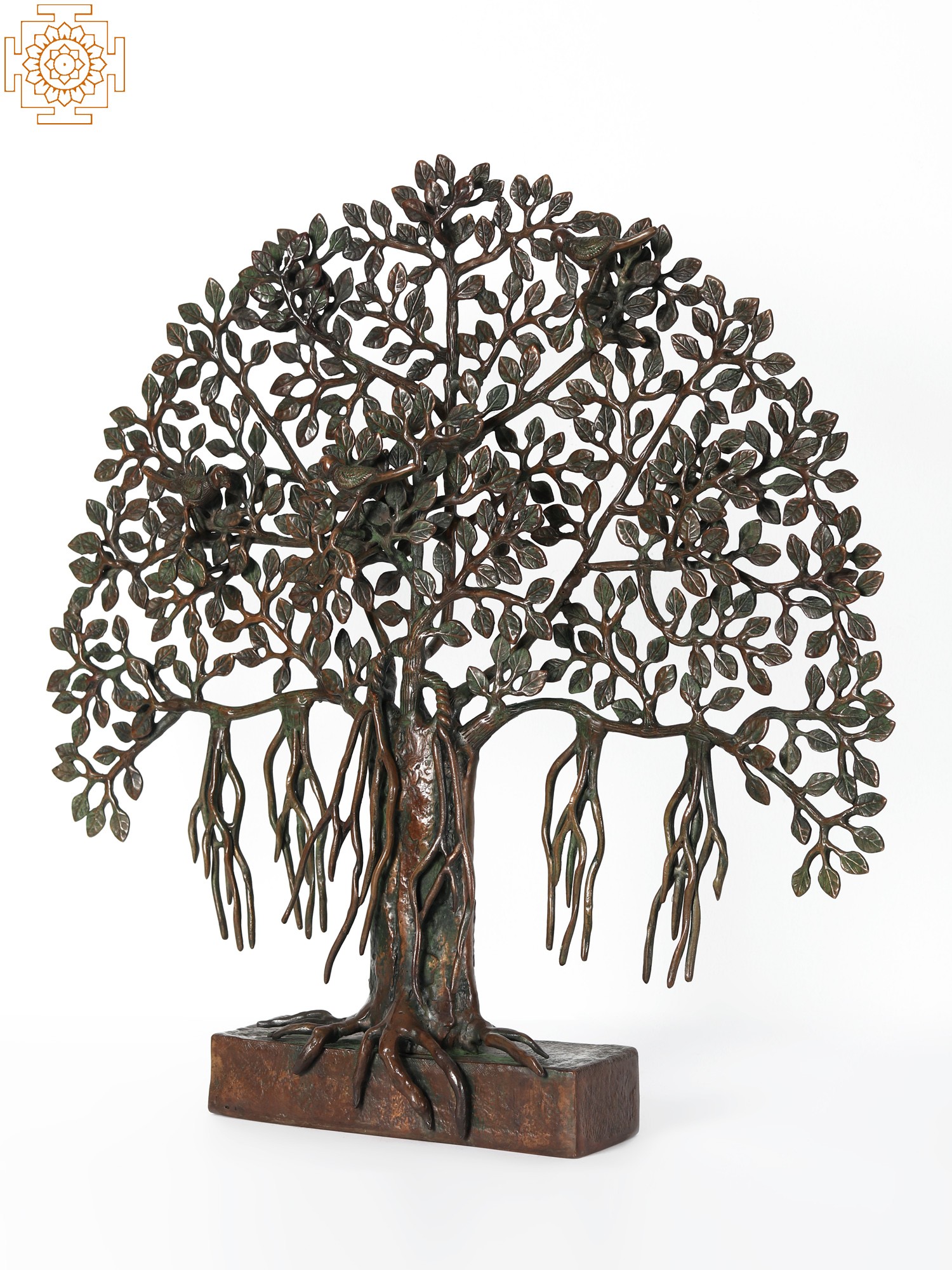 This Large Tree of Life is a magnificent oeuvre dedicated to the majesty of the Aswatha tree or the Bodhi tree, which exudes imperial magnificence. Aswatha Vruksha, or the Peepal Tree, is mentioned in many ancient texts as a holy tree and the king of trees. Its roots are said to grow vertically, while its branches grow downwards. This brass tree has been created with amazing workmanship and features a harmonic combination of brass, a long-lasting material, and natural beauty. Brass-colored birds perch gracefully on the branches, adding to the scene's magnificence. The Aswatha tree's mighty roots going downwards to connect with the sanctified soil provide witness to the fabled description of the Aswatha tree. A spectacular array of painstakingly arranged brass leaves spreads outwards, each one meticulously crafted, providing a breathtaking display of artistry. This masterwork is a must-have for everyone who enjoys infusing mythology into their home decor.
