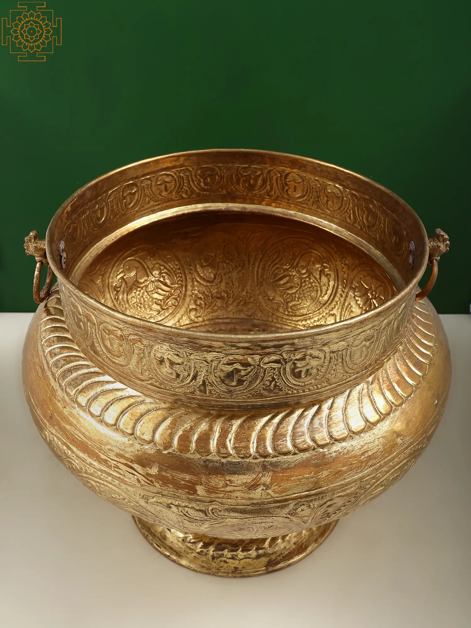 A piece of artistic mastery and beauty, this copper and brass flower planter has been crafted like a Kalash or pot, an integral part of Hindu rituals. The mouth of the pot has been decorated with floral details, followed by the figures of a Hamsa or swan holding the branch of Kalpavriksha in its beak, a combined motif in Indian art that symbolizes heavenliness and abundance, outlined by floral creepers which are synonymous with growth of life and youthfulness. Embraced by these symbols of life, your plant will be protected from weather and external contamination by the purifying copper and brass, making this flower pot a beautiful and useful addition to your space.