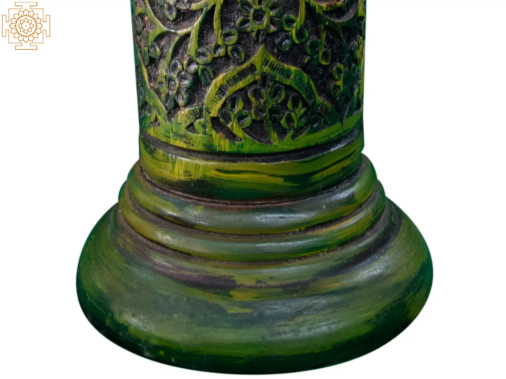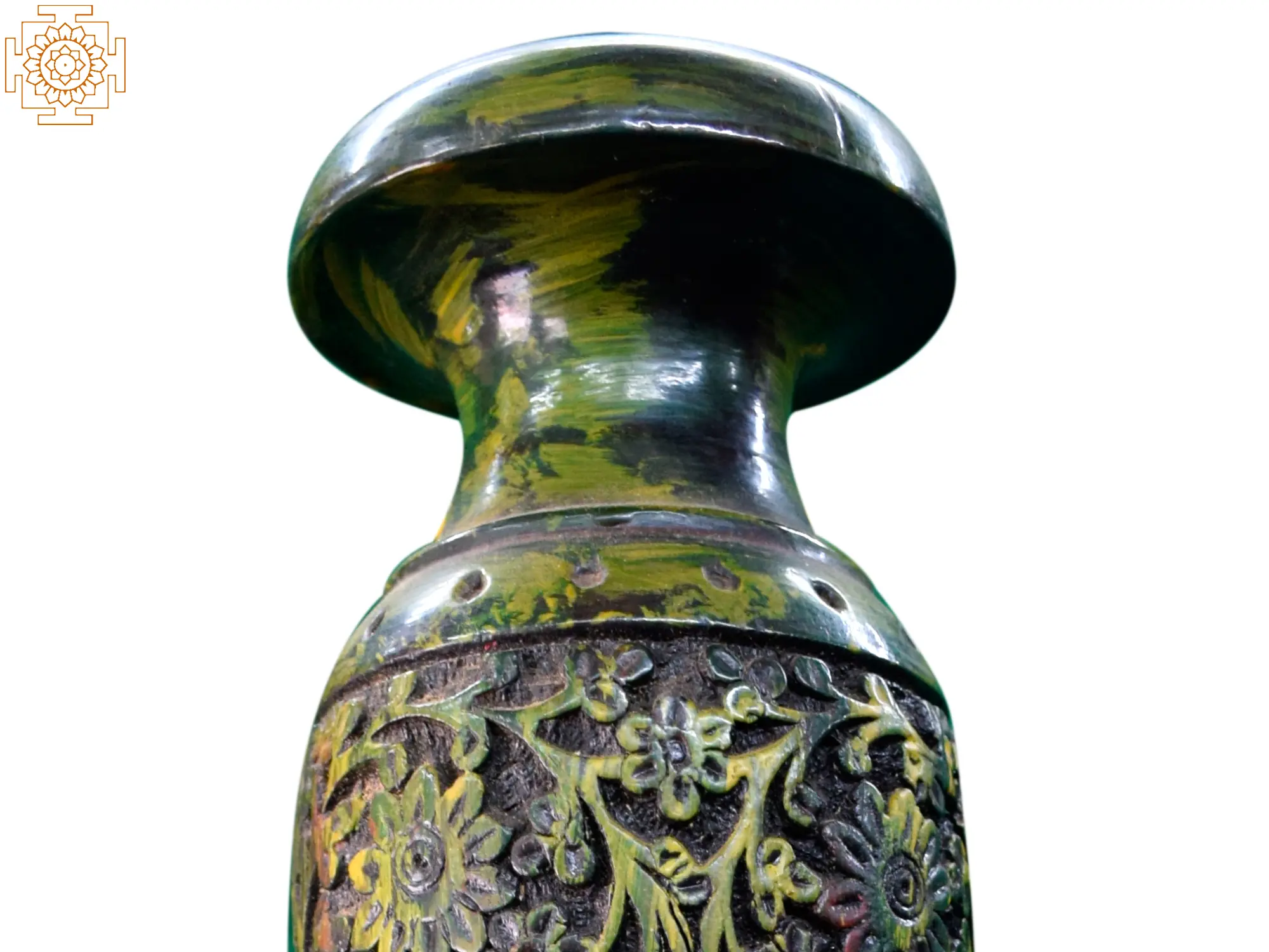 Its mesmerising floral motifs elevate a simple container into a vessel of artistry. Its cylindrical shape gracefully cradles the essence of blossoms, while the warm embrace of oak wood lends a touch of regal beauty. This wooden handicraft not only serves as a container for flora delights, but it also whispers narratives of artistic mastery. This vase, representing the harmony between human ingenuity and nature’s richness, is a celebration of form and function, a conduit between the concrete and the sublime.