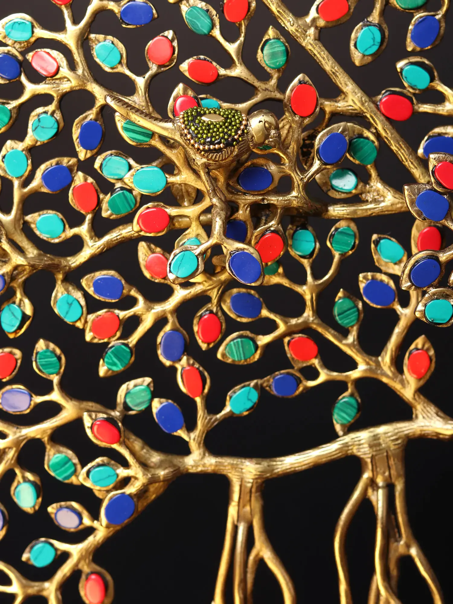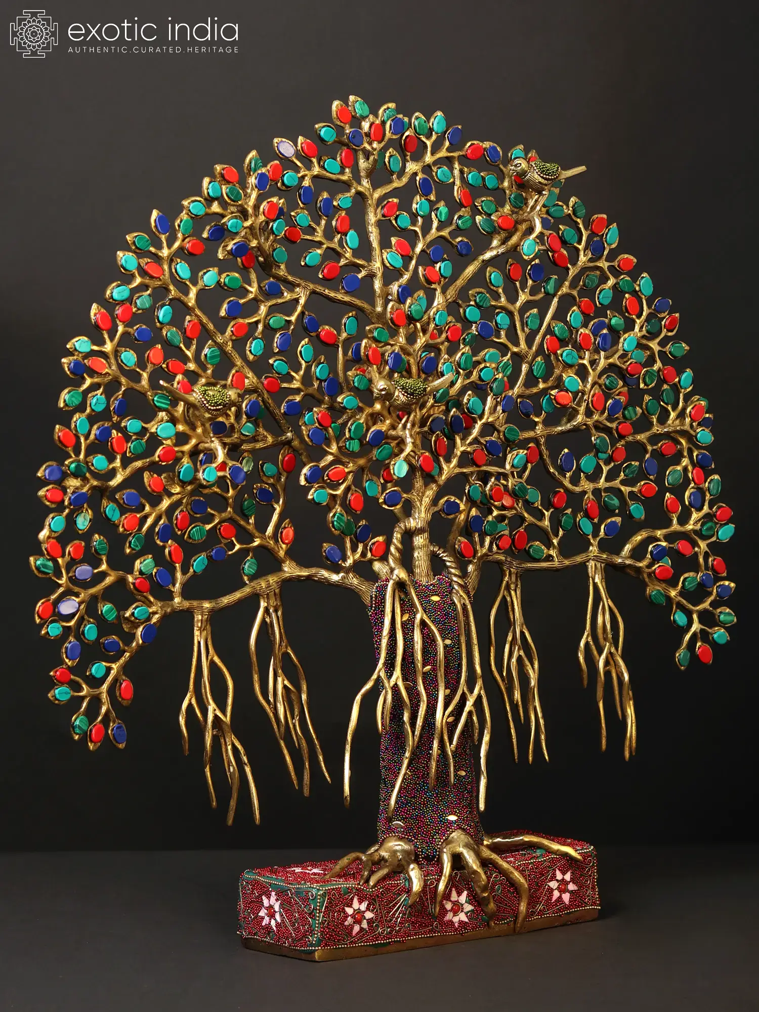 This Tree of Life is uniquely captivating as it embodies the symbolism of a Banyan tree, showcasing roots extending both from branches and actual roots. The incorporation of brass birds perched on the branches adds a delightful touch, enhancing the overall charm. This exquisite piece not only fulfills the innate human desire for color but also resonates with cultural and natural symbolism.