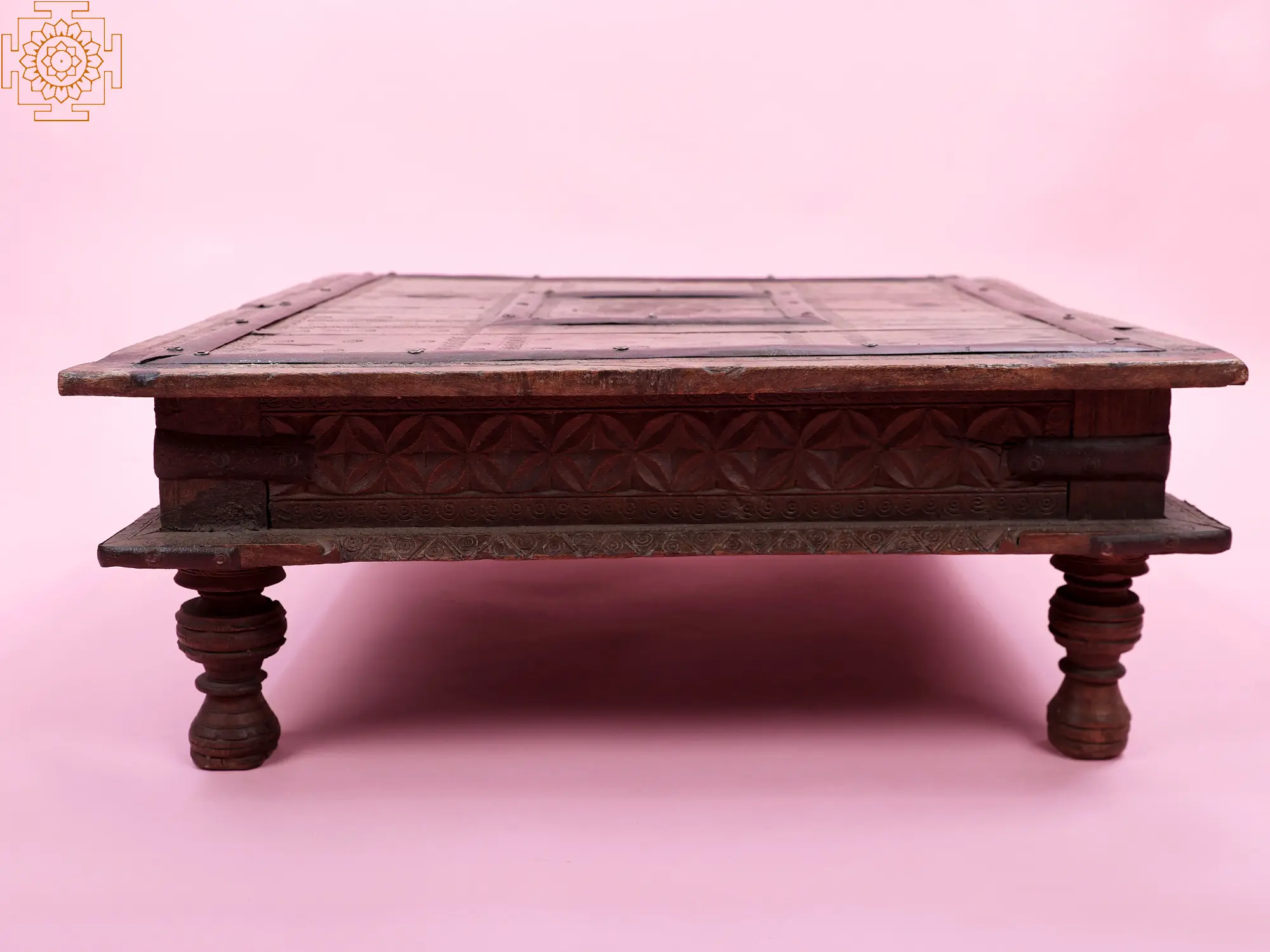 More than just a functional item, this wooden chowki serves as a versatile decorative accent. Its generous surface area makes it ideal for displaying cherished artifacts, sculptures, potted plants, or even a traditional diya during religious ceremonies. It can be used as a side table in a living room, a decorative stand in a hallway, or a spiritual centerpiece in a prayer room. The rustic charm and handcrafted appeal make it a perfect addition for those who appreciate unique, character-filled items that tell a story.