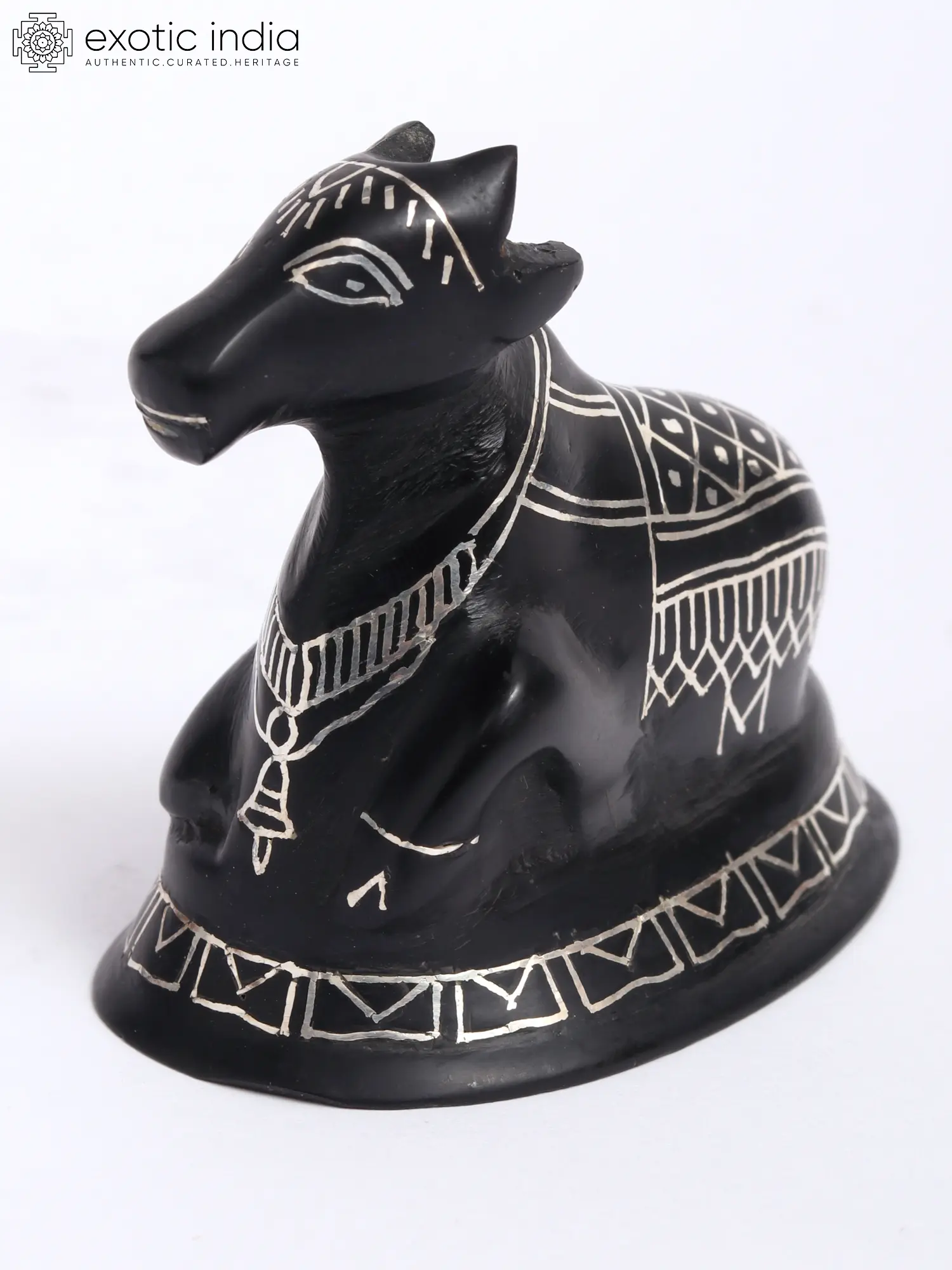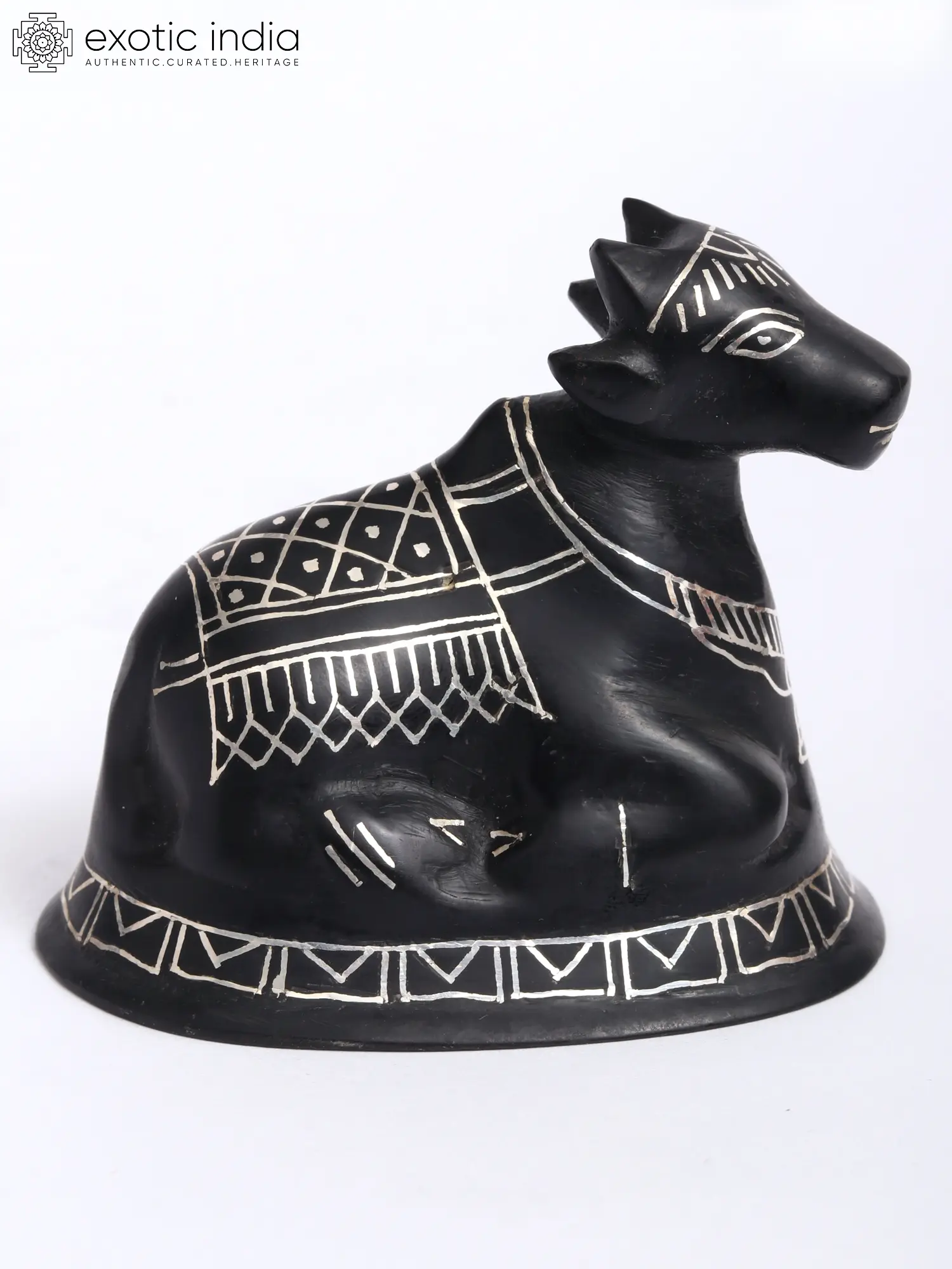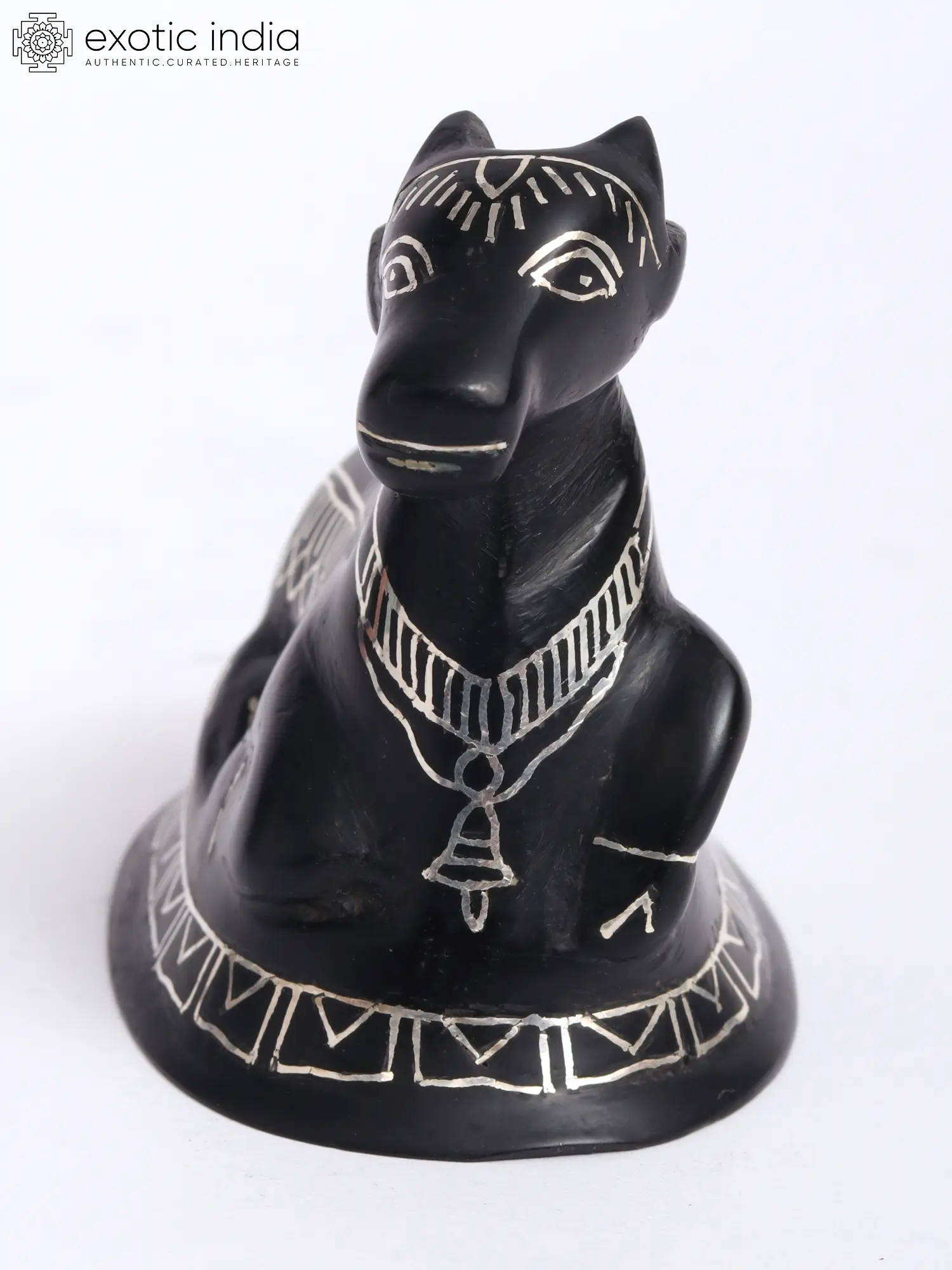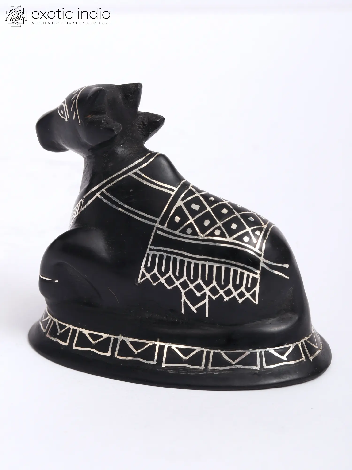 This Nandi Idol, adorned with Real Silver Work in Bidri Artwork, crafted from Gunmetal with Real Silver, radiates spiritual energy and reverence. Nandi, the divine bull and vehicle of Lord Shiva, symbolizes strength, devotion, and auspiciousness in Hindu mythology. The intricate Bidri art, with its intricate patterns and silver detailing, adds to the idol's sacred aura, elevating the spiritual ambiance of any space.