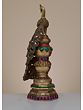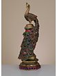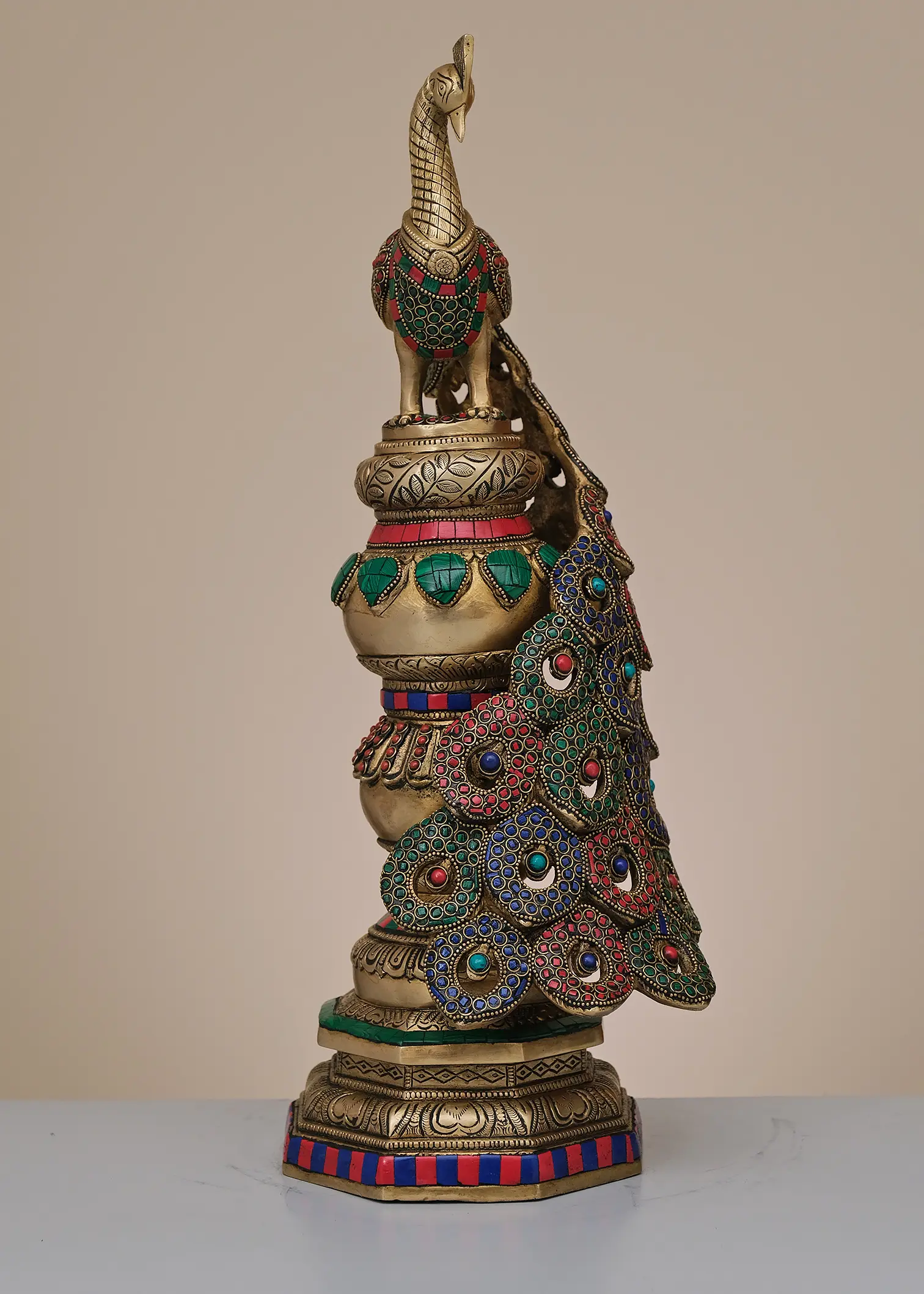 Tiny vivid inlay pieces are studded all over the feathers of the bird which embrace the pillar gently, to recreate their gorgeous appeal. On the reverse of the statue, the pillar's structure is visible, shaped like three pots placed over one another, creating a beautiful symmetry. As a symbol of Indian culture’s ageless love for the peacock, this brass inlay artwork will add a touch of royalty to your ambiance.