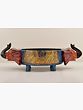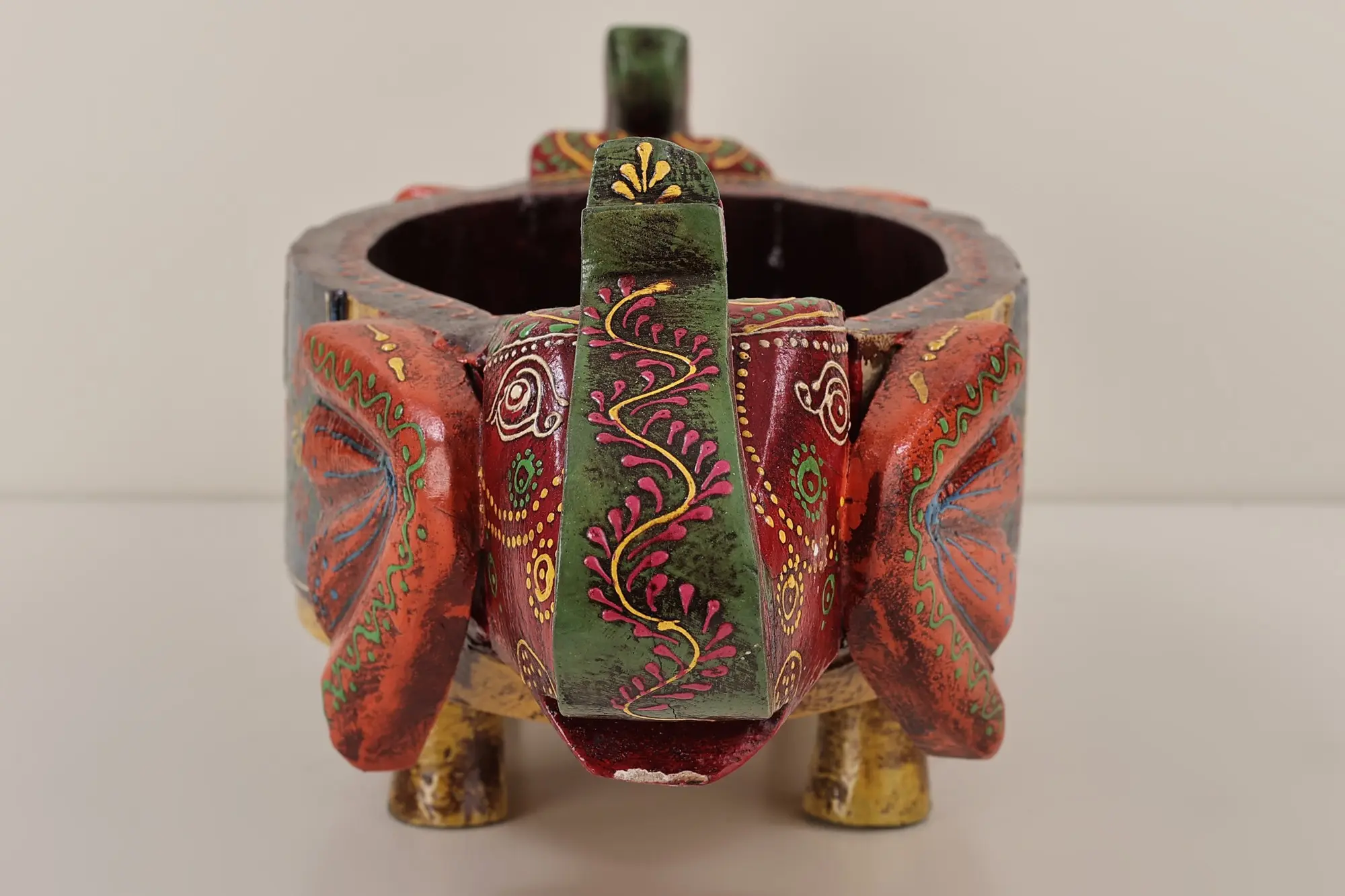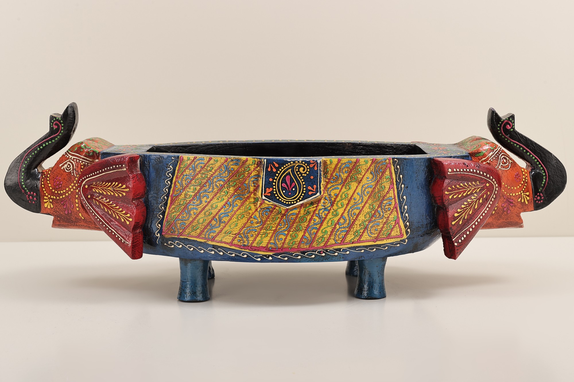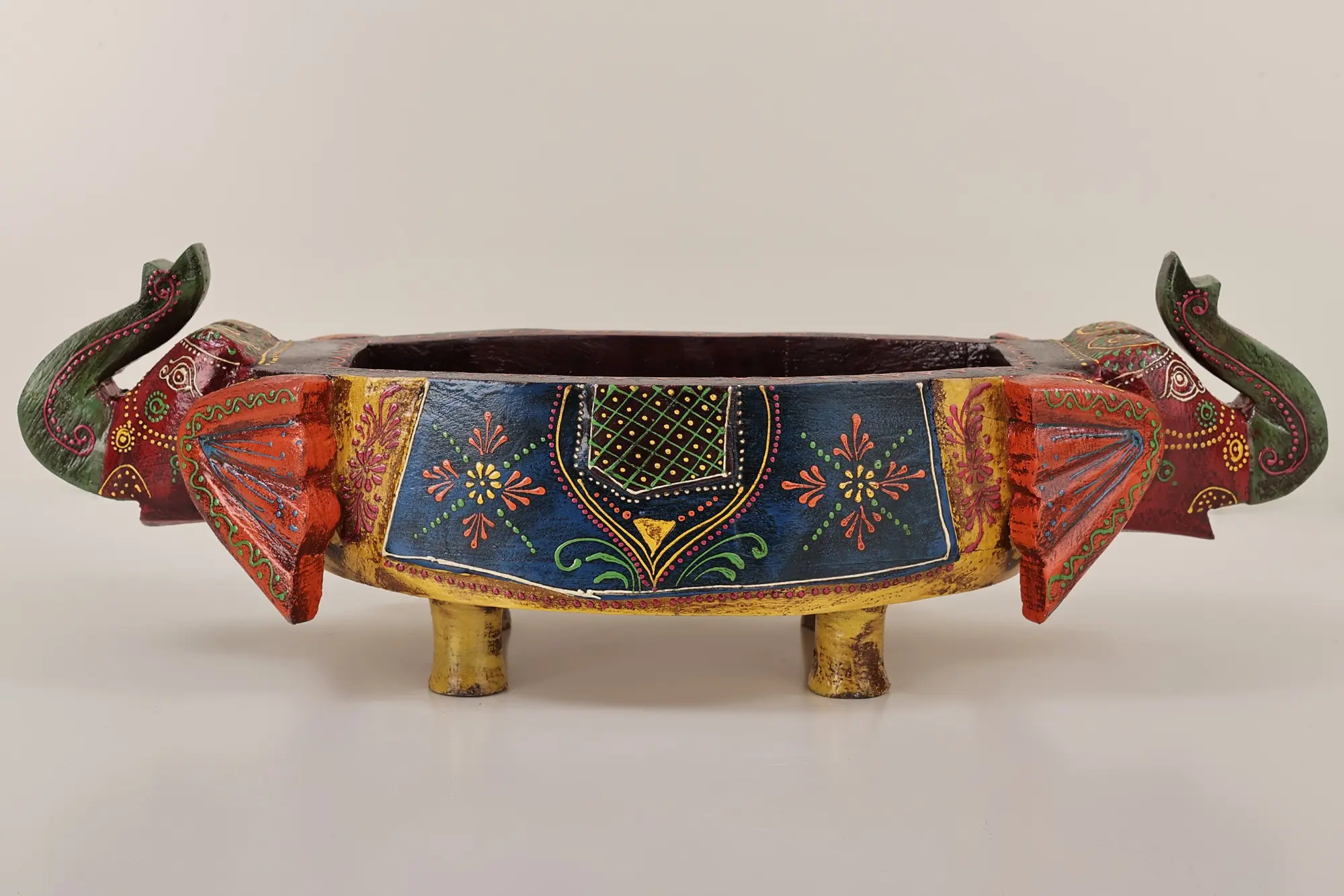 This exquisite Hand Painted Elephant Decorated Boat, crafted from Mango Wood, is a testament to the artistry of Jodhpur. Adorned in the traditional style of lines and dots, this boat boasts a vibrant color palette that breathes life into any space. Standing on four intricately designed legs, it showcases two majestic elephant heads on either side, adding a touch of regality. The meticulous detailing captures the essence of Jodhpur's rich artistic heritage, making it a stunning piece that merges tradition with contemporary decor. This unique creation invites a sense of cultural allure and artistic finesse into your home or office.