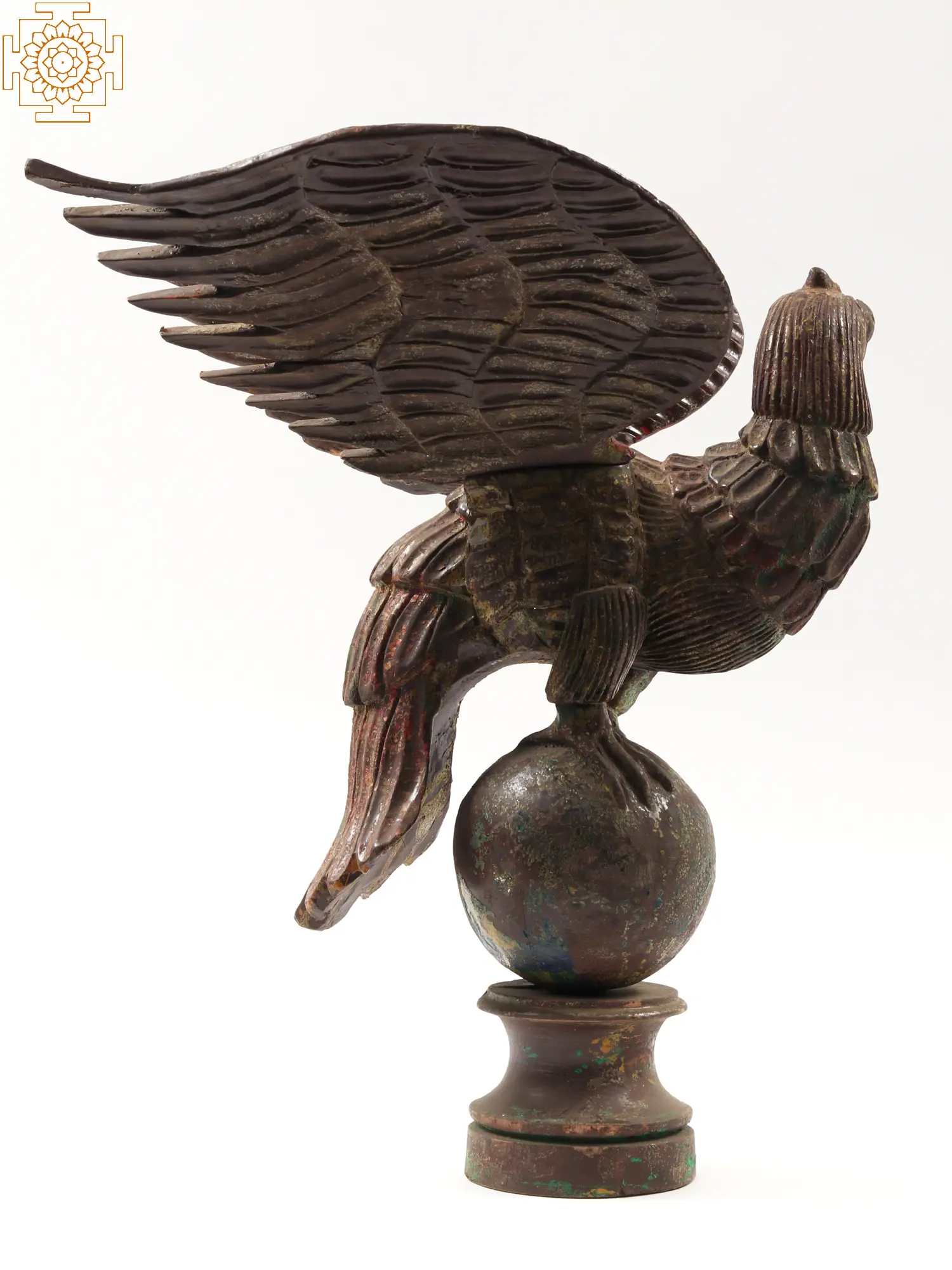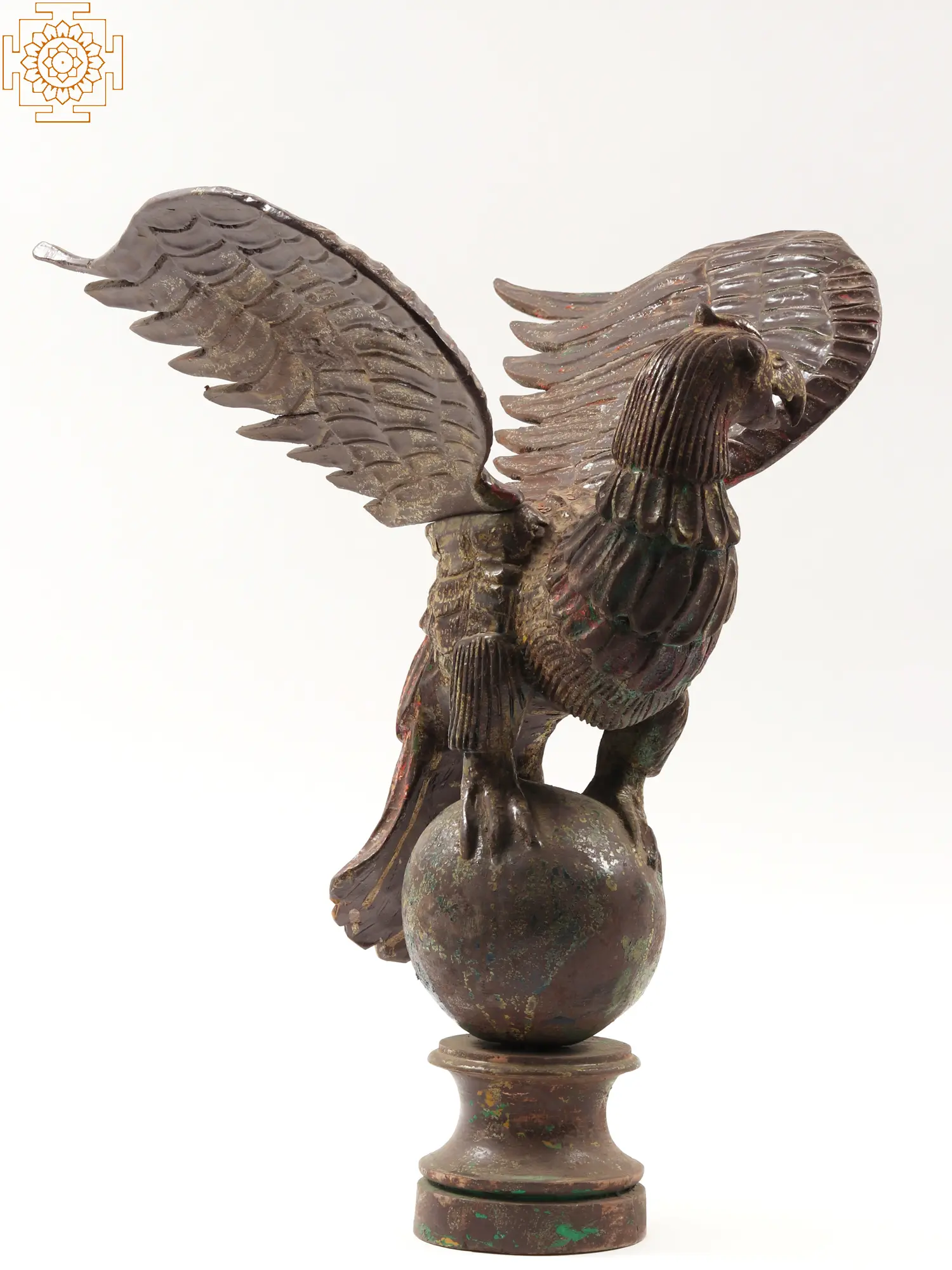 Elevating the eagle both literally and figuratively is the design choice of its placement atop a sphere. This unique presentation adds a touch of the extraordinary to the sculpture. The sphere suggests the world itself, positioning the eagle as a dominant force surveying its domain. The base upon which the sphere rests provides a stable foundation, ensuring that the sculpture remains a focal point without being overwhelming. The combination of the bird, the sphere, and the base creates a cohesive and visually intriguing composition that is sure to spark conversation.