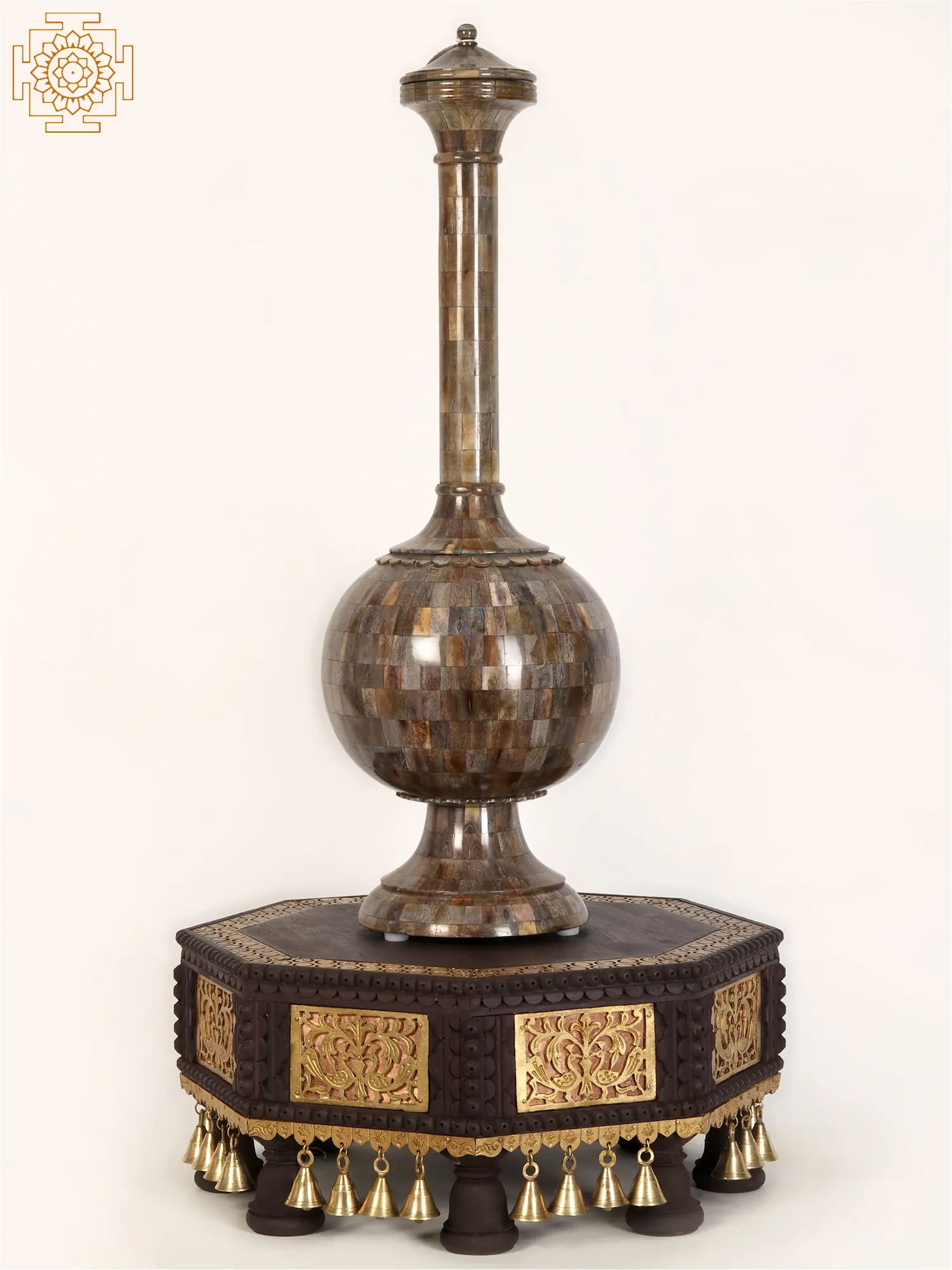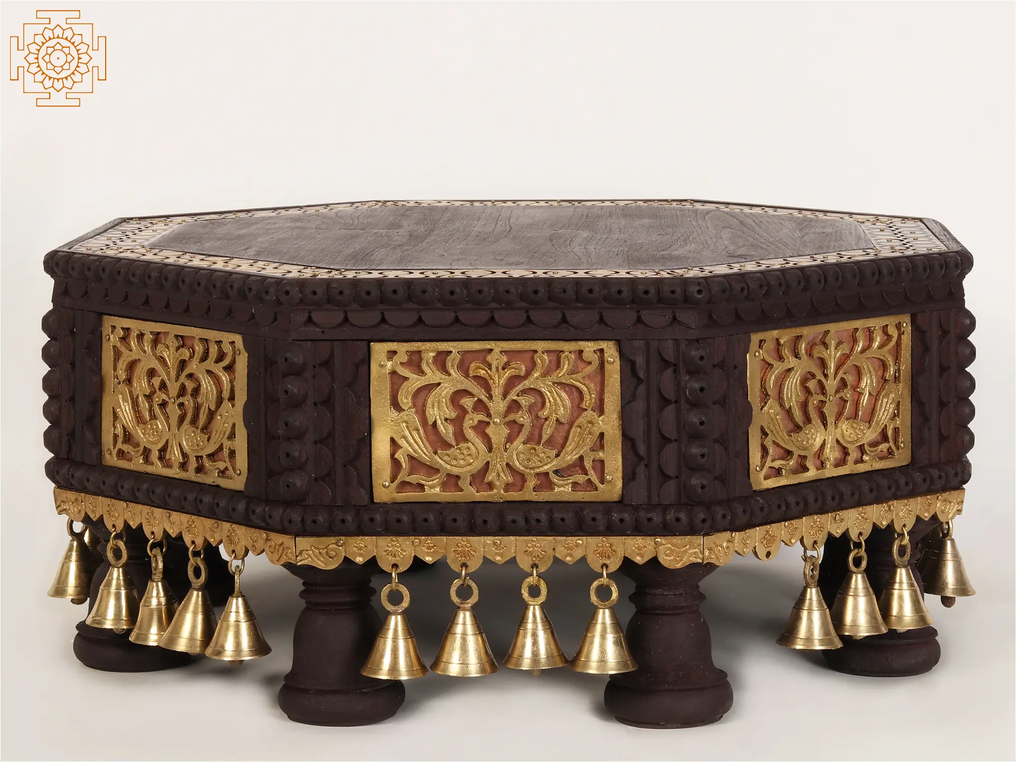 This Wooden Octagonal Shape Designer Chowki/Pedestal with Dangling Bells not only serves as a cultural statement in home decor but also offers practical usability. With intricate twin peacock motifs and a beautifully adorned upper part, it becomes a visually captivating piece. The addition of ghungroos at the bottom adds an auditory element, enhancing its charm.