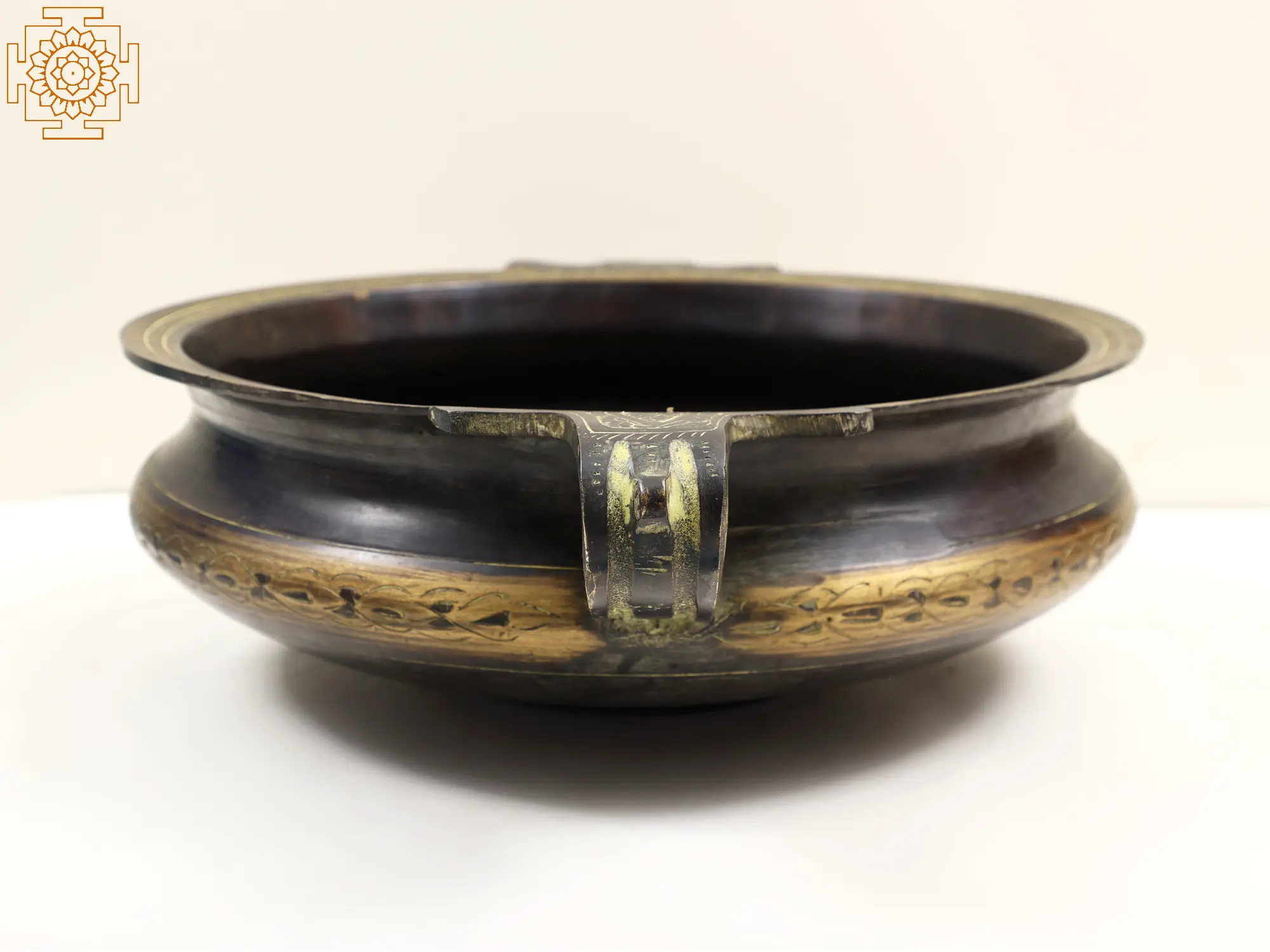 Urli is a decorative piece that is in the shape of a bowl to be filled with water and fragrant flowers. The beautiful Brass Urli bowl that you see here is perfectly handcrafted by the artisans of South India. Observe, on the inner base, the intricate detailing of floral designs around two lovers admiring each other and celebrating their love. You can Keep this Urli bowl in your living room, balcony, or even in the Puja area to enhance the appearance of the room.