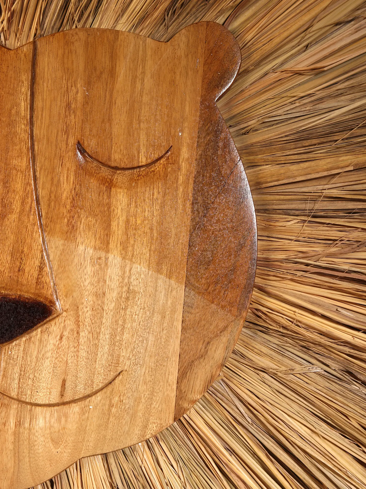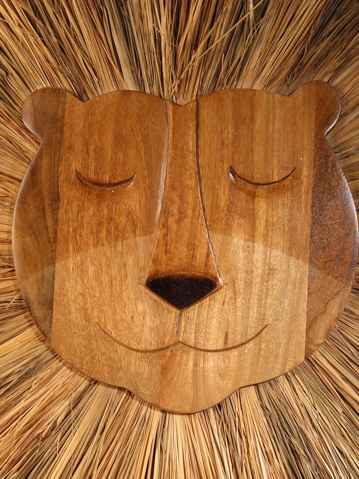 “A lion sleeps in the heart of every brave man”. An ode and remembrance to the lion, a symbol of power and fearlessness that lives within us all, this decorative wall hanging is an edgy yet harmonizing home decor item. The lion's face carved in wood with simple details appears to be gently smiling, with its eyes closed meditatively and its mouth curving in a smile. The grass is used by the artist to depict the mane of the lion, perfectly fusing with the color of the wood, adding a contrasting texture to its polished surface, creating an artwork that will be a conversation starter.