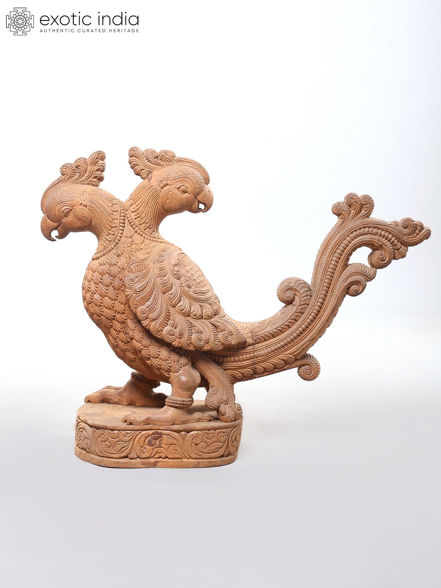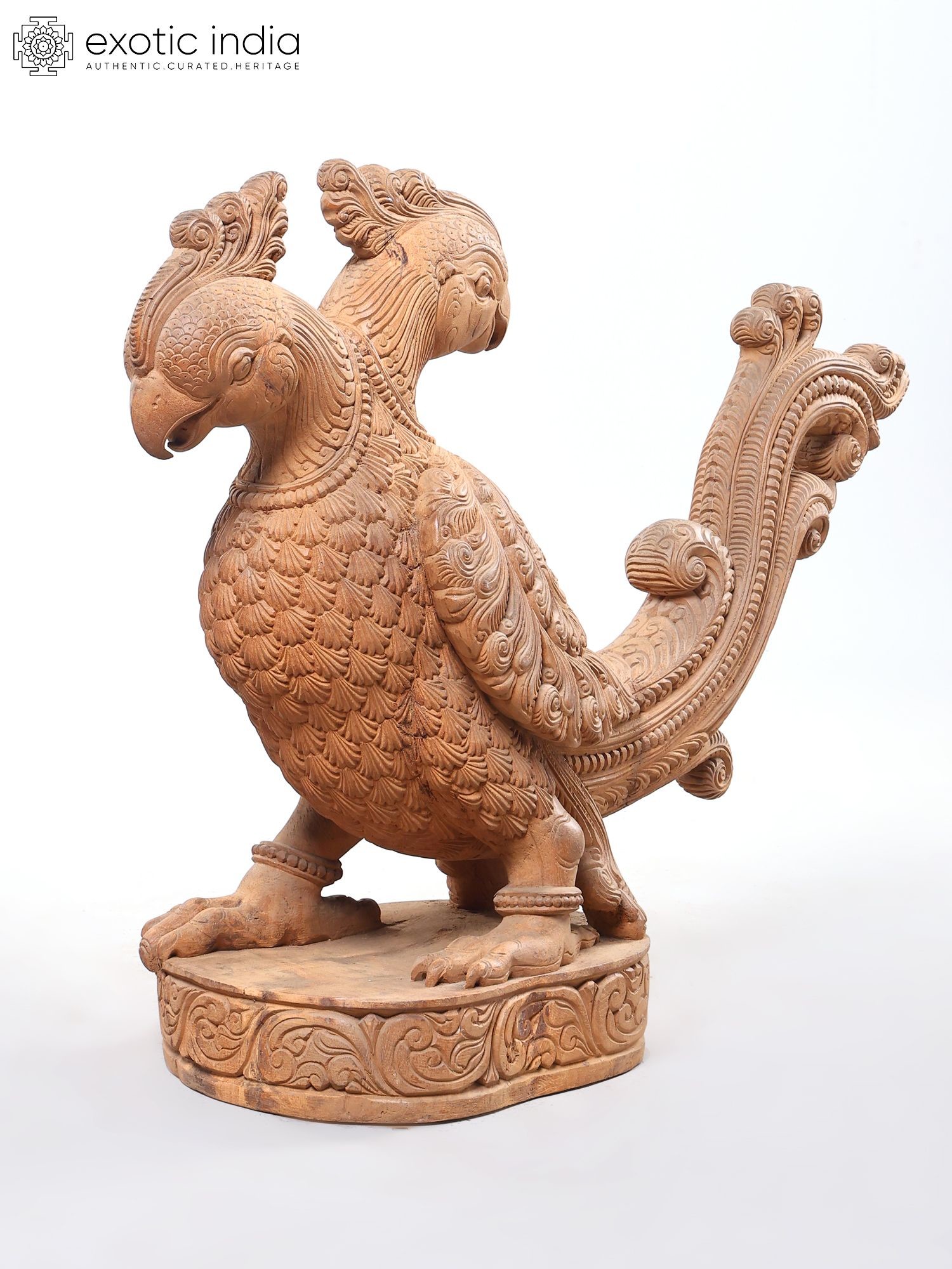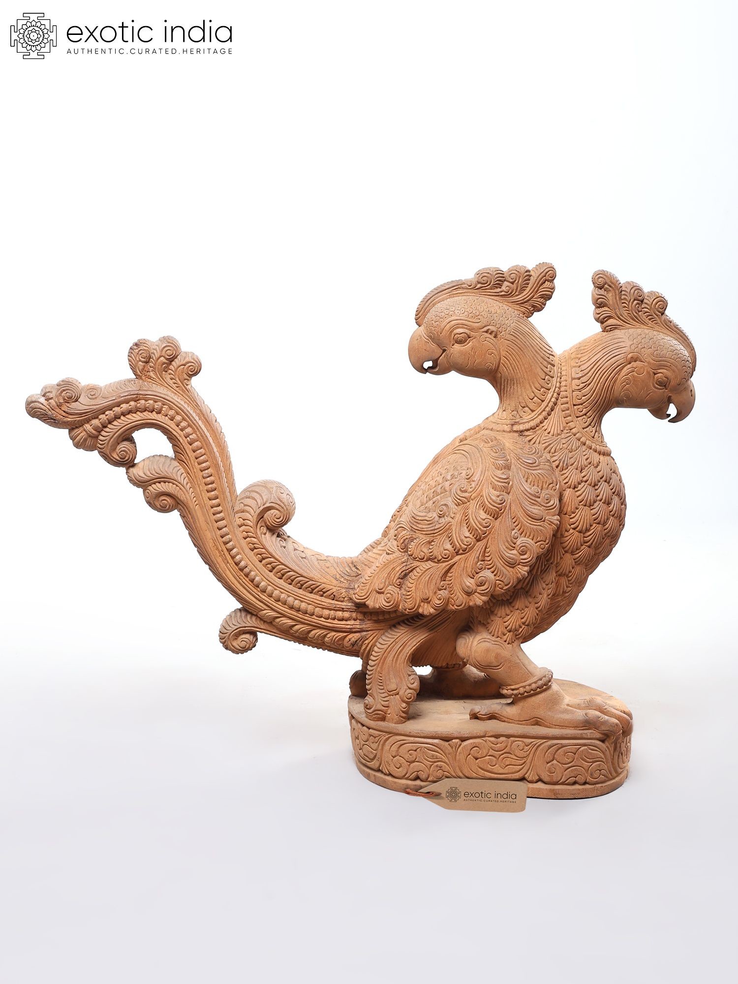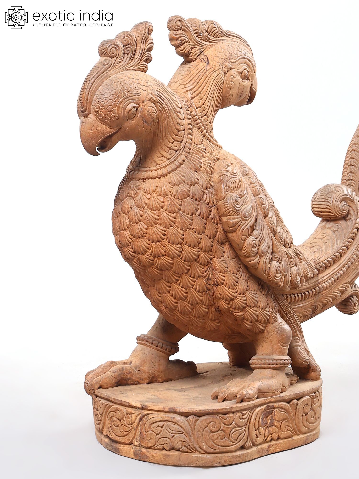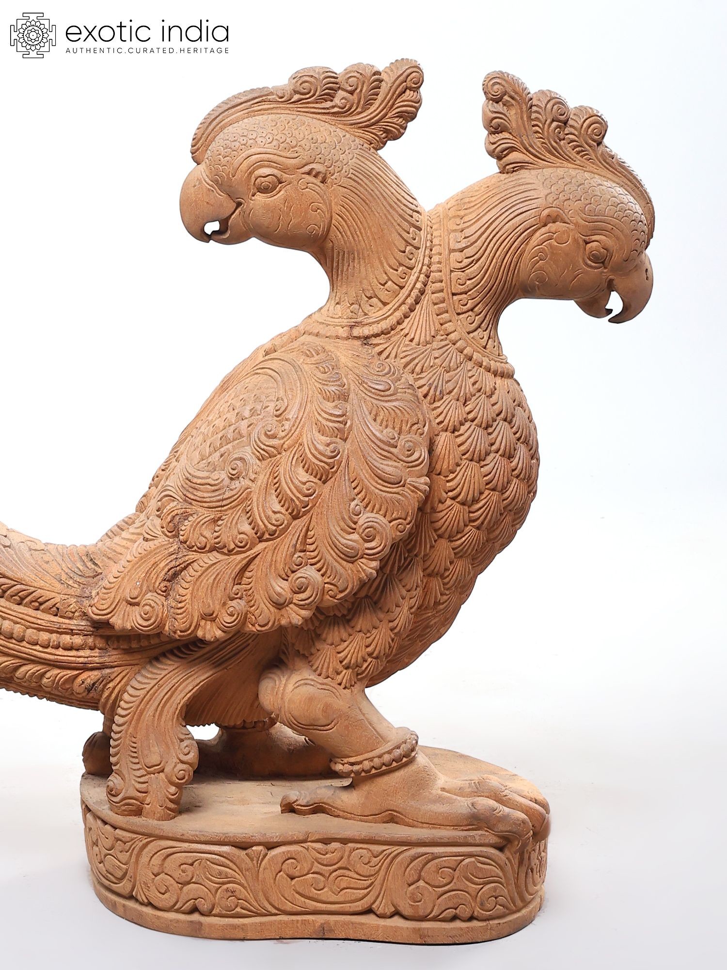 Showcases a striking two-headed parrot design, meticulously carved from wood.