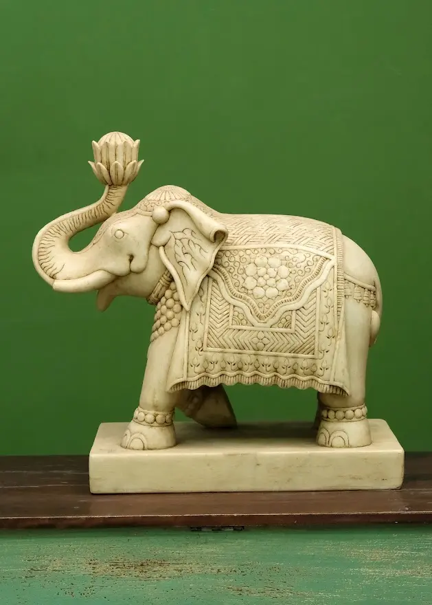 The Marble Elephant Showpiece (Pair) showcases the exquisite Jaipur carving style, exemplifying the rich artistic traditions of India. Each elephant in this magnificent pair is meticulously crafted, capturing intricate details and symbolism. With their trunks elegantly raised, the elephants hold delicate lotus flowers, symbolizing purity, enlightenment, and spiritual awakening. Adorning their legs are beautiful pearl anklets, adding a touch of regal charm and elegance. The backs of the elephants are adorned with intricately carved decorative pieces, showcasing the craftsmanship and attention to detail. The veins on the ears and trunks are prominently depicted, enhancing the lifelike appearance of the sculptures. The elevated trunk of the elephants holds great symbolism. In Indian culture, an elephant with an uplifted trunk represents good luck, prosperity, and wisdom. It is believed to bring positive energy and ward off obstacles, making it a popular symbol in homes and businesses. This showpiece is a testament to the skilled artisans who have brought forth the beauty and symbolism of these majestic creatures, offering an exquisite addition to any decor and a symbol of auspiciousness and grace.