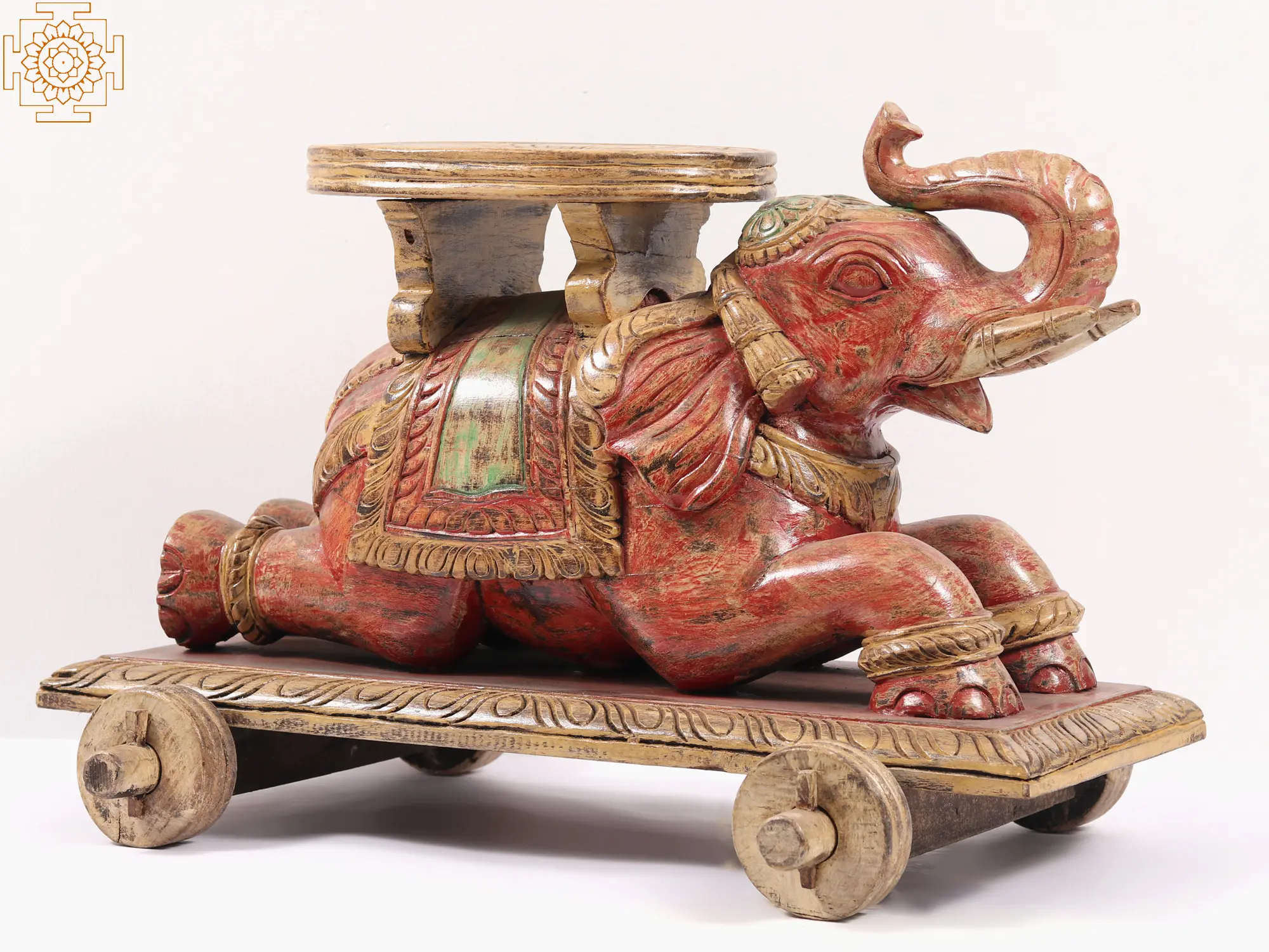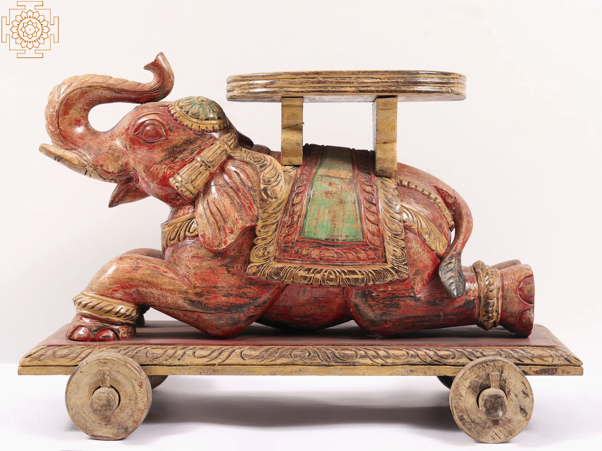 The unique design of an elephant, gracefully kneeling on the tray with wheels, is a testament to artistic ingenuity. The practical addition of wheels makes this piece not just aesthetically pleasing but also functional, allowing for easy mobility. The tray balanced on the elephant's back adds a touch of whimsy and creativity, making it a conversation starter and a true work of art. This Wooden Elephant Design Table with Wheels is more than furniture; it's a captivating statement piece that evokes nostalgia and commands attention in any space.