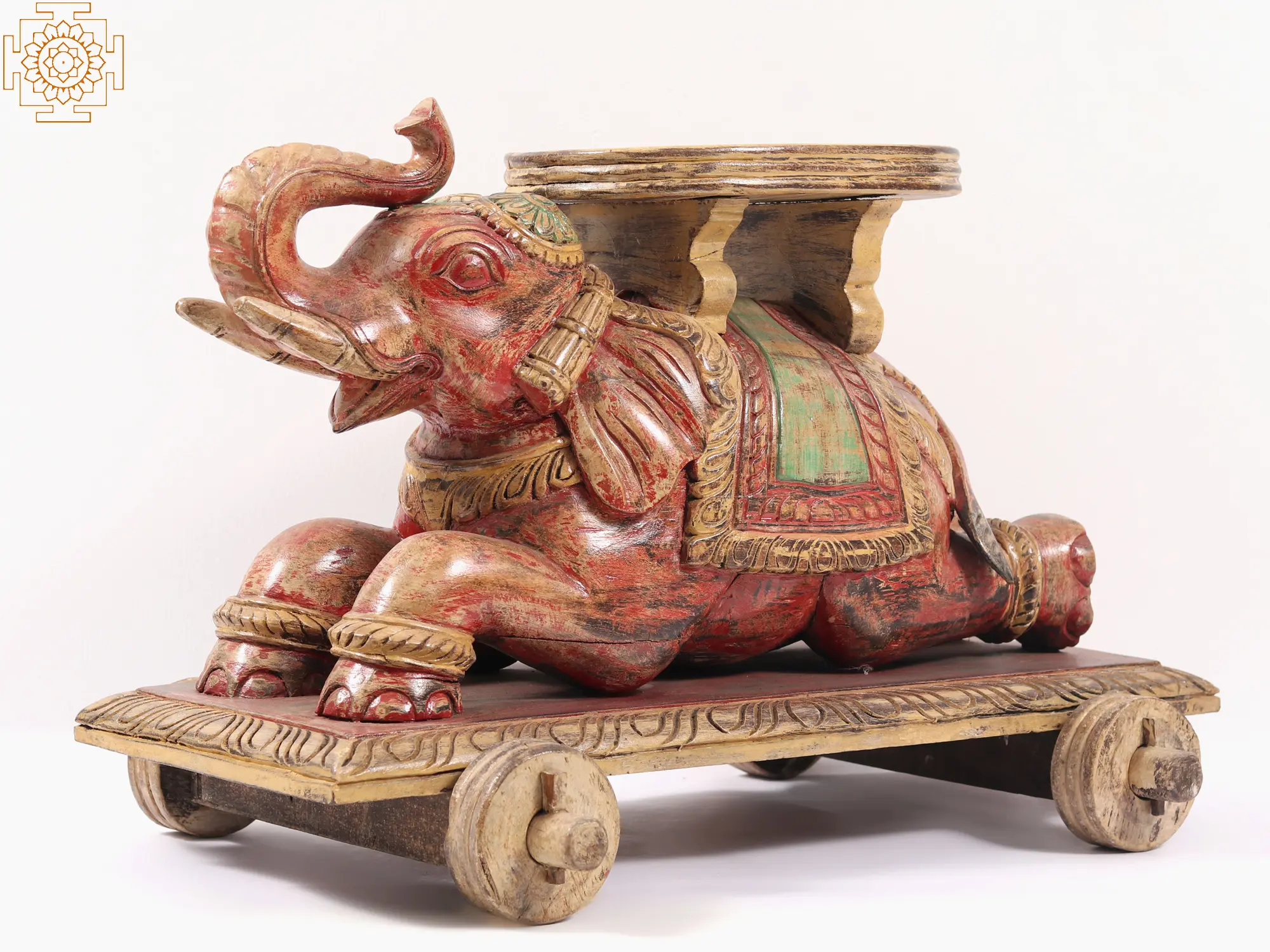 This Wooden Elephant Design Table with Wheels is a captivating piece that transports one to a bygone era, reminiscent of antique charm and craftsmanship. This furniture exudes a timeless appeal, best suited for homes with spacious interiors, where it can stand out as a focal point. The distressed paint on the wooden surface not only adds character but also enhances the vintage aesthetic, giving it an authentic, weathered look that tells a story of age and history.