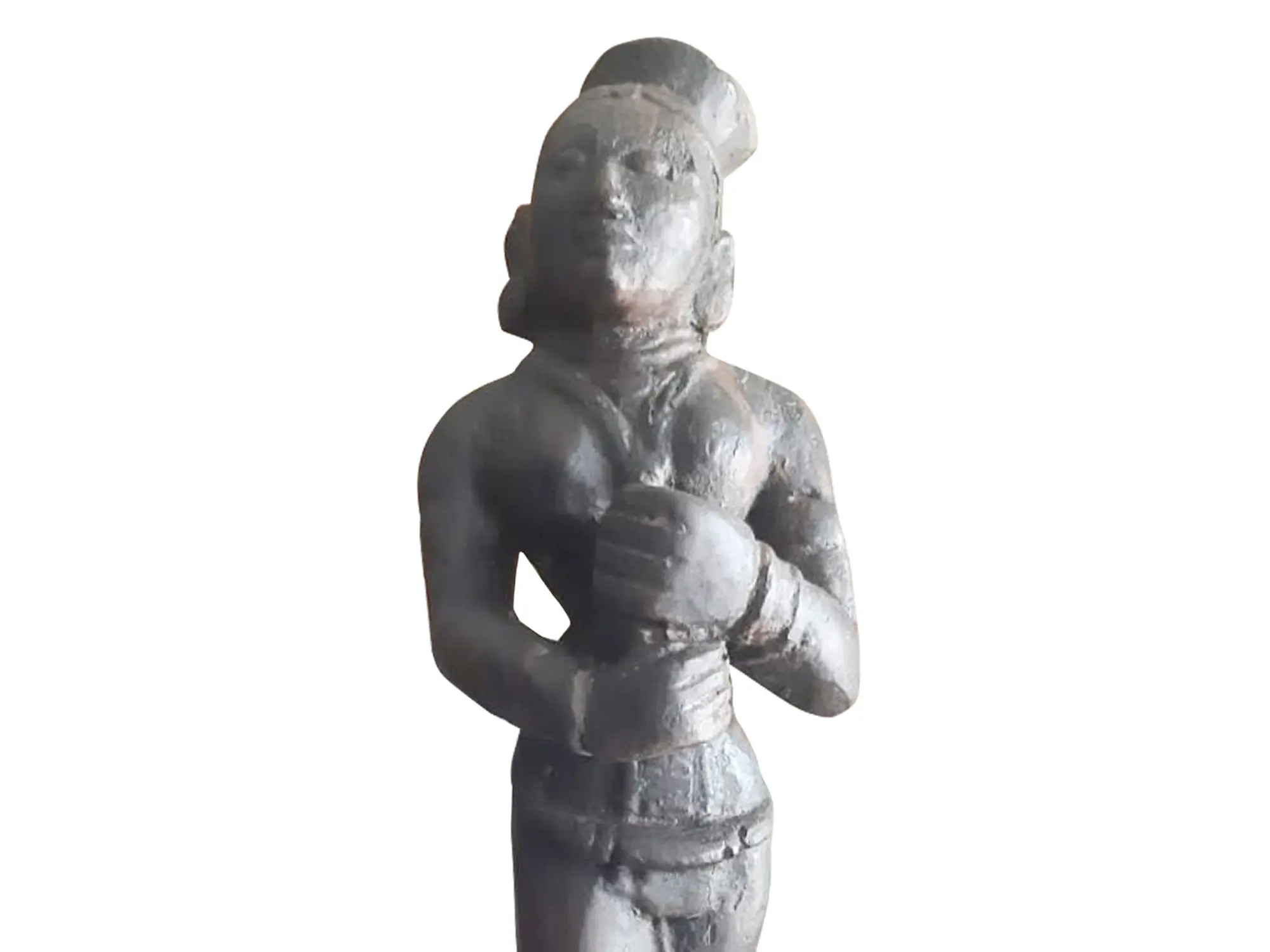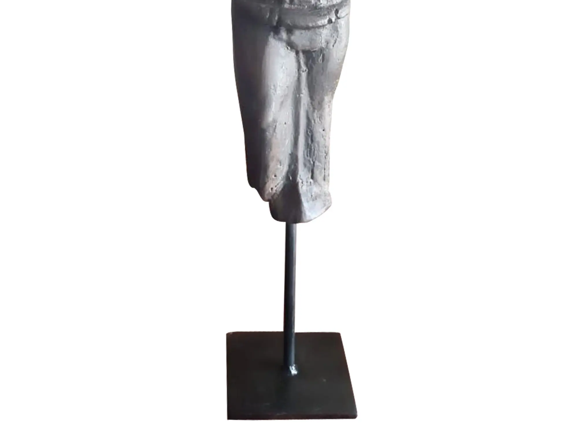 The figure is supported by an iron stand on which the woman seems to be standing with great poise. Dressed in simple garments, the woman holds her hands close to her chest, with hints of thoughtfulness on her face, as if meditating upon some idea.