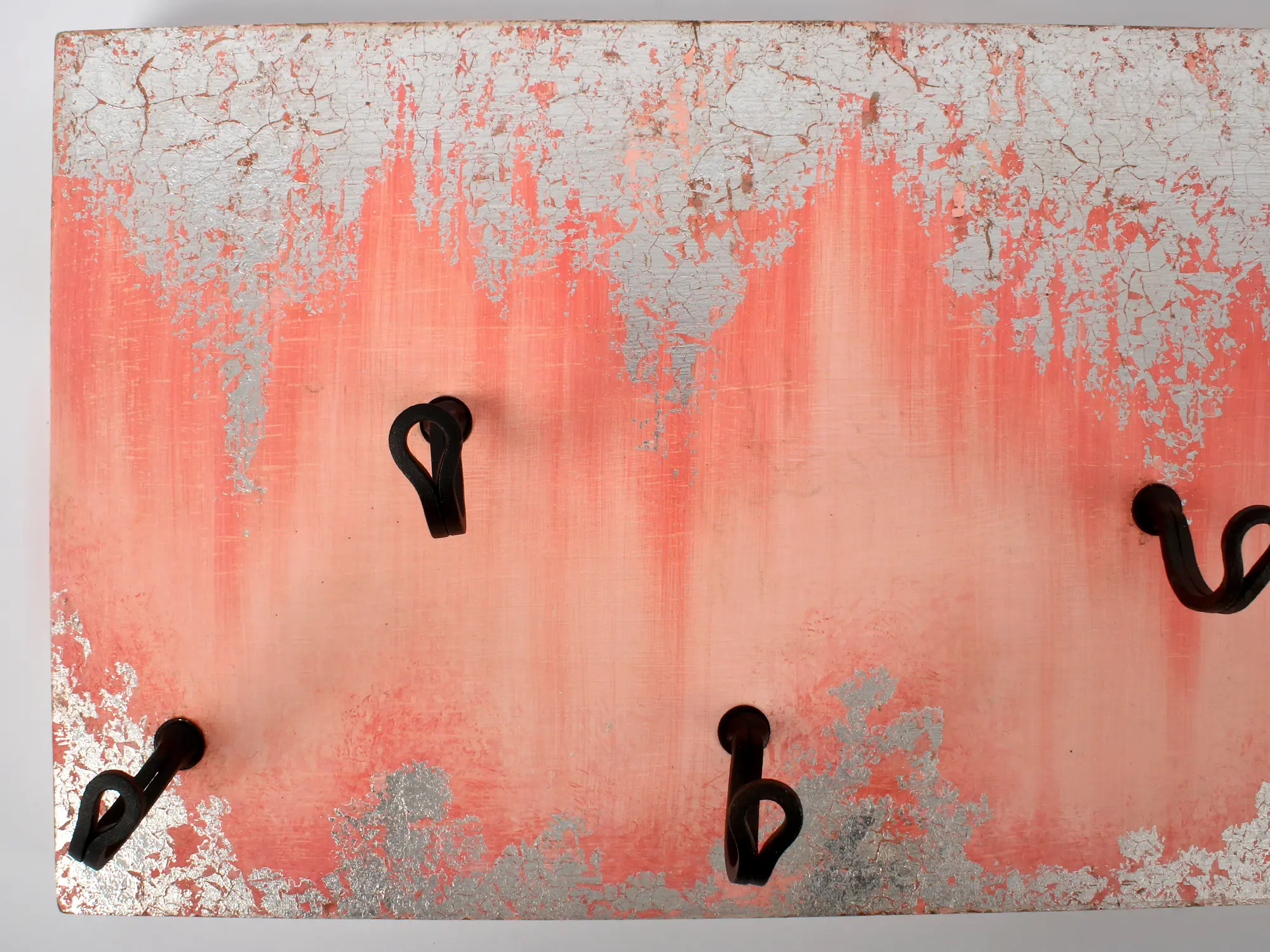 Elevate your home's organization and aesthetic with this beautifully crafted wall decor piece. Combining the natural warmth of wood with the sturdy resilience of iron, this piece offers both practical utility and striking visual appeal. The base is a solid piece of wood, artfully finished with a distressed effect that lends it a vintage, time-worn character. A vibrant coral hue washes across the surface, creating a warm and inviting backdrop. This primary color is dramatically offset by accents of shimmering silver that appear to be peeling or flaking away, revealing the underlying wood grain and adding a layer of depth and intrigue. This textured finish evokes a sense of rustic elegance, making it a perfect addition to spaces seeking a touch of lived-in charm.