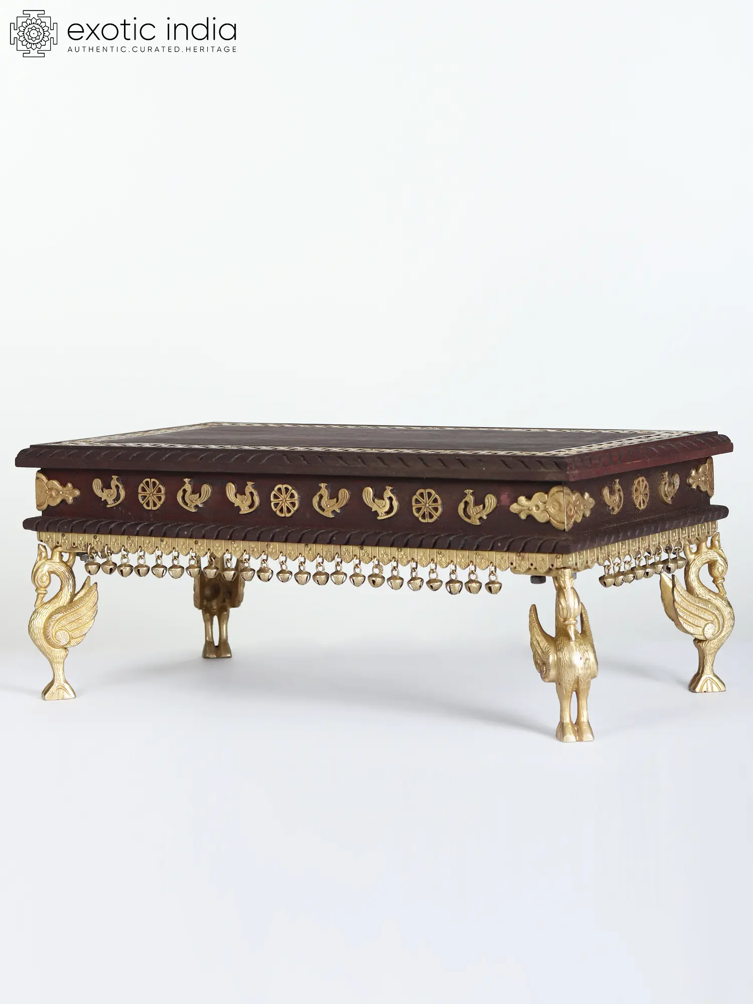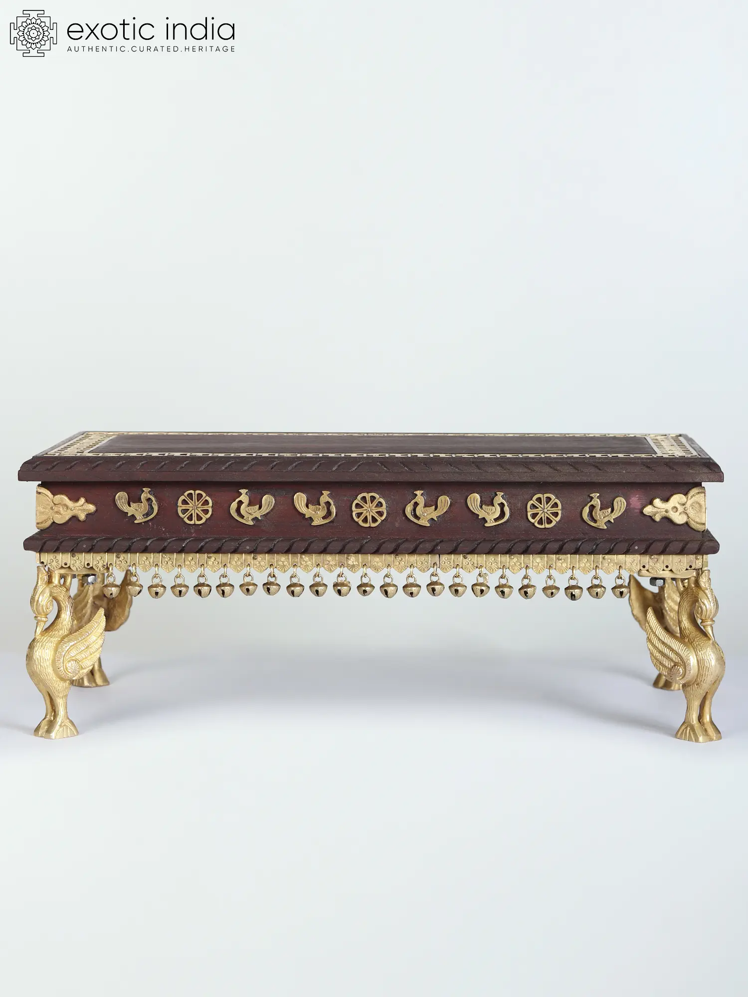 The use of annapakshi, or divine peacock, represents the heavenly benediction on the Bride and Groom. The pedestal is supported by exquisite brass legs and embellished with ghungroos. The pedestal's border features basic yet exquisite brass jaal work. The rectangular shape of the pedestal looks perfect for the seating of deities as it stays in the mind of the beholder as the most beautiful item they have ever come across.