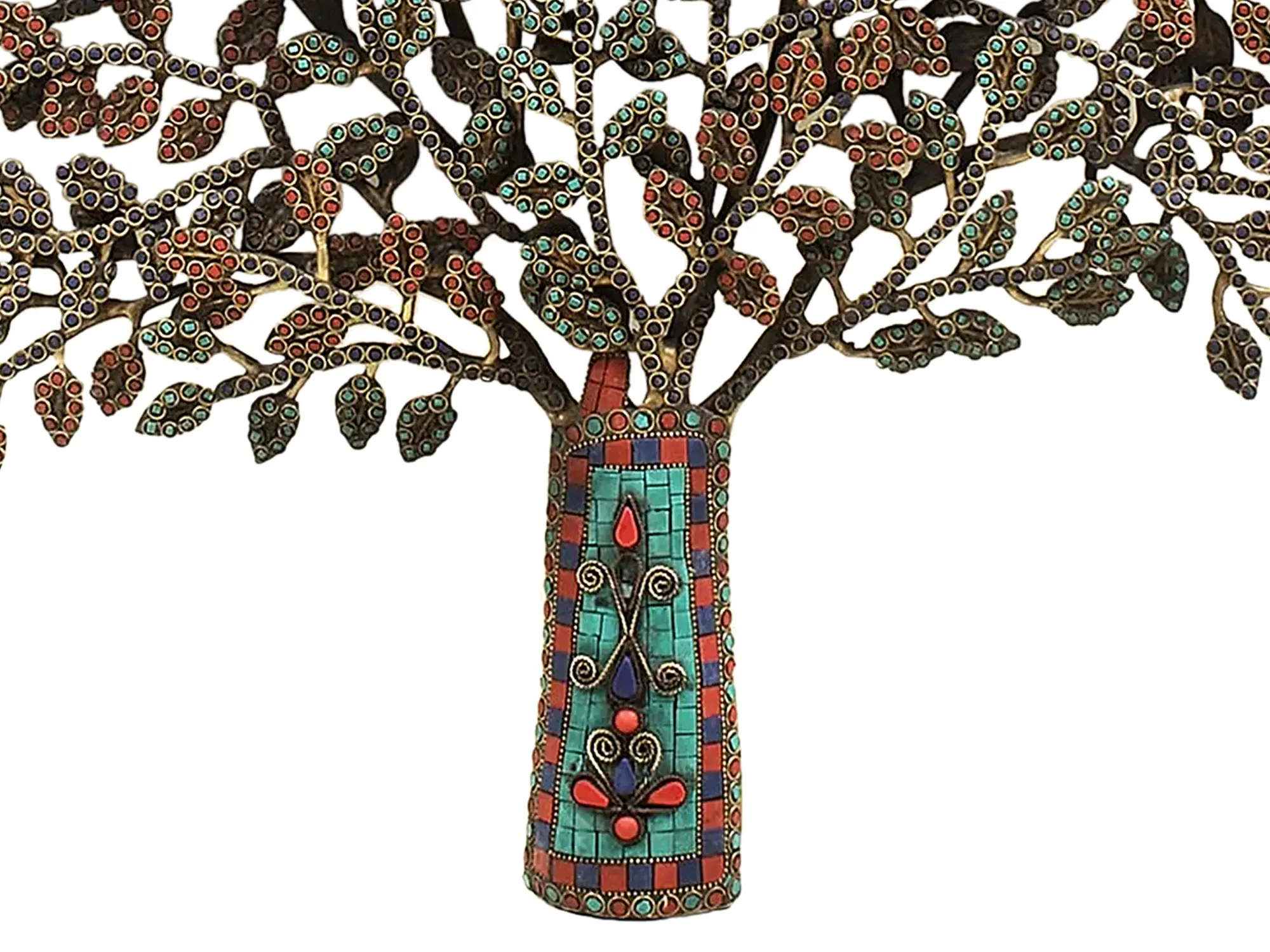 This brass tree of life with blue, green, and red inlay work is a magnificent representation of bright dreams that urges you to escape into a world of colour. The clever use of coloured minerals such as lapis lazuli, malachite, turquoise, and corals for the red, blue, and green parts creates a kaleidoscopic effect. The artist meticulously placed little round dots allowed with inlays to add more nuances to the pattern, making it one-of-a-kind. The tree's trunk is decorated with square columns of red and green inlay, constricted inside a border of blue and red inlay work. The body is further decorated with metal wire designs. This brass tree, designed to last centuries, is the expression of a colourful dream that will transmit the warmth of these colours across the world.